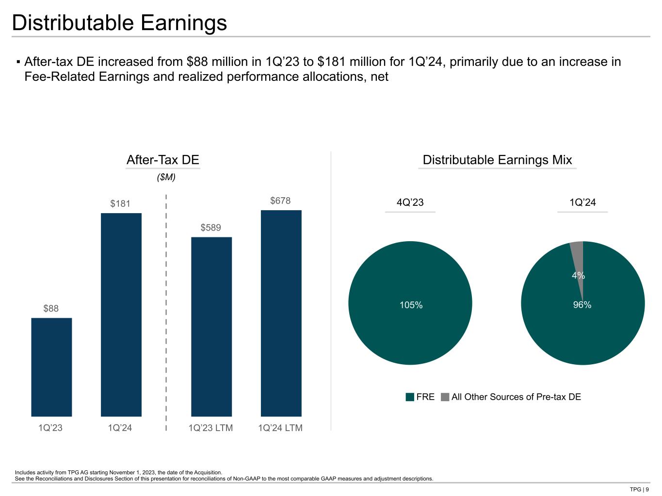 TPG | 8 $99 $182 1Q’23 1Q’24 $461 $689 1Q’23 LTM 1Q’24 LTM $975 $1,333 $408 $543 $145 $158$185 $203 $125 $86 $167 $143 $70 $76 1Q’23 LTM 1Q’24 LTM $248 $403 $106 $135 $37 $40$47 $48 $75 $52 $41 $34 $17 $19 1Q’23 1Q’24 ▪ 1Q’24 FRR increased 70% over 1Q’23, primarily driven by TPG AG, an increase in capital markets fees, and catch-up management fees ▪ Fee-Related Expenses in 1Q’24 increased 62% over 1Q’23, primarily due to the addition of TPG AG ▪ 1Q’24 FRE margin of 40%, an increase from 37% in 1Q’23; 1Q’24 LTM FRE margin of 45% Includes activity from TPG AG starting November 1, 2023, the date of the Acquisition. See the Reconciliations and Disclosures Section of this presentation for reconciliations of Non-GAAP to the most comparable GAAP measures and adjustment descriptions. 1. Catch-up management fees totaled $5 million and $19 million for 1Q’23 and 1Q’24, respectively. Fee-Related Earnings Management Fees by Platform(1) ($M) ($M) +62% Capital Growth Impact TPG AG Credit +37% TPG AG Real Estate Real Estate Market Solutions Fee-Related Earnings