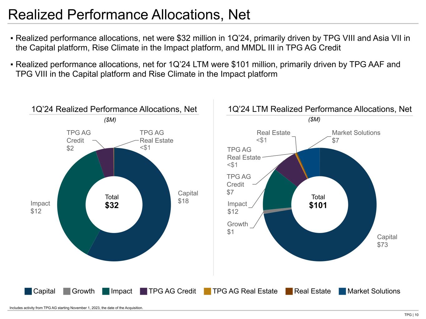 TPG | 9 $88 $181 1Q’23 1Q’24 $589 $678 1Q’23 LTM 1Q’24 LTM Distributable Earnings ▪ After-tax DE increased from $88 million in 1Q’23 to $181 million for 1Q’24, primarily due to an increase in Fee-Related Earnings and realized performance allocations, net After-Tax DE ($M) Includes activity from TPG AG starting November 1, 2023, the date of the Acquisition. See the Reconciliations and Disclosures Section of this presentation for reconciliations of Non-GAAP to the most comparable GAAP measures and adjustment descriptions. Distributable Earnings Mix FRE All Other Sources of Pre-tax DE 105% 96% 4% 4Q’23 1Q’24