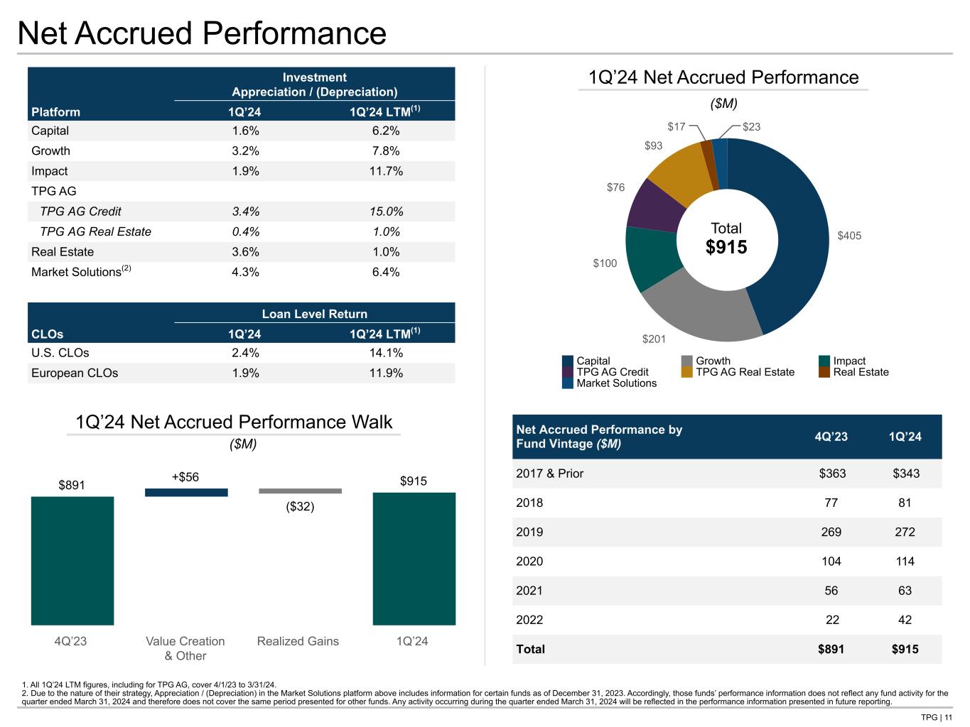 TPG | 10 Capital $73 Growth $1 Impact $12 TPG AG Credit $7 TPG AG Real Estate $— Real Estate $— Market Solutions $7 1Q’24 LTM Realized Performance Allocations, Net Capital $18Impact $12 TPG AG Credit $2 TPG AG Real Estate $— ▪ Realized performance allocations, net were $32 million in 1Q’24, primarily driven by TPG VIII and Asia VII in the Capital platform, Rise Climate in the Impact platform, and MMDL III in TPG AG Credit ▪ Realized performance allocations, net for 1Q’24 LTM were $101 million, primarily driven by TPG AAF and TPG VIII in the Capital platform and Rise Climate in the Impact platform Realized Performance Allocations, Net 1Q’24 Realized Performance Allocations, Net ($M) ($M) Total $101 Total $32 Capital Growth Impact TPG AG Credit TPG AG Real Estate Real Estate Market Solutions <$1 <$1 Includes activity from TPG AG starting November 1, 2023, the date of the Acquisition. <$1