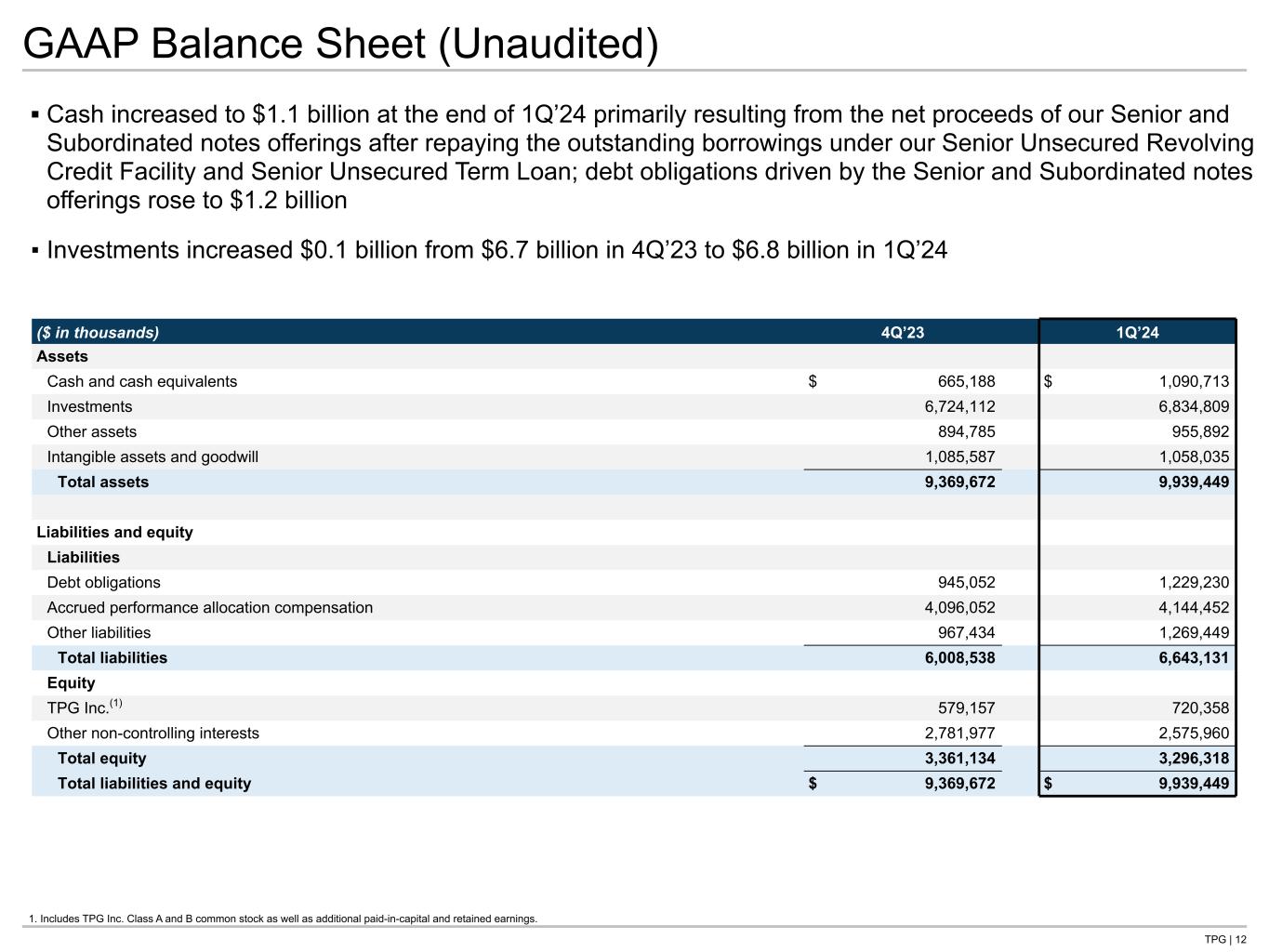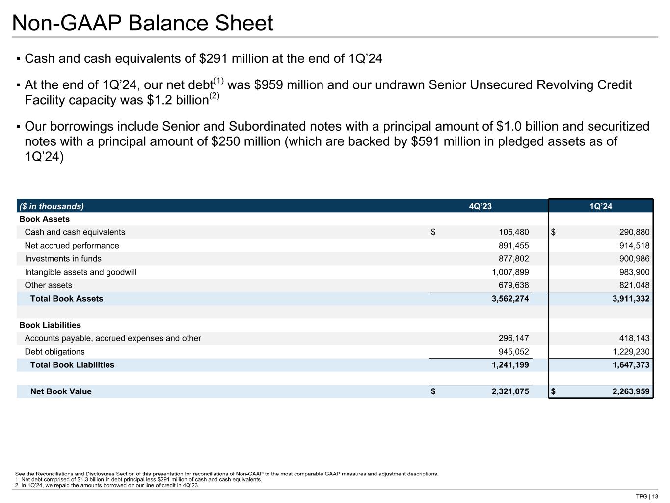 TPG | 12 GAAP Balance Sheet (Unaudited) ▪ Cash increased to $1.1 billion at the end of 1Q’24 primarily resulting from the net proceeds of our Senior and Subordinated notes offerings after repaying the outstanding borrowings under our Senior Unsecured Revolving Credit Facility and Senior Unsecured Term Loan; debt obligations driven by the Senior and Subordinated notes offerings rose to $1.2 billion ▪ Investments increased $0.1 billion from $6.7 billion in 4Q’23 to $6.8 billion in 1Q’24 1. Includes TPG Inc. Class A and B common stock as well as additional paid-in-capital and retained earnings. ($ in thousands) 4Q’23 1Q’24 Assets Cash and cash equivalents $ 665,188 $ 1,090,713 Investments 6,724,112 6,834,809 Other assets 894,785 955,892 Intangible assets and goodwill 1,085,587 1,058,035 Total assets 9,369,672 9,939,449 Liabilities and equity Liabilities Debt obligations 945,052 1,229,230 Accrued performance allocation compensation 4,096,052 4,144,452 Other liabilities 967,434 1,269,449 Total liabilities 6,008,538 6,643,131 Equity TPG Inc.(1) 579,157 720,358 Other non-controlling interests 2,781,977 2,575,960 Total equity 3,361,134 3,296,318 Total liabilities and equity $ 9,369,672 $ 9,939,449