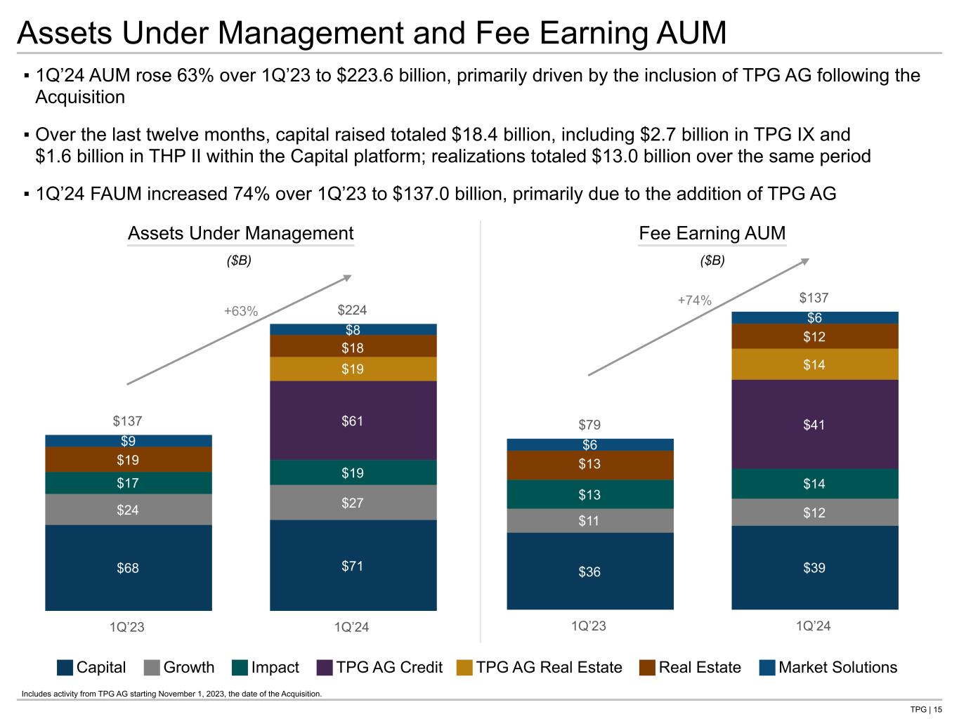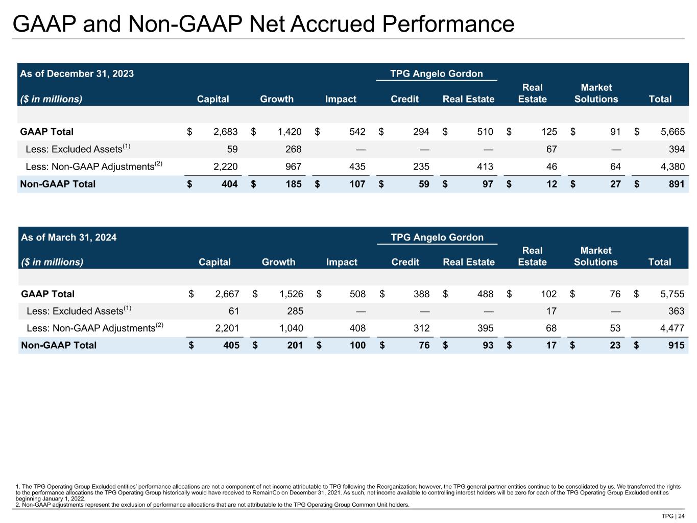 TPG | 23 GAAP and Non-GAAP Performance Allocations Includes activity from TPG AG starting November 1, 2023, the date of the Acquisition. 1. Includes certain TPG Operating Group Excluded entities whose performance allocations are not a component of net income attributable to TPG following the Reorganization; however, the TPG general partner entities continue to be consolidated by us. We transferred the rights to the performance allocations the TPG Operating Group historically would have received to RemainCo on December 31, 2021. As such, net income available to controlling interest holders will be zero for each of the TPG Operating Group Excluded entities beginning January 1, 2022. 2. Non-GAAP adjustments represent the exclusion of performance allocations that are not attributable to the TPG Operating Group Common Unit holders. Three Months Ended March 31, 2024 GAAP Less: GAAP GAAP Less: Non-GAAP Non-GAAP ($ in thousands) Total(1) Unrealized Realized Adjustments(2) Realized Capital $ 70,574 $ (16,331) $ 86,905 $ 68,632 $ 18,273 Growth 106,621 106,621 — — — Impact 20,729 (34,315) 55,044 43,426 11,618 TPG AG TPG AG Credit 101,728 94,776 6,952 5,336 1,616 TPG AG Real Estate (21,901) (22,126) 225 180 45 Real Estate 26,892 (22,787) 49,679 49,679 — Market Solutions (15,000) (15,000) — — — Total $ 289,643 $ 90,838 $ 198,805 $ 167,253 $ 31,552 Last Twelve Months Ended March 31, 2024 GAAP Less: GAAP GAAP Less: Non-GAAP Non-GAAP ($ in thousands) Total(1) Unrealized Realized Adjustments(2) Realized Capital $ 275,666 $ (80,130) $ 355,796 $ 283,010 $ 72,786 Growth 184,047 145,927 38,120 37,078 1,042 Impact 158,124 99,846 58,278 45,977 12,301 TPG AG TPG AG Credit 241,093 150,904 90,189 83,021 7,168 TPG AG Real Estate (33,939) (36,038) 2,099 1,665 434 Real Estate (38,198) (89,195) 50,997 50,733 264 Market Solutions (4,609) (37,407) 32,798 26,239 6,559 Total $ 782,184 $ 153,907 $ 628,277 $ 527,723 $ 100,554