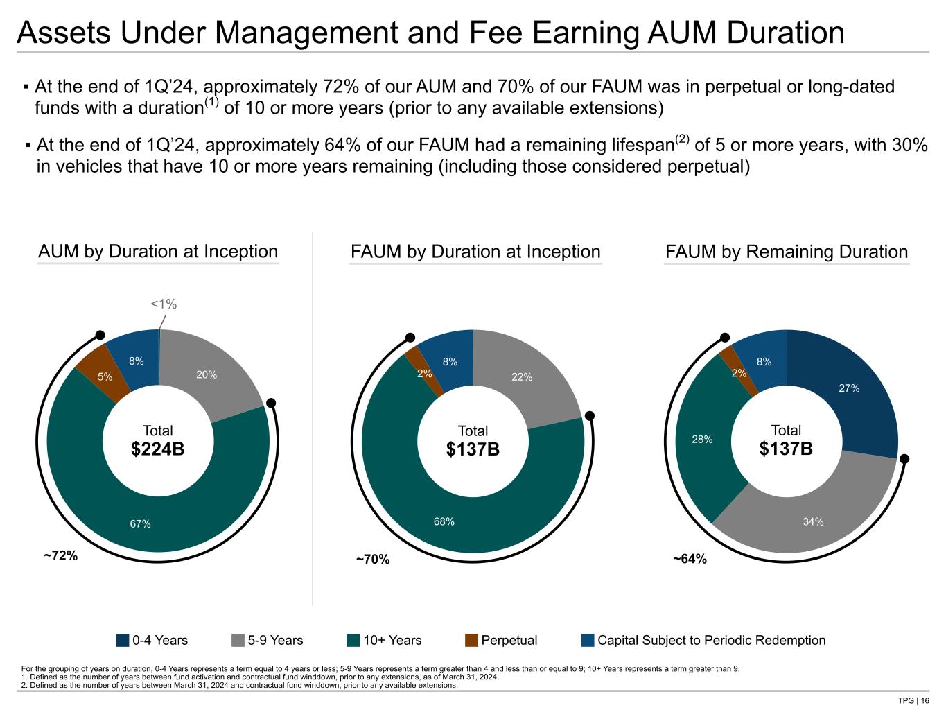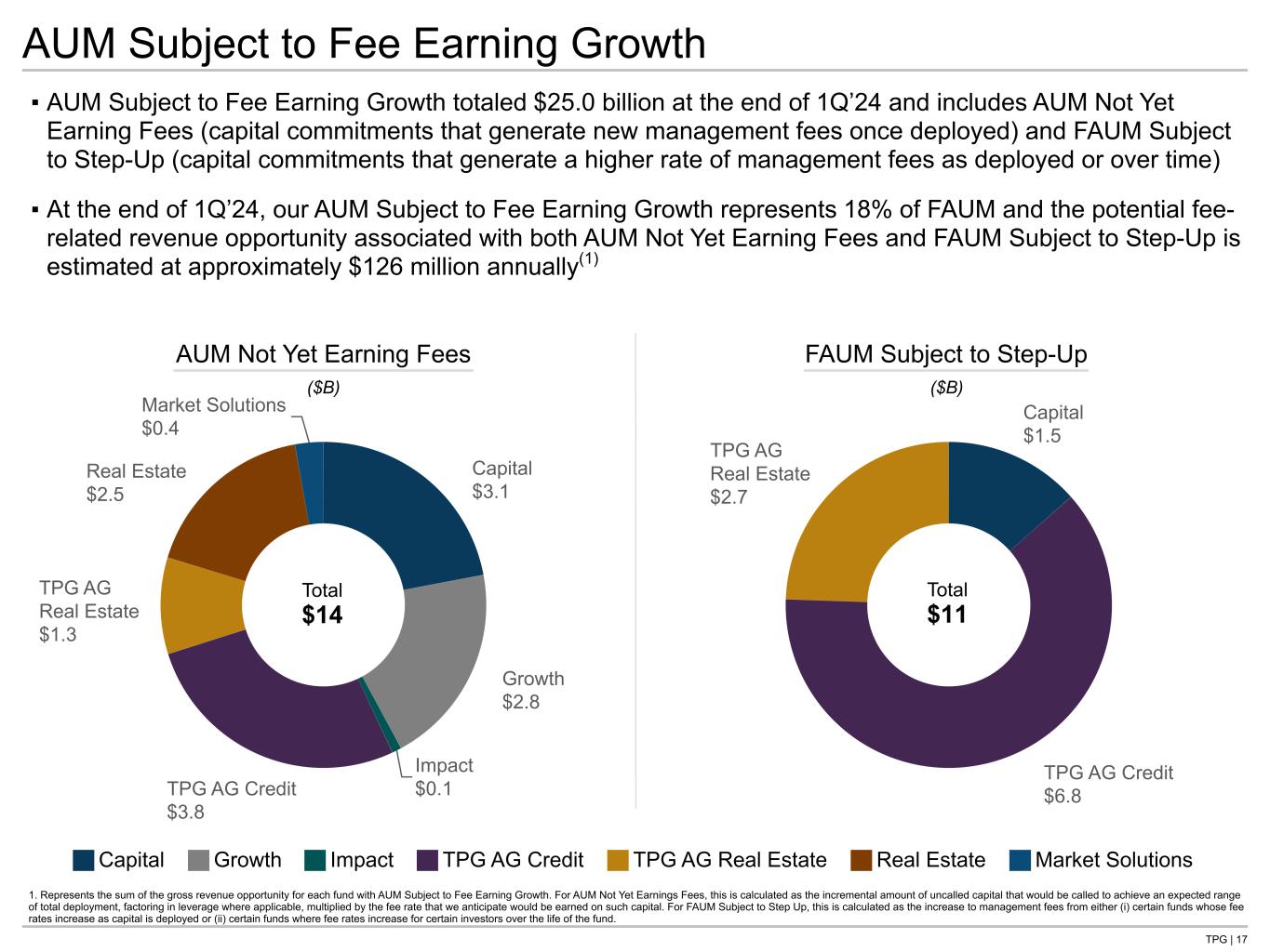 TPG | 16 27% 34% 28% 2% 8% —% 20% 67% 5% 8% 22% 68% 2% 8% FAUM by Remaining Duration Assets Under Management and Fee Earning AUM Duration AUM by Duration at Inception For the grouping of years on duration, 0-4 Years represents a term equal to 4 years or less; 5-9 Years represents a term greater than 4 and less than or equal to 9; 10+ Years represents a term greater than 9. 1. Defined as the number of years between fund activation and contractual fund winddown, prior to any extensions, as of March 31, 2024. 2. Defined as the number of years between March 31, 2024 and contractual fund winddown, prior to any available extensions. ▪ At the end of 1Q’24, approximately 72% of our AUM and 70% of our FAUM was in perpetual or long-dated funds with a duration(1) of 10 or more years (prior to any available extensions) ▪ At the end of 1Q’24, approximately 64% of our FAUM had a remaining lifespan(2) of 5 or more years, with 30% in vehicles that have 10 or more years remaining (including those considered perpetual) Total $224B Total $137B FAUM by Duration at Inception Total $137B ~70% ~64%~72% 0-4 Years 5-9 Years 10+ Years Perpetual Capital Subject to Periodic Redemption <1