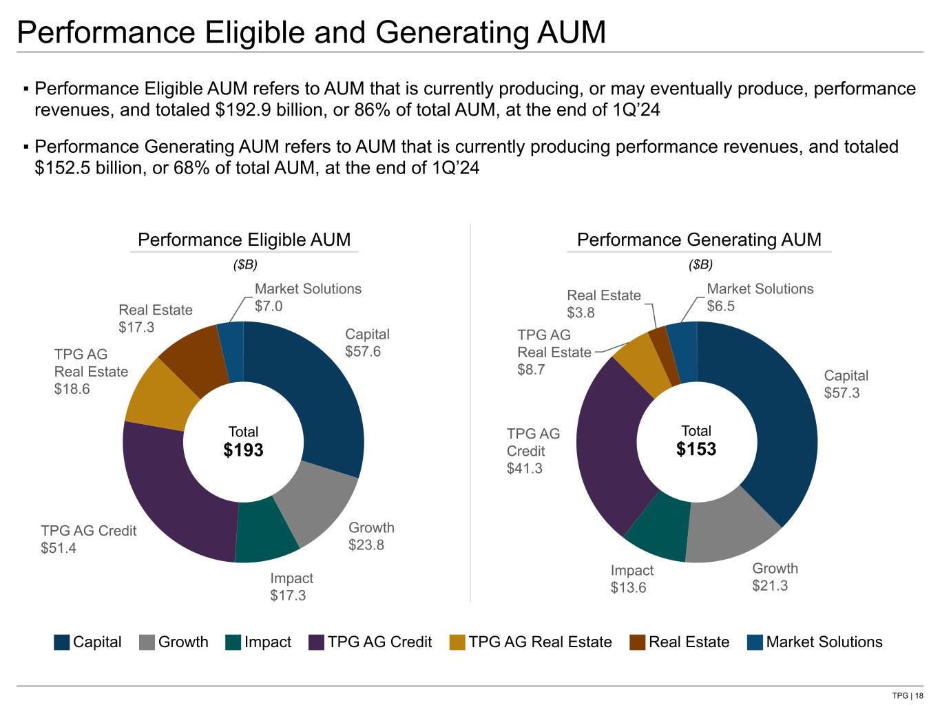 TPG | 17 Capital $1.5 TPG AG Credit $6.8 TPG AG Real Estate $2.7 Capital $3.1 Growth $2.8 Impact $0.1TPG AG Credit $3.8 TPG AG Real Estate $1.3 Real Estate $2.5 Market Solutions $0.4 ▪ AUM Subject to Fee Earning Growth totaled $25.0 billion at the end of 1Q’24 and includes AUM Not Yet Earning Fees (capital commitments that generate new management fees once deployed) and FAUM Subject to Step-Up (capital commitments that generate a higher rate of management fees as deployed or over time) ▪ At the end of 1Q’24, our AUM Subject to Fee Earning Growth represents 18% of FAUM and the potential fee- related revenue opportunity associated with both AUM Not Yet Earning Fees and FAUM Subject to Step-Up is estimated at approximately $126 million annually(1) AUM Not Yet Earning Fees FAUM Subject to Step-Up ($B) ($B) Total $14 Total $11 AUM Subject to Fee Earning Growth 1. Represents the sum of the gross revenue opportunity for each fund with AUM Subject to Fee Earning Growth. For AUM Not Yet Earnings Fees, this is calculated as the incremental amount of uncalled capital that would be called to achieve an expected range of total deployment, factoring in leverage where applicable, multiplied by the fee rate that we anticipate would be earned on such capital. For FAUM Subject to Step Up, this is calculated as the increase to management fees from either (i) certain funds whose fee rates increase as capital is deployed or (ii) certain funds where fee rates increase for certain investors over the life of the fund. Capital Growth Impact TPG AG Credit TPG AG Real Estate Real Estate Market Solutions