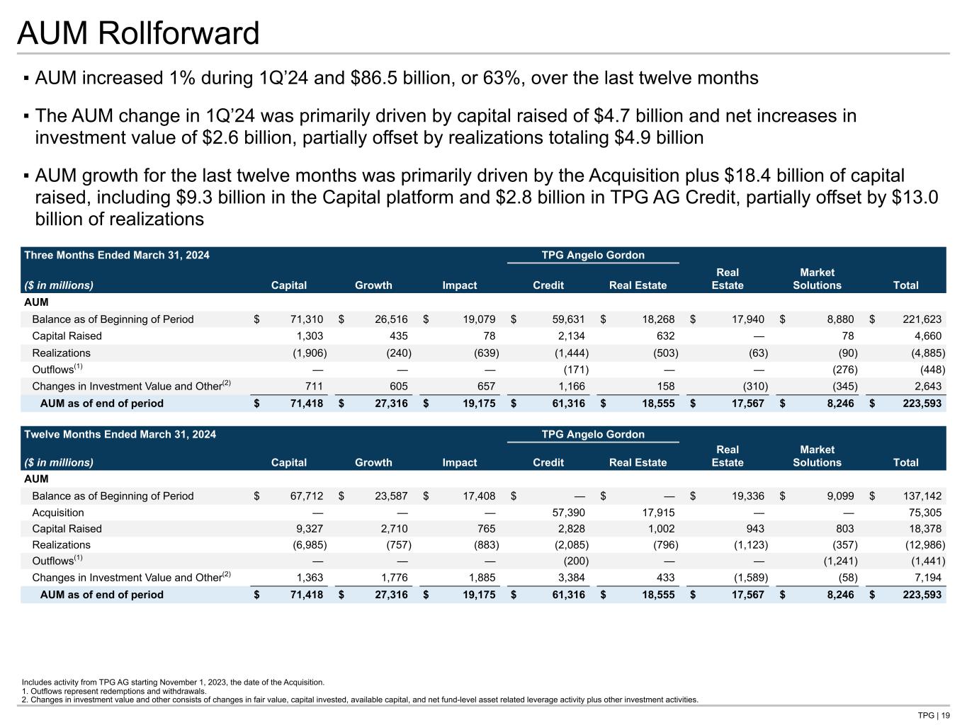 TPG | 18 Capital $57.3 Growth $21.3 Impact $13.6 TPG AG Credit $41.3 TPG AG Real Estate $8.7 Real Estate $3.8 Market Solutions $6.5 Capital $57.6 Growth $23.8 Impact $17.3 TPG AG Credit $51.4 TPG AG Real Estate $18.6 Real Estate $17.3 Market Solutions $7.0 ▪ Performance Eligible AUM refers to AUM that is currently producing, or may eventually produce, performance revenues, and totaled $192.9 billion, or 86% of total AUM, at the end of 1Q’24 ▪ Performance Generating AUM refers to AUM that is currently producing performance revenues, and totaled $152.5 billion, or 68% of total AUM, at the end of 1Q’24 Performance Eligible AUM Performance Generating AUM ($B) ($B) Total $193 Total $153 Performance Eligible and Generating AUM Capital Growth Impact TPG AG Credit TPG AG Real Estate Real Estate Market Solutions