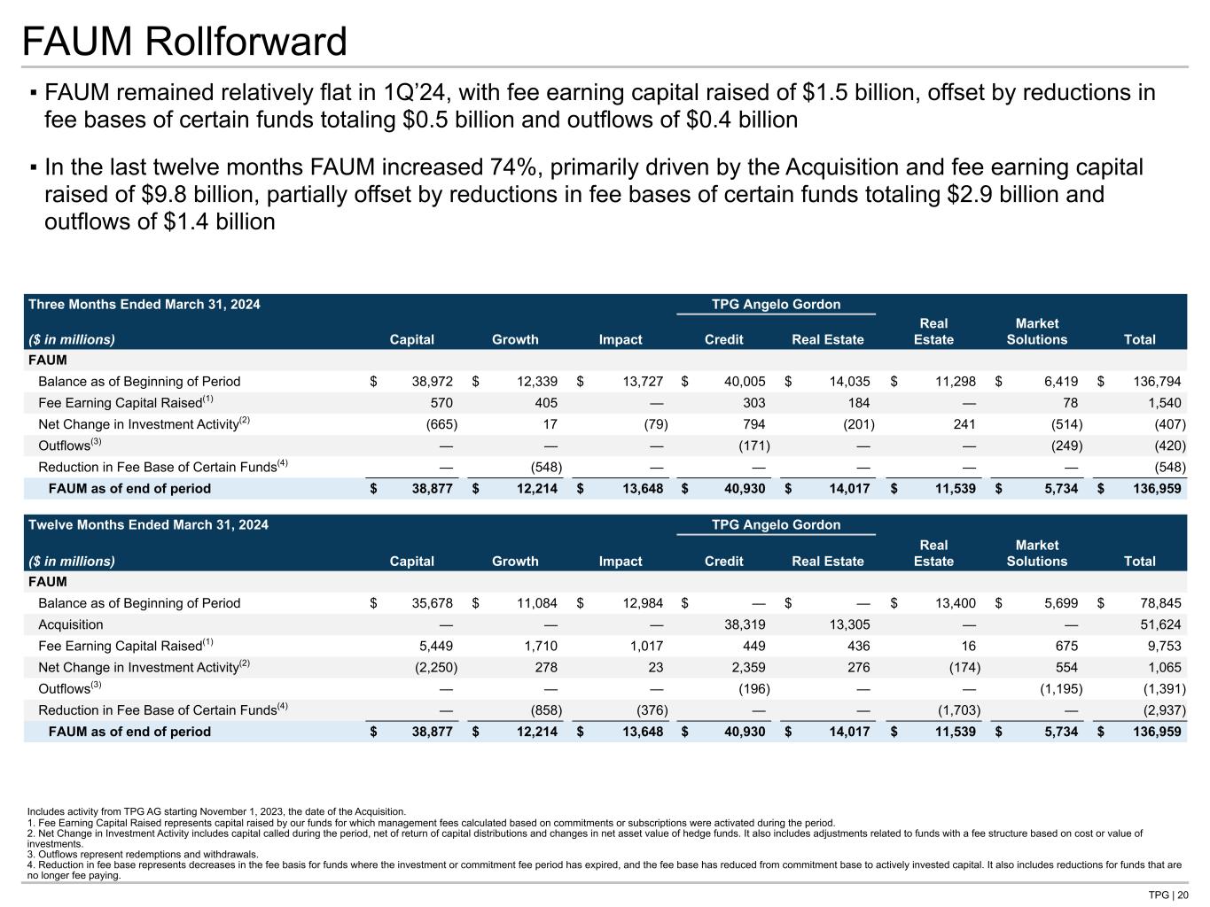 TPG | 19 AUM Rollforward Includes activity from TPG AG starting November 1, 2023, the date of the Acquisition. 1. Outflows represent redemptions and withdrawals. 2. Changes in investment value and other consists of changes in fair value, capital invested, available capital, and net fund-level asset related leverage activity plus other investment activities. ▪ AUM increased 1% during 1Q’24 and $86.5 billion, or 63%, over the last twelve months ▪ The AUM change in 1Q’24 was primarily driven by capital raised of $4.7 billion and net increases in investment value of $2.6 billion, partially offset by realizations totaling $4.9 billion ▪ AUM growth for the last twelve months was primarily driven by the Acquisition plus $18.4 billion of capital raised, including $9.3 billion in the Capital platform and $2.8 billion in TPG AG Credit, partially offset by $13.0 billion of realizations Three Months Ended March 31, 2024 TPG Angelo Gordon ($ in millions) Capital Growth Impact Credit Real Estate Real Estate Market Solutions Total AUM Balance as of Beginning of Period $ 71,310 $ 26,516 $ 19,079 $ 59,631 $ 18,268 $ 17,940 $ 8,880 $ 221,623 Capital Raised 1,303 435 78 2,134 632 — 78 4,660 Realizations (1,906) (240) (639) (1,444) (503) (63) (90) (4,885) Outflows(1) — — — (171) — — (276) (448) Changes in Investment Value and Other(2) 711 605 657 1,166 158 (310) (345) 2,643 AUM as of end of period $ 71,418 $ 27,316 $ 19,175 $ 61,316 $ 18,555 $ 17,567 $ 8,246 $ 223,593 Twelve Months Ended March 31, 2024 TPG Angelo Gordon ($ in millions) Capital Growth Impact Credit Real Estate Real Estate Market Solutions Total AUM Balance as of Beginning of Period $ 67,712 $ 23,587 $ 17,408 $ — $ — $ 19,336 $ 9,099 $ 137,142 Acquisition — — — 57,390 17,915 — — 75,305 Capital Raised 9,327 2,710 765 2,828 1,002 943 803 18,378 Realizations (6,985) (757) (883) (2,085) (796) (1,123) (357) (12,986) Outflows(1) — — — (200) — — (1,241) (1,441) Changes in Investment Value and Other(2) 1,363 1,776 1,885 3,384 433 (1,589) (58) 7,194 AUM as of end of period $ 71,418 $ 27,316 $ 19,175 $ 61,316 $ 18,555 $ 17,567 $ 8,246 $ 223,593