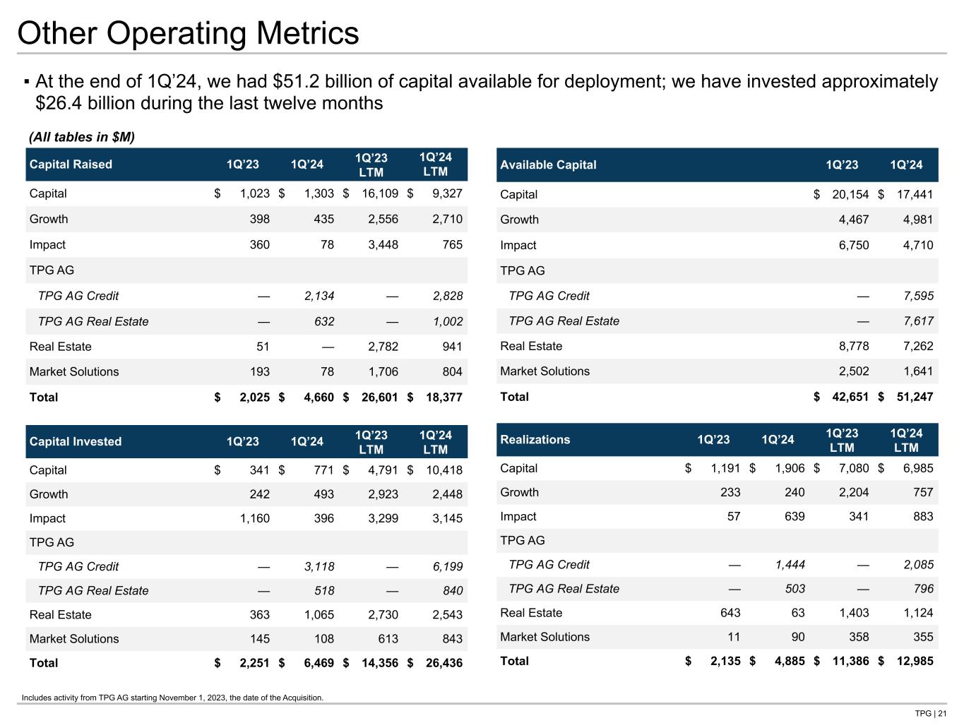 TPG | 20 FAUM Rollforward Includes activity from TPG AG starting November 1, 2023, the date of the Acquisition. 1. Fee Earning Capital Raised represents capital raised by our funds for which management fees calculated based on commitments or subscriptions were activated during the period. 2. Net Change in Investment Activity includes capital called during the period, net of return of capital distributions and changes in net asset value of hedge funds. It also includes adjustments related to funds with a fee structure based on cost or value of investments. 3. Outflows represent redemptions and withdrawals. 4. Reduction in fee base represents decreases in the fee basis for funds where the investment or commitment fee period has expired, and the fee base has reduced from commitment base to actively invested capital. It also includes reductions for funds that are no longer fee paying. ▪ FAUM remained relatively flat in 1Q’24, with fee earning capital raised of $1.5 billion, offset by reductions in fee bases of certain funds totaling $0.5 billion and outflows of $0.4 billion ▪ In the last twelve months FAUM increased 74%, primarily driven by the Acquisition and fee earning capital raised of $9.8 billion, partially offset by reductions in fee bases of certain funds totaling $2.9 billion and outflows of $1.4 billion Three Months Ended March 31, 2024 TPG Angelo Gordon ($ in millions) Capital Growth Impact Credit Real Estate Real Estate Market Solutions Total FAUM Balance as of Beginning of Period $ 38,972 $ 12,339 $ 13,727 $ 40,005 $ 14,035 $ 11,298 $ 6,419 $ 136,794 Fee Earning Capital Raised(1) 570 405 — 303 184 — 78 1,540 Net Change in Investment Activity(2) (665) 17 (79) 794 (201) 241 (514) (407) Outflows(3) — — — (171) — — (249) (420) Reduction in Fee Base of Certain Funds(4) — (548) — — — — — (548) FAUM as of end of period $ 38,877 $ 12,214 $ 13,648 $ 40,930 $ 14,017 $ 11,539 $ 5,734 $ 136,959 Twelve Months Ended March 31, 2024 TPG Angelo Gordon ($ in millions) Capital Growth Impact Credit Real Estate Real Estate Market Solutions Total FAUM Balance as of Beginning of Period $ 35,678 $ 11,084 $ 12,984 $ — $ — $ 13,400 $ 5,699 $ 78,845 Acquisition — — — 38,319 13,305 — — 51,624 Fee Earning Capital Raised(1) 5,449 1,710 1,017 449 436 16 675 9,753 Net Change in Investment Activity(2) (2,250) 278 23 2,359 276 (174) 554 1,065 Outflows(3) — — — (196) — — (1,195) (1,391) Reduction in Fee Base of Certain Funds(4) — (858) (376) — — (1,703) — (2,937) FAUM as of end of period $ 38,877 $ 12,214 $ 13,648 $ 40,930 $ 14,017 $ 11,539 $ 5,734 $ 136,959