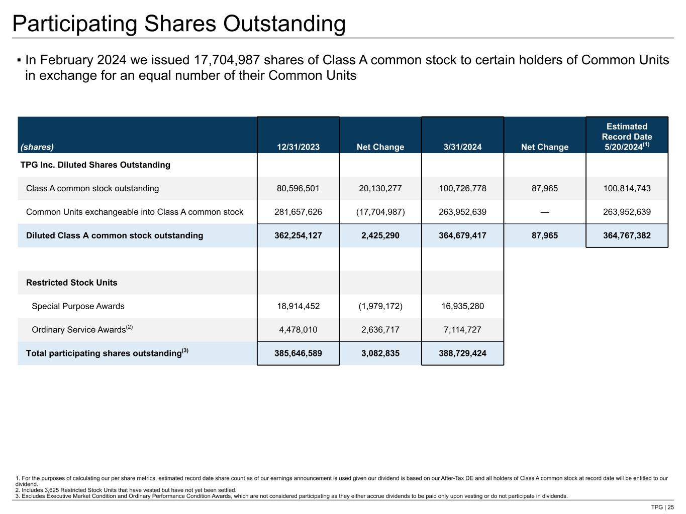 TPG | 24 GAAP and Non-GAAP Net Accrued Performance As of December 31, 2023 TPG Angelo Gordon ($ in millions) Capital Growth Impact Credit Real Estate Real Estate Market Solutions Total GAAP Total $ 2,683 $ 1,420 $ 542 $ 294 $ 510 $ 125 $ 91 $ 5,665 Less: Excluded Assets(1) 59 268 — — — 67 — 394 Less: Non-GAAP Adjustments(2) 2,220 967 435 235 413 46 64 4,380 Non-GAAP Total $ 404 $ 185 $ 107 $ 59 $ 97 $ 12 $ 27 $ 891 1. The TPG Operating Group Excluded entities’ performance allocations are not a component of net income attributable to TPG following the Reorganization; however, the TPG general partner entities continue to be consolidated by us. We transferred the rights to the performance allocations the TPG Operating Group historically would have received to RemainCo on December 31, 2021. As such, net income available to controlling interest holders will be zero for each of the TPG Operating Group Excluded entities beginning January 1, 2022. 2. Non-GAAP adjustments represent the exclusion of performance allocations that are not attributable to the TPG Operating Group Common Unit holders. As of March 31, 2024 TPG Angelo Gordon ($ in millions) Capital Growth Impact Credit Real Estate Real Estate Market Solutions Total GAAP Total $ 2,667 $ 1,526 $ 508 $ 388 $ 488 $ 102 $ 76 $ 5,755 Less: Excluded Assets(1) 61 285 — — — 17 — 363 Less: Non-GAAP Adjustments(2) 2,201 1,040 408 312 395 68 53 4,477 Non-GAAP Total $ 405 $ 201 $ 100 $ 76 $ 93 $ 17 $ 23 $ 915