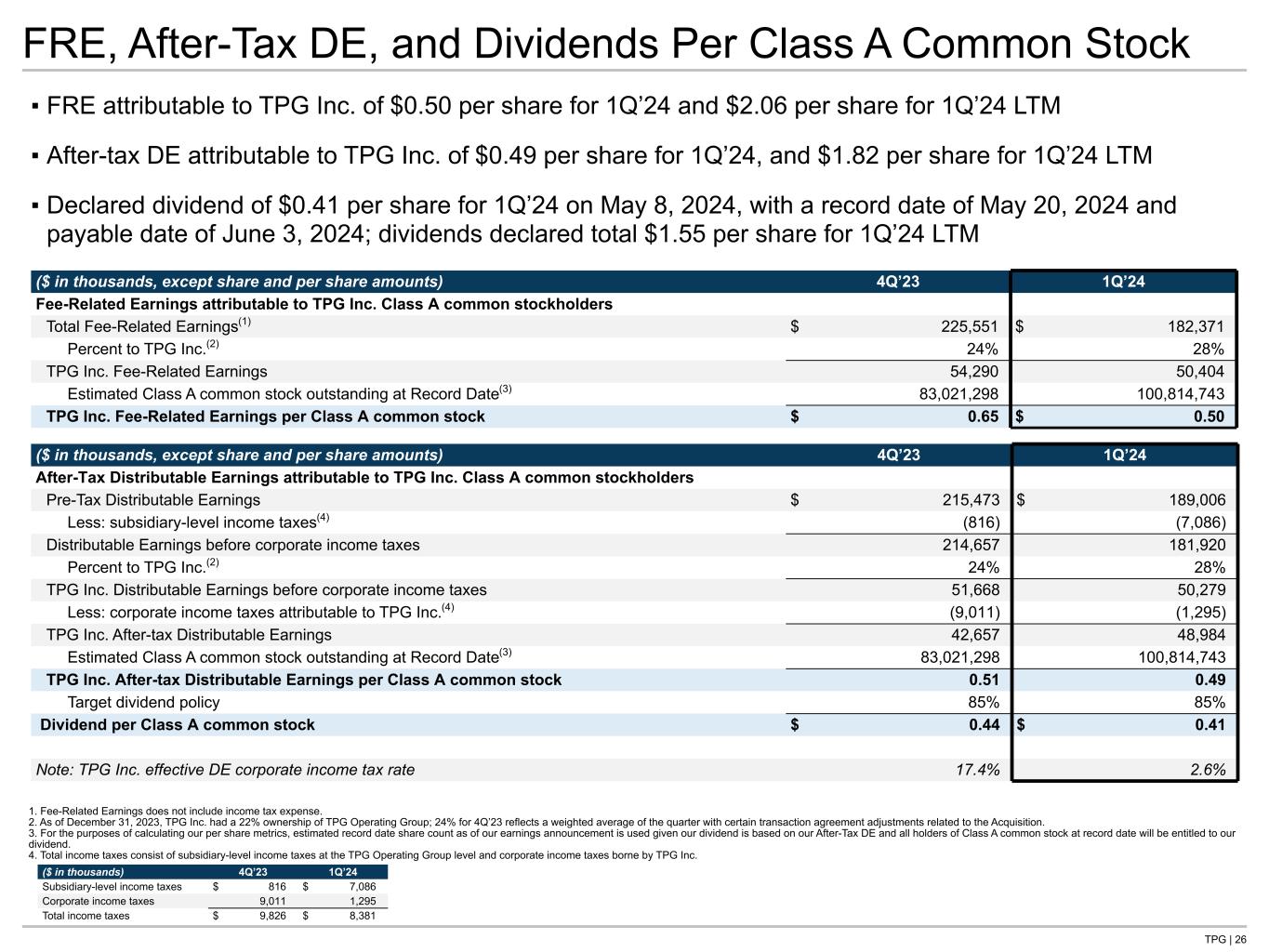 TPG | 25 Participating Shares Outstanding (shares) 12/31/2023 Net Change 3/31/2024 Net Change Estimated Record Date 5/20/2024(1) TPG Inc. Diluted Shares Outstanding Class A common stock outstanding 80,596,501 20,130,277 100,726,778 87,965 100,814,743 Common Units exchangeable into Class A common stock 281,657,626 (17,704,987) 263,952,639 — 263,952,639 Diluted Class A common stock outstanding 362,254,127 2,425,290 364,679,417 87,965 364,767,382 Restricted Stock Units Special Purpose Awards 18,914,452 (1,979,172) 16,935,280 Ordinary Service Awards(2) 4,478,010 2,636,717 7,114,727 Total participating shares outstanding(3) 385,646,589 3,082,835 388,729,424 ▪ In February 2024 we issued 17,704,987 shares of Class A common stock to certain holders of Common Units in exchange for an equal number of their Common Units 1. For the purposes of calculating our per share metrics, estimated record date share count as of our earnings announcement is used given our dividend is based on our After-Tax DE and all holders of Class A common stock at record date will be entitled to our dividend. 2. Includes 3,625 Restricted Stock Units that have vested but have not yet been settled. 3. Excludes Executive Market Condition and Ordinary Performance Condition Awards, which are not considered participating as they either accrue dividends to be paid only upon vesting or do not participate in dividends.
