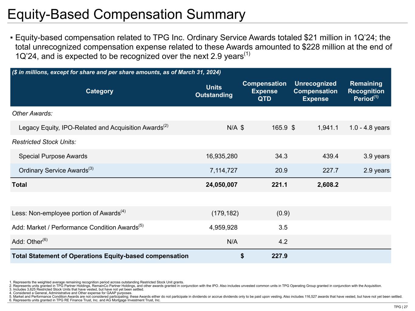 TPG | 27 Equity-Based Compensation Summary ($ in millions, except for share and per share amounts, as of March 31, 2024) Category Units Outstanding Compensation Expense QTD Unrecognized Compensation Expense Remaining Recognition Period(1) Other Awards: Legacy Equity, IPO-Related and Acquisition Awards(2) N/A $ 165.9 $ 1,941.1 1.0 - 4.8 years Restricted Stock Units: Special Purpose Awards 16,935,280 34.3 439.4 3.9 years Ordinary Service Awards(3) 7,114,727 20.9 227.7 2.9 years Total 24,050,007 221.1 2,608.2 Less: Non-employee portion of Awards(4) (179,182) (0.9) Add: Market / Performance Condition Awards(5) 4,959,928 3.5 Add: Other(6) N/A 4.2 Total Statement of Operations Equity-based compensation $ 227.9 1. Represents the weighted average remaining recognition period across outstanding Restricted Stock Unit grants. 2. Represents units granted in TPG Partner Holdings, RemainCo Partner Holdings, and other awards granted in conjunction with the IPO. Also includes unvested common units in TPG Operating Group granted in conjunction with the Acquisition. 3. Includes 3,625 Restricted Stock Units that have vested, but have not yet been settled. 4. Considered a General, Administrative and Other expense for GAAP purposes. 5. Market and Performance Condition Awards are not considered participating; these Awards either do not participate in dividends or accrue dividends only to be paid upon vesting. Also includes 116,527 awards that have vested, but have not yet been settled. 6. Represents units granted in TPG RE Finance Trust, Inc. and AG Mortgage Investment Trust, Inc. ▪ Equity-based compensation related to TPG Inc. Ordinary Service Awards totaled $21 million in 1Q’24; the total unrecognized compensation expense related to these Awards amounted to $228 million at the end of 1Q’24, and is expected to be recognized over the next 2.9 years(1)