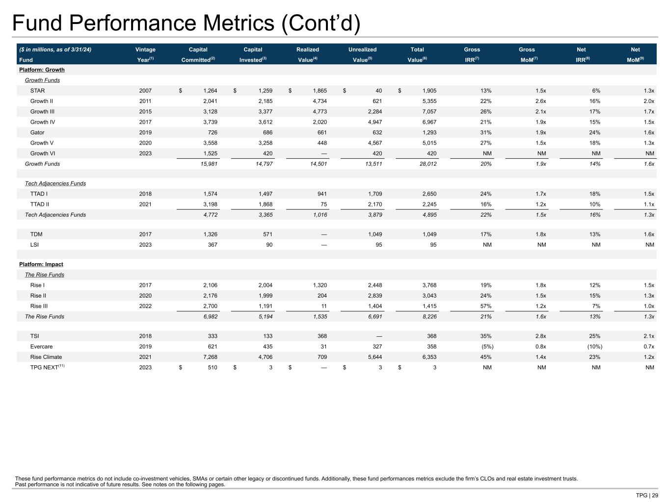 TPG | 29 Fund Performance Metrics (Cont’d) These fund performance metrics do not include co-investment vehicles, SMAs or certain other legacy or discontinued funds. Additionally, these fund performances metrics exclude the firm’s CLOs and real estate investment trusts. Past performance is not indicative of future results. See notes on the following pages. ($ in millions, as of 3/31/24) Vintage Capital Capital Realized Unrealized Total Gross Gross Net Net Fund Year(1) Committed(2) Invested(3) Value(4) Value(5) Value(6) IRR(7) MoM(7) IRR(8) MoM(9) Platform: Growth Growth Funds STAR 2007 $ 1,264 $ 1,259 $ 1,865 $ 40 $ 1,905 13% 1.5x 6% 1.3x Growth II 2011 2,041 2,185 4,734 621 5,355 22% 2.6x 16% 2.0x Growth III 2015 3,128 3,377 4,773 2,284 7,057 26% 2.1x 17% 1.7x Growth IV 2017 3,739 3,612 2,020 4,947 6,967 21% 1.9x 15% 1.5x Gator 2019 726 686 661 632 1,293 31% 1.9x 24% 1.6x Growth V 2020 3,558 3,258 448 4,567 5,015 27% 1.5x 18% 1.3x Growth VI 2023 1,525 420 — 420 420 NM NM NM NM Growth Funds 15,981 14,797 14,501 13,511 28,012 20% 1.9x 14% 1.6x Tech Adjacencies Funds TTAD I 2018 1,574 1,497 941 1,709 2,650 24% 1.7x 18% 1.5x TTAD II 2021 3,198 1,868 75 2,170 2,245 16% 1.2x 10% 1.1x Tech Adjacencies Funds 4,772 3,365 1,016 3,879 4,895 22% 1.5x 16% 1.3x TDM 2017 1,326 571 — 1,049 1,049 17% 1.8x 13% 1.6x LSI 2023 367 90 — 95 95 NM NM NM NM Platform: Impact The Rise Funds Rise I 2017 2,106 2,004 1,320 2,448 3,768 19% 1.8x 12% 1.5x Rise II 2020 2,176 1,999 204 2,839 3,043 24% 1.5x 15% 1.3x Rise III 2022 2,700 1,191 11 1,404 1,415 57% 1.2x 7% 1.0x The Rise Funds 6,982 5,194 1,535 6,691 8,226 21% 1.6x 13% 1.3x TSI 2018 333 133 368 — 368 35% 2.8x 25% 2.1x Evercare 2019 621 435 31 327 358 (5%) 0.8x (10%) 0.7x Rise Climate 2021 7,268 4,706 709 5,644 6,353 45% 1.4x 23% 1.2x TPG NEXT(11) 2023 $ 510 $ 3 $ — $ 3 $ 3 NM NM NM NM