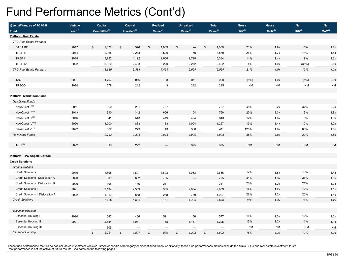 TPG | 30 Fund Performance Metrics (Cont’d) These fund performance metrics do not include co-investment vehicles, SMAs or certain other legacy or discontinued funds. Additionally, these fund performances metrics exclude the firm’s CLOs and real estate investment trusts. Past performance is not indicative of future results. See notes on the following pages. ($ in millions, as of 3/31/24) Vintage Capital Capital Realized Unrealized Total Gross Gross Net Net Fund Year(1) Committed(2) Invested(3) Value(4) Value(5) Value(6) IRR(7) MoM(7) IRR(8) MoM(9) Platform: Real Estate TPG Real Estate Partners DASA RE 2012 $ 1,078 $ 576 $ 1,069 $ — $ 1,069 21% 1.9x 15% 1.6x TREP II 2014 2,065 2,213 3,520 59 3,579 28% 1.7x 18% 1.5x TREP III 2018 3,722 4,192 2,656 2,728 5,384 14% 1.4x 9% 1.2x TREP IV 2022 6,820 2,403 220 2,272 2,492 4% 1.0x (36%) 0.8x TPG Real Estate Partners 13,685 9,384 7,465 5,059 12,524 21% 1.5x 13% 1.3x TAC+ 2021 1,797 916 98 811 909 (1%) 1.0x (4%) 0.9x TRECO 2024 378 212 3 212 215 NM NM NM NM Platform: Market Solutions NewQuest Funds NewQuest I(11) 2011 390 291 767 — 767 48% 3.2x 37% 2.3x NewQuest II(11) 2013 310 342 656 104 760 25% 2.3x 19% 1.8x NewQuest III(11) 2016 541 543 419 424 843 12% 1.6x 8% 1.3x NewQuest IV(11) 2020 1,000 883 133 1,094 1,227 19% 1.4x 10% 1.2x NewQuest V(11) 2022 502 279 43 368 411 120% 1.6x 83% 1.5x NewQuest Funds 2,743 2,338 2,018 1,990 4,008 35% 1.8x 22% 1.5x TGS(11) 2022 819 272 — 375 375 NM NM NM NM Platform: TPG Angelo Gordon Credit Solutions Credit Solutions Credit Solutions I 2019 1,805 1,801 1,603 1,053 2,656 17% 1.5x 13% 1.4x Credit Solutions I Dislocation A 2020 909 602 795 — 795 34% 1.3x 27% 1.3x Credit Solutions I Dislocation B 2020 308 176 211 — 211 28% 1.2x 21% 1.2x Credit Solutions II 2021 3,134 2,559 305 2,684 2,989 16% 1.2x 12% 1.1x Credit Solutions II Dislocation A 2022 1,310 868 268 759 1,027 28% 1.2x 20% 1.1x Credit Solutions 7,466 6,006 3,182 4,496 7,678 19% 1.3x 14% 1.2x Essential Housing Essential Housing I 2020 642 456 521 56 577 16% 1.3x 12% 1.2x Essential Housing II 2021 2,534 1,071 58 1,167 1,225 15% 1.2x 11% 1.1x Essential Housing III 605 — — — — NM NM NM NM Essential Housing $ 3,781 $ 1,527 $ 579 $ 1,223 $ 1,802 15% 1.3x 12% 1.2x