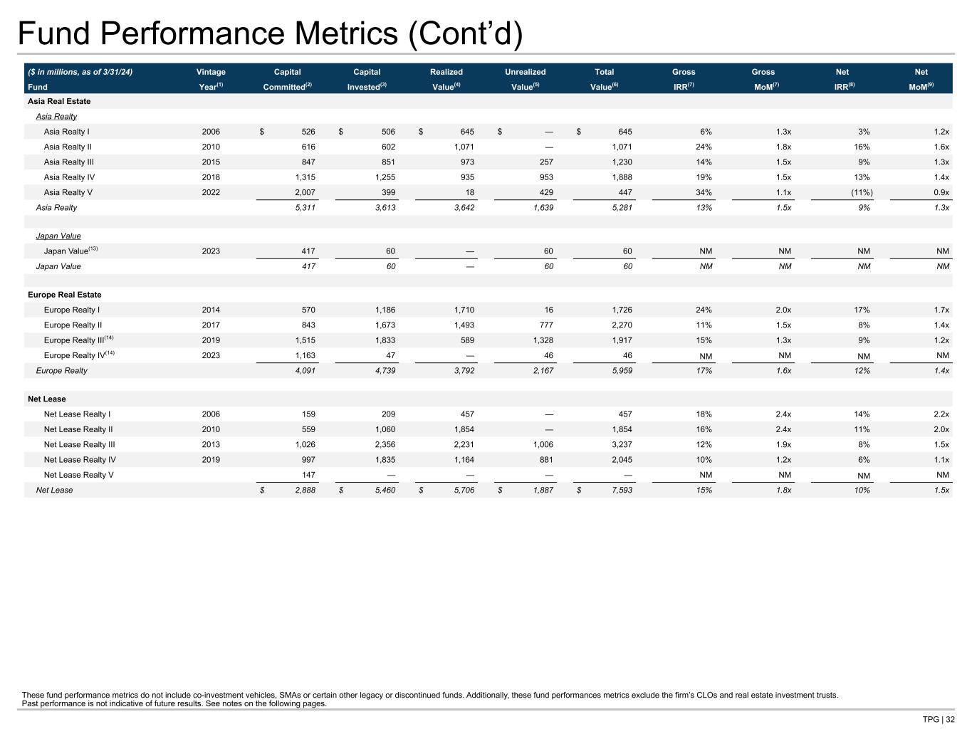 TPG | 32 Fund Performance Metrics (Cont’d) These fund performance metrics do not include co-investment vehicles, SMAs or certain other legacy or discontinued funds. Additionally, these fund performances metrics exclude the firm’s CLOs and real estate investment trusts. Past performance is not indicative of future results. See notes on the following pages. ($ in millions, as of 3/31/24) Vintage Capital Capital Realized Unrealized Total Gross Gross Net Net Fund Year(1) Committed(2) Invested(3) Value(4) Value(5) Value(6) IRR(7) MoM(7) IRR(8) MoM(9) Asia Real Estate Asia Realty Asia Realty I 2006 $ 526 $ 506 $ 645 $ — $ 645 6% 1.3x 3% 1.2x Asia Realty II 2010 616 602 1,071 — 1,071 24% 1.8x 16% 1.6x Asia Realty III 2015 847 851 973 257 1,230 14% 1.5x 9% 1.3x Asia Realty IV 2018 1,315 1,255 935 953 1,888 19% 1.5x 13% 1.4x Asia Realty V 2022 2,007 399 18 429 447 34% 1.1x (11%) 0.9x Asia Realty 5,311 3,613 3,642 1,639 5,281 13% 1.5x 9% 1.3x Japan Value Japan Value(13) 2023 417 60 — 60 60 NM NM NM NM Japan Value 417 60 — 60 60 NM NM NM NM Europe Real Estate Europe Realty I 2014 570 1,186 1,710 16 1,726 24% 2.0x 17% 1.7x Europe Realty II 2017 843 1,673 1,493 777 2,270 11% 1.5x 8% 1.4x Europe Realty III(14) 2019 1,515 1,833 589 1,328 1,917 15% 1.3x 9% 1.2x Europe Realty IV(14) 2023 1,163 47 — 46 46 NM NM NM NM Europe Realty 4,091 4,739 3,792 2,167 5,959 17% 1.6x 12% 1.4x Net Lease Net Lease Realty I 2006 159 209 457 — 457 18% 2.4x 14% 2.2x Net Lease Realty II 2010 559 1,060 1,854 — 1,854 16% 2.4x 11% 2.0x Net Lease Realty III 2013 1,026 2,356 2,231 1,006 3,237 12% 1.9x 8% 1.5x Net Lease Realty IV 2019 997 1,835 1,164 881 2,045 10% 1.2x 6% 1.1x Net Lease Realty V 147 — — — — NM NM NM NM Net Lease $ 2,888 $ 5,460 $ 5,706 $ 1,887 $ 7,593 15% 1.8x 10% 1.5x