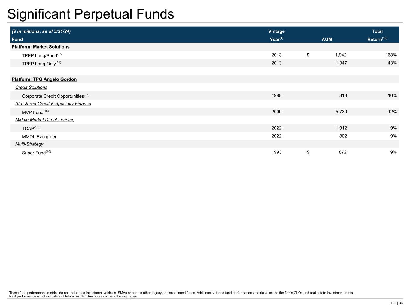 TPG | 33 Significant Perpetual Funds These fund performance metrics do not include co-investment vehicles, SMAs or certain other legacy or discontinued funds. Additionally, these fund performances metrics exclude the firm’s CLOs and real estate investment trusts. Past performance is not indicative of future results. See notes on the following pages. ($ in millions, as of 3/31/24) Vintage AUM Total Fund Year(1) Return(10) Platform: Market Solutions TPEP Long/Short(15) 2013 $ 1,942 168% TPEP Long Only(16) 2013 1,347 43% Platform: TPG Angelo Gordon Credit Solutions Corporate Credit Opportunities(17) 1988 313 10% Structured Credit & Specialty Finance MVP Fund(18) 2009 5,730 12% Middle Market Direct Lending TCAP(19) 2022 1,912 9% MMDL Evergreen 2022 802 9% Multi-Strategy Super Fund(18) 1993 $ 872 9%