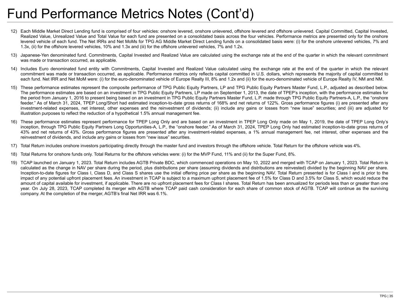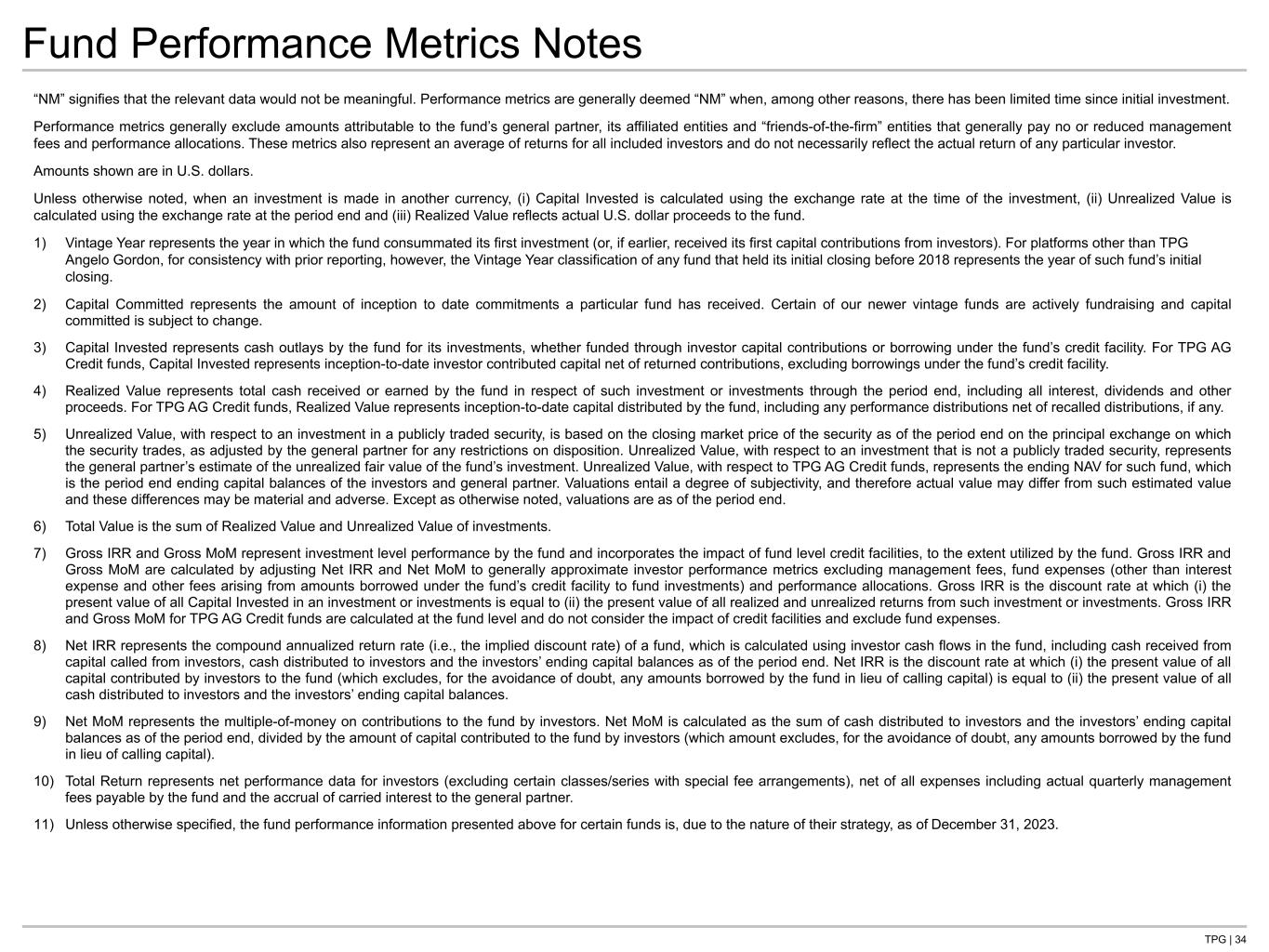 TPG | 34 Fund Performance Metrics Notes “NM” signifies that the relevant data would not be meaningful. Performance metrics are generally deemed “NM” when, among other reasons, there has been limited time since initial investment. Performance metrics generally exclude amounts attributable to the fund’s general partner, its affiliated entities and “friends-of-the-firm” entities that generally pay no or reduced management fees and performance allocations. These metrics also represent an average of returns for all included investors and do not necessarily reflect the actual return of any particular investor. Amounts shown are in U.S. dollars. Unless otherwise noted, when an investment is made in another currency, (i) Capital Invested is calculated using the exchange rate at the time of the investment, (ii) Unrealized Value is calculated using the exchange rate at the period end and (iii) Realized Value reflects actual U.S. dollar proceeds to the fund. 1) Vintage Year represents the year in which the fund consummated its first investment (or, if earlier, received its first capital contributions from investors). For platforms other than TPG Angelo Gordon, for consistency with prior reporting, however, the Vintage Year classification of any fund that held its initial closing before 2018 represents the year of such fund’s initial closing. 2) Capital Committed represents the amount of inception to date commitments a particular fund has received. Certain of our newer vintage funds are actively fundraising and capital committed is subject to change. 3) Capital Invested represents cash outlays by the fund for its investments, whether funded through investor capital contributions or borrowing under the fund’s credit facility. For TPG AG Credit funds, Capital Invested represents inception-to-date investor contributed capital net of returned contributions, excluding borrowings under the fund’s credit facility. 4) Realized Value represents total cash received or earned by the fund in respect of such investment or investments through the period end, including all interest, dividends and other proceeds. For TPG AG Credit funds, Realized Value represents inception-to-date capital distributed by the fund, including any performance distributions net of recalled distributions, if any. 5) Unrealized Value, with respect to an investment in a publicly traded security, is based on the closing market price of the security as of the period end on the principal exchange on which the security trades, as adjusted by the general partner for any restrictions on disposition. Unrealized Value, with respect to an investment that is not a publicly traded security, represents the general partner’s estimate of the unrealized fair value of the fund’s investment. Unrealized Value, with respect to TPG AG Credit funds, represents the ending NAV for such fund, which is the period end ending capital balances of the investors and general partner. Valuations entail a degree of subjectivity, and therefore actual value may differ from such estimated value and these differences may be material and adverse. Except as otherwise noted, valuations are as of the period end. 6) Total Value is the sum of Realized Value and Unrealized Value of investments. 7) Gross IRR and Gross MoM represent investment level performance by the fund and incorporates the impact of fund level credit facilities, to the extent utilized by the fund. Gross IRR and Gross MoM are calculated by adjusting Net IRR and Net MoM to generally approximate investor performance metrics excluding management fees, fund expenses (other than interest expense and other fees arising from amounts borrowed under the fund’s credit facility to fund investments) and performance allocations. Gross IRR is the discount rate at which (i) the present value of all Capital Invested in an investment or investments is equal to (ii) the present value of all realized and unrealized returns from such investment or investments. Gross IRR and Gross MoM for TPG AG Credit funds are calculated at the fund level and do not consider the impact of credit facilities and exclude fund expenses. 8) Net IRR represents the compound annualized return rate (i.e., the implied discount rate) of a fund, which is calculated using investor cash flows in the fund, including cash received from capital called from investors, cash distributed to investors and the investors’ ending capital balances as of the period end. Net IRR is the discount rate at which (i) the present value of all capital contributed by investors to the fund (which excludes, for the avoidance of doubt, any amounts borrowed by the fund in lieu of calling capital) is equal to (ii) the present value of all cash distributed to investors and the investors’ ending capital balances. 9) Net MoM represents the multiple-of-money on contributions to the fund by investors. Net MoM is calculated as the sum of cash distributed to investors and the investors’ ending capital balances as of the period end, divided by the amount of capital contributed to the fund by investors (which amount excludes, for the avoidance of doubt, any amounts borrowed by the fund in lieu of calling capital). 10) Total Return represents net performance data for investors (excluding certain classes/series with special fee arrangements), net of all expenses including actual quarterly management fees payable by the fund and the accrual of carried interest to the general partner. 11) Unless otherwise specified, the fund performance information presented above for certain funds is, due to the nature of their strategy, as of December 31, 2023.
