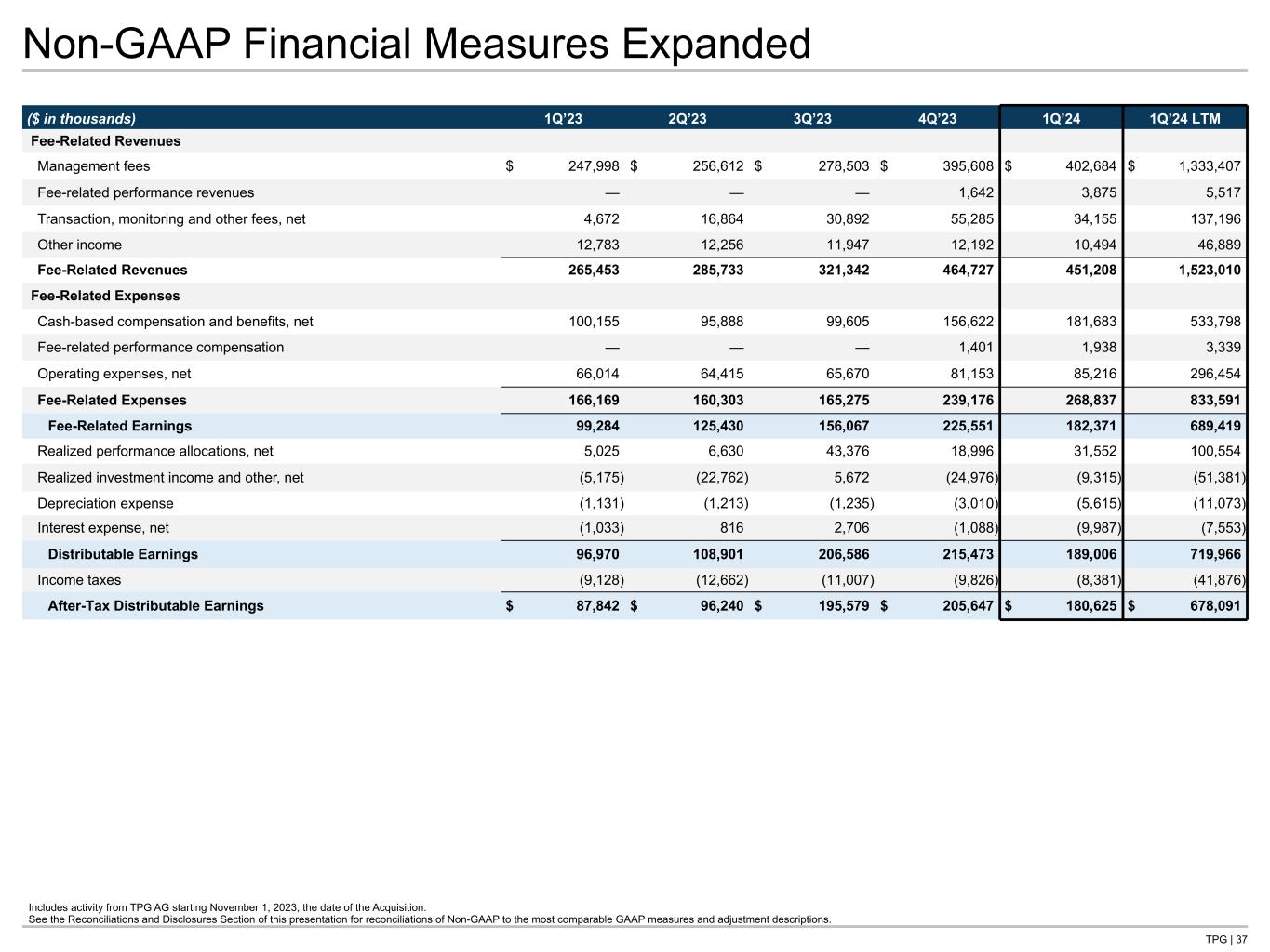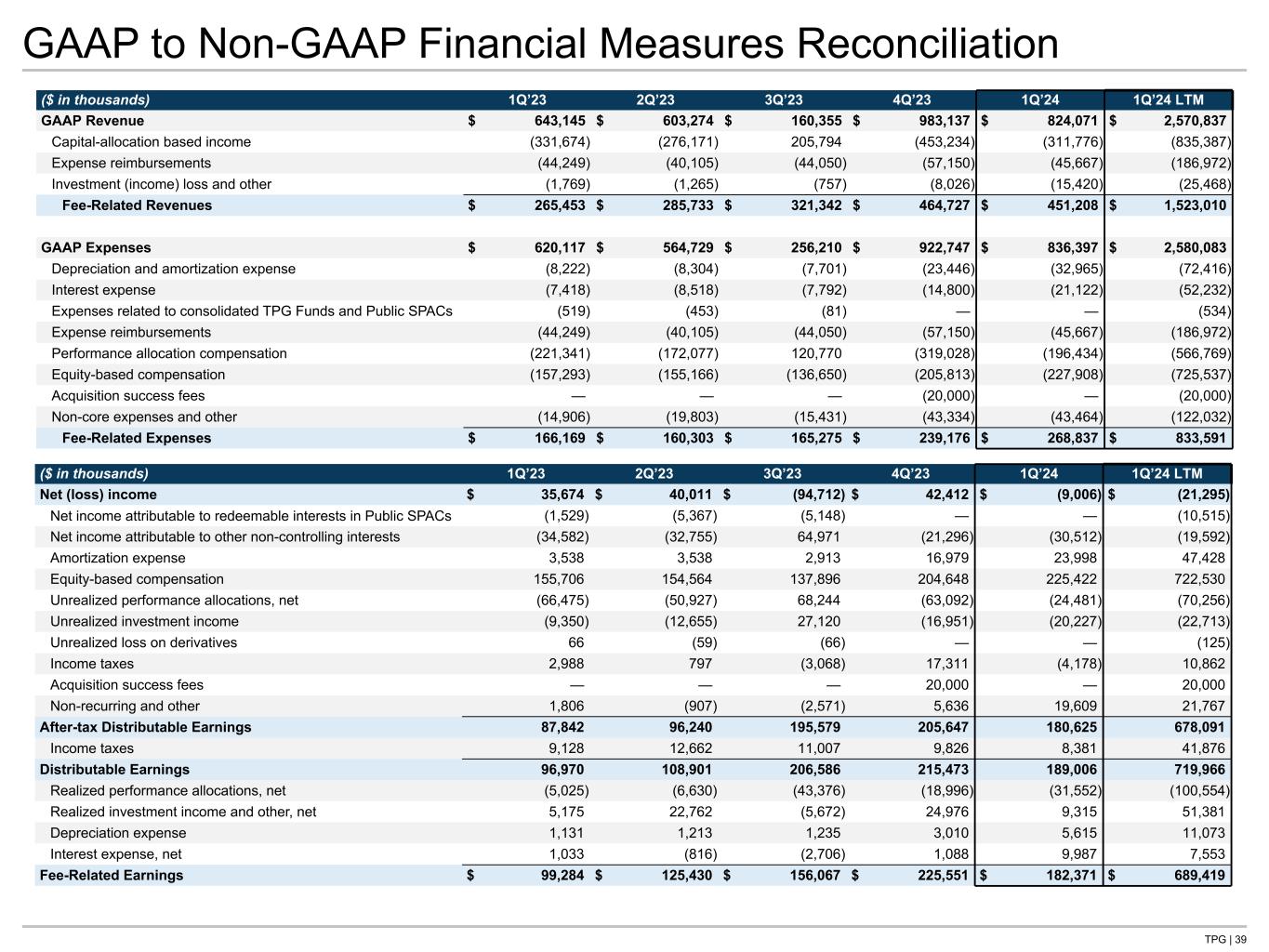TPG | 37 Non-GAAP Financial Measures Expanded Includes activity from TPG AG starting November 1, 2023, the date of the Acquisition. See the Reconciliations and Disclosures Section of this presentation for reconciliations of Non-GAAP to the most comparable GAAP measures and adjustment descriptions. ($ in thousands) 1Q’23 2Q’23 3Q’23 4Q’23 1Q’24 1Q’24 LTM Fee-Related Revenues Management fees $ 247,998 $ 256,612 $ 278,503 $ 395,608 $ 402,684 $ 1,333,407 Fee-related performance revenues — — — 1,642 3,875 5,517 Transaction, monitoring and other fees, net 4,672 16,864 30,892 55,285 34,155 137,196 Other income 12,783 12,256 11,947 12,192 10,494 46,889 Fee-Related Revenues 265,453 285,733 321,342 464,727 451,208 1,523,010 Fee-Related Expenses Cash-based compensation and benefits, net 100,155 95,888 99,605 156,622 181,683 533,798 Fee-related performance compensation — — — 1,401 1,938 3,339 Operating expenses, net 66,014 64,415 65,670 81,153 85,216 296,454 Fee-Related Expenses 166,169 160,303 165,275 239,176 268,837 833,591 Fee-Related Earnings 99,284 125,430 156,067 225,551 182,371 689,419 Realized performance allocations, net 5,025 6,630 43,376 18,996 31,552 100,554 Realized investment income and other, net (5,175) (22,762) 5,672 (24,976) (9,315) (51,381) Depreciation expense (1,131) (1,213) (1,235) (3,010) (5,615) (11,073) Interest expense, net (1,033) 816 2,706 (1,088) (9,987) (7,553) Distributable Earnings 96,970 108,901 206,586 215,473 189,006 719,966 Income taxes (9,128) (12,662) (11,007) (9,826) (8,381) (41,876) After-Tax Distributable Earnings $ 87,842 $ 96,240 $ 195,579 $ 205,647 $ 180,625 $ 678,091