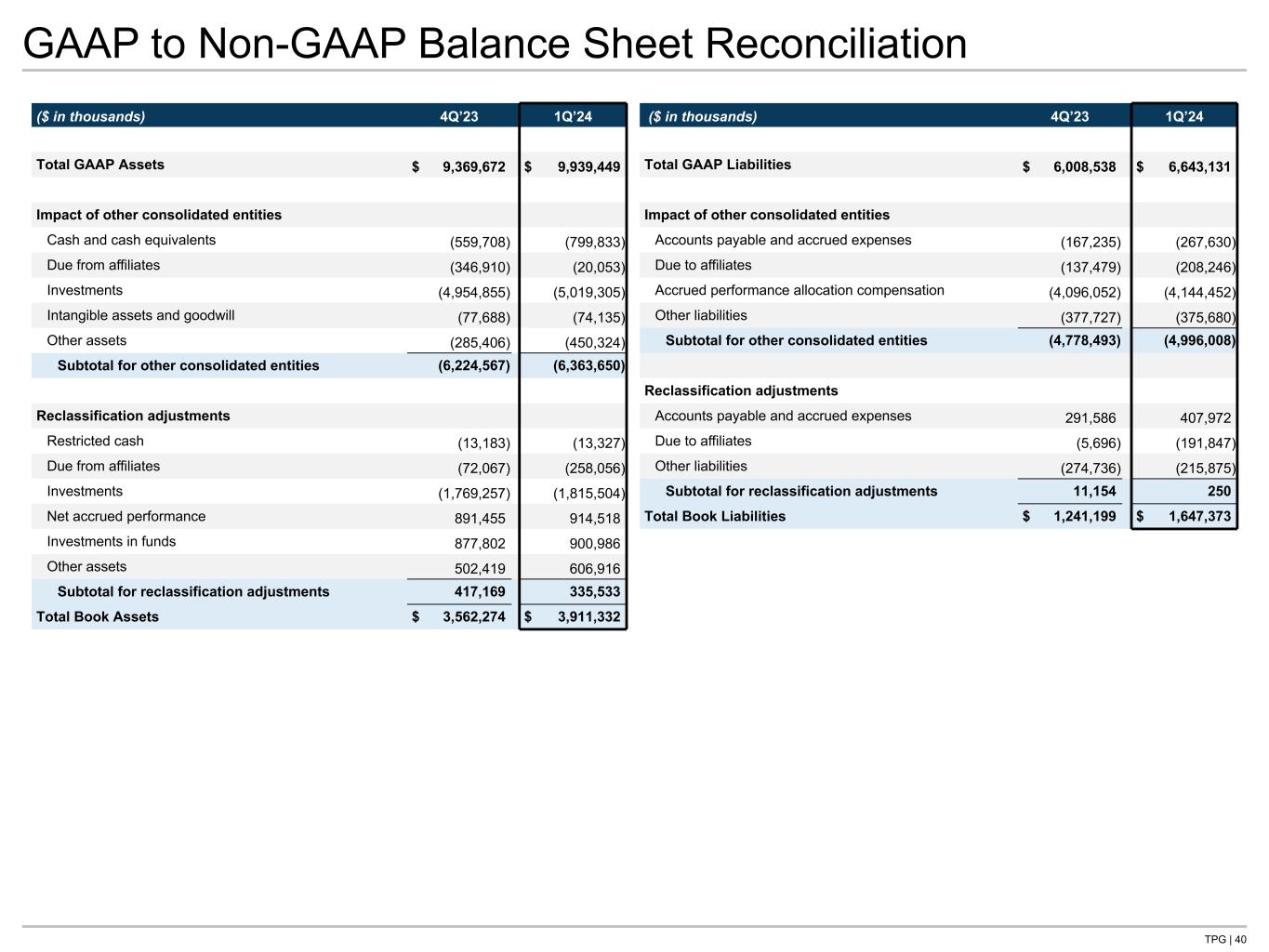 TPG | 40 GAAP to Non-GAAP Balance Sheet Reconciliation ($ in thousands) 4Q’23 1Q’24 Total GAAP Assets $ 9,369,672 $ 9,939,449 Impact of other consolidated entities Cash and cash equivalents (559,708) (799,833) Due from affiliates (346,910) (20,053) Investments (4,954,855) (5,019,305) Intangible assets and goodwill (77,688) (74,135) Other assets (285,406) (450,324) Subtotal for other consolidated entities (6,224,567) (6,363,650) Reclassification adjustments Restricted cash (13,183) (13,327) Due from affiliates (72,067) (258,056) Investments (1,769,257) (1,815,504) Net accrued performance 891,455 914,518 Investments in funds 877,802 900,986 Other assets 502,419 606,916 Subtotal for reclassification adjustments 417,169 335,533 Total Book Assets $ 3,562,274 $ 3,911,332 ($ in thousands) 4Q’23 1Q’24 Total GAAP Liabilities $ 6,008,538 $ 6,643,131 Impact of other consolidated entities Accounts payable and accrued expenses (167,235) (267,630) Due to affiliates (137,479) (208,246) Accrued performance allocation compensation (4,096,052) (4,144,452) Other liabilities (377,727) (375,680) Subtotal for other consolidated entities (4,778,493) (4,996,008) Reclassification adjustments Accounts payable and accrued expenses 291,586 407,972 Due to affiliates (5,696) (191,847) Other liabilities (274,736) (215,875) Subtotal for reclassification adjustments 11,154 250 Total Book Liabilities $ 1,241,199 $ 1,647,373
