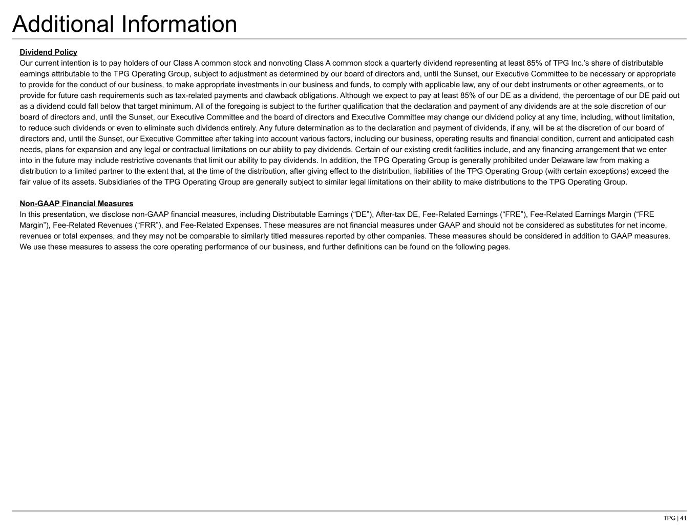 TPG | 41 Additional Information Dividend Policy Our current intention is to pay holders of our Class A common stock and nonvoting Class A common stock a quarterly dividend representing at least 85% of TPG Inc.’s share of distributable earnings attributable to the TPG Operating Group, subject to adjustment as determined by our board of directors and, until the Sunset, our Executive Committee to be necessary or appropriate to provide for the conduct of our business, to make appropriate investments in our business and funds, to comply with applicable law, any of our debt instruments or other agreements, or to provide for future cash requirements such as tax-related payments and clawback obligations. Although we expect to pay at least 85% of our DE as a dividend, the percentage of our DE paid out as a dividend could fall below that target minimum. All of the foregoing is subject to the further qualification that the declaration and payment of any dividends are at the sole discretion of our board of directors and, until the Sunset, our Executive Committee and the board of directors and Executive Committee may change our dividend policy at any time, including, without limitation, to reduce such dividends or even to eliminate such dividends entirely. Any future determination as to the declaration and payment of dividends, if any, will be at the discretion of our board of directors and, until the Sunset, our Executive Committee after taking into account various factors, including our business, operating results and financial condition, current and anticipated cash needs, plans for expansion and any legal or contractual limitations on our ability to pay dividends. Certain of our existing credit facilities include, and any financing arrangement that we enter into in the future may include restrictive covenants that limit our ability to pay dividends. In addition, the TPG Operating Group is generally prohibited under Delaware law from making a distribution to a limited partner to the extent that, at the time of the distribution, after giving effect to the distribution, liabilities of the TPG Operating Group (with certain exceptions) exceed the fair value of its assets. Subsidiaries of the TPG Operating Group are generally subject to similar legal limitations on their ability to make distributions to the TPG Operating Group. Non-GAAP Financial Measures In this presentation, we disclose non-GAAP financial measures, including Distributable Earnings (“DE”), After-tax DE, Fee-Related Earnings (“FRE”), Fee-Related Earnings Margin (“FRE Margin”), Fee-Related Revenues (“FRR”), and Fee-Related Expenses. These measures are not financial measures under GAAP and should not be considered as substitutes for net income, revenues or total expenses, and they may not be comparable to similarly titled measures reported by other companies. These measures should be considered in addition to GAAP measures. We use these measures to assess the core operating performance of our business, and further definitions can be found on the following pages.