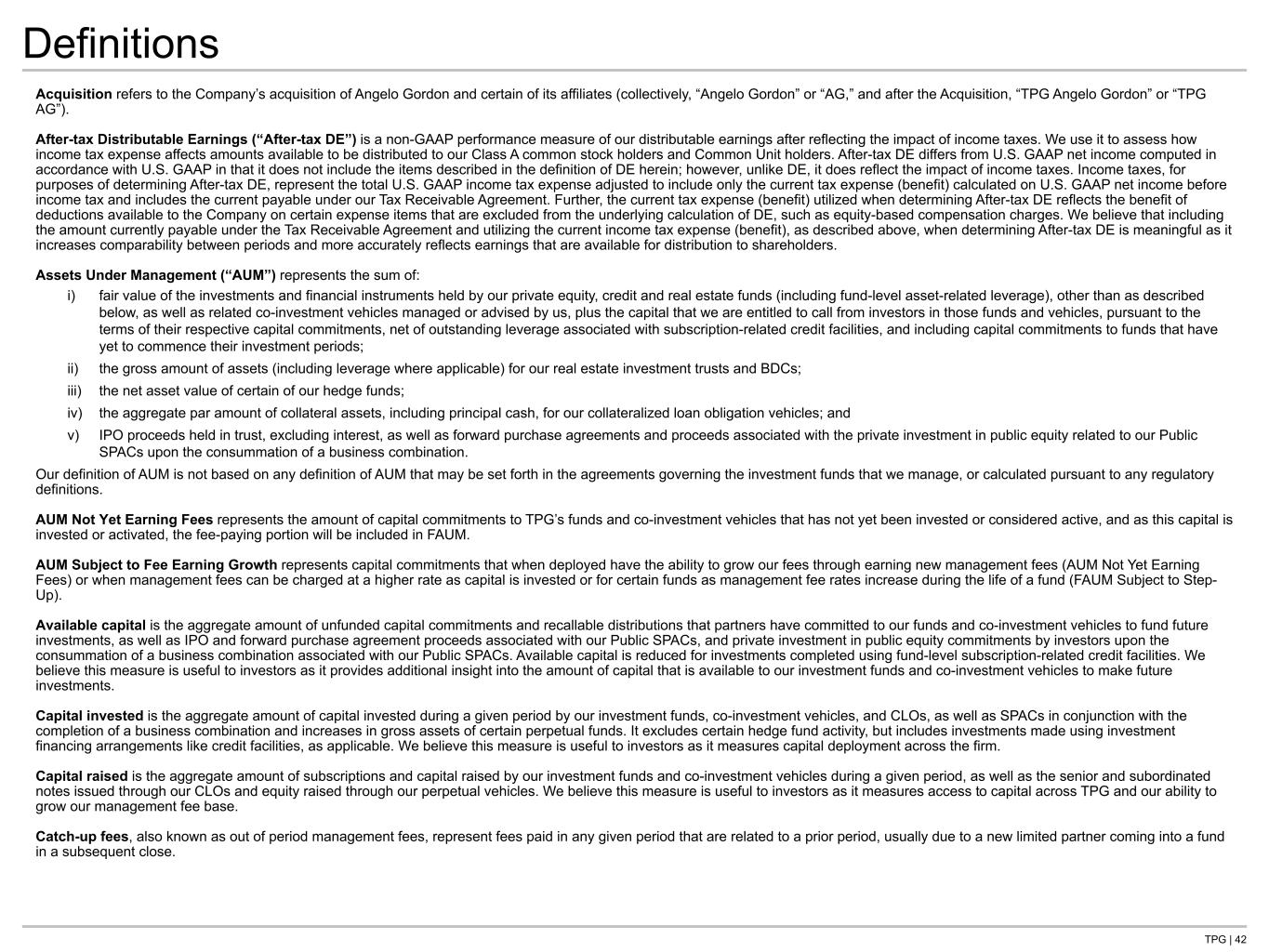 TPG | 42 Definitions Acquisition refers to the Company’s acquisition of Angelo Gordon and certain of its affiliates (collectively, “Angelo Gordon” or “AG,” and after the Acquisition, “TPG Angelo Gordon” or “TPG AG”). After-tax Distributable Earnings (“After-tax DE”) is a non-GAAP performance measure of our distributable earnings after reflecting the impact of income taxes. We use it to assess how income tax expense affects amounts available to be distributed to our Class A common stock holders and Common Unit holders. After-tax DE differs from U.S. GAAP net income computed in accordance with U.S. GAAP in that it does not include the items described in the definition of DE herein; however, unlike DE, it does reflect the impact of income taxes. Income taxes, for purposes of determining After-tax DE, represent the total U.S. GAAP income tax expense adjusted to include only the current tax expense (benefit) calculated on U.S. GAAP net income before income tax and includes the current payable under our Tax Receivable Agreement. Further, the current tax expense (benefit) utilized when determining After-tax DE reflects the benefit of deductions available to the Company on certain expense items that are excluded from the underlying calculation of DE, such as equity-based compensation charges. We believe that including the amount currently payable under the Tax Receivable Agreement and utilizing the current income tax expense (benefit), as described above, when determining After-tax DE is meaningful as it increases comparability between periods and more accurately reflects earnings that are available for distribution to shareholders. Assets Under Management (“AUM”) represents the sum of: i) fair value of the investments and financial instruments held by our private equity, credit and real estate funds (including fund-level asset-related leverage), other than as described below, as well as related co-investment vehicles managed or advised by us, plus the capital that we are entitled to call from investors in those funds and vehicles, pursuant to the terms of their respective capital commitments, net of outstanding leverage associated with subscription-related credit facilities, and including capital commitments to funds that have yet to commence their investment periods; ii) the gross amount of assets (including leverage where applicable) for our real estate investment trusts and BDCs; iii) the net asset value of certain of our hedge funds; iv) the aggregate par amount of collateral assets, including principal cash, for our collateralized loan obligation vehicles; and v) IPO proceeds held in trust, excluding interest, as well as forward purchase agreements and proceeds associated with the private investment in public equity related to our Public SPACs upon the consummation of a business combination. Our definition of AUM is not based on any definition of AUM that may be set forth in the agreements governing the investment funds that we manage, or calculated pursuant to any regulatory definitions. AUM Not Yet Earning Fees represents the amount of capital commitments to TPG’s funds and co-investment vehicles that has not yet been invested or considered active, and as this capital is invested or activated, the fee-paying portion will be included in FAUM. AUM Subject to Fee Earning Growth represents capital commitments that when deployed have the ability to grow our fees through earning new management fees (AUM Not Yet Earning Fees) or when management fees can be charged at a higher rate as capital is invested or for certain funds as management fee rates increase during the life of a fund (FAUM Subject to Step- Up). Available capital is the aggregate amount of unfunded capital commitments and recallable distributions that partners have committed to our funds and co-investment vehicles to fund future investments, as well as IPO and forward purchase agreement proceeds associated with our Public SPACs, and private investment in public equity commitments by investors upon the consummation of a business combination associated with our Public SPACs. Available capital is reduced for investments completed using fund-level subscription-related credit facilities. We believe this measure is useful to investors as it provides additional insight into the amount of capital that is available to our investment funds and co-investment vehicles to make future investments. Capital invested is the aggregate amount of capital invested during a given period by our investment funds, co-investment vehicles, and CLOs, as well as SPACs in conjunction with the completion of a business combination and increases in gross assets of certain perpetual funds. It excludes certain hedge fund activity, but includes investments made using investment financing arrangements like credit facilities, as applicable. We believe this measure is useful to investors as it measures capital deployment across the firm. Capital raised is the aggregate amount of subscriptions and capital raised by our investment funds and co-investment vehicles during a given period, as well as the senior and subordinated notes issued through our CLOs and equity raised through our perpetual vehicles. We believe this measure is useful to investors as it measures access to capital across TPG and our ability to grow our management fee base. Catch-up fees, also known as out of period management fees, represent fees paid in any given period that are related to a prior period, usually due to a new limited partner coming into a fund in a subsequent close.