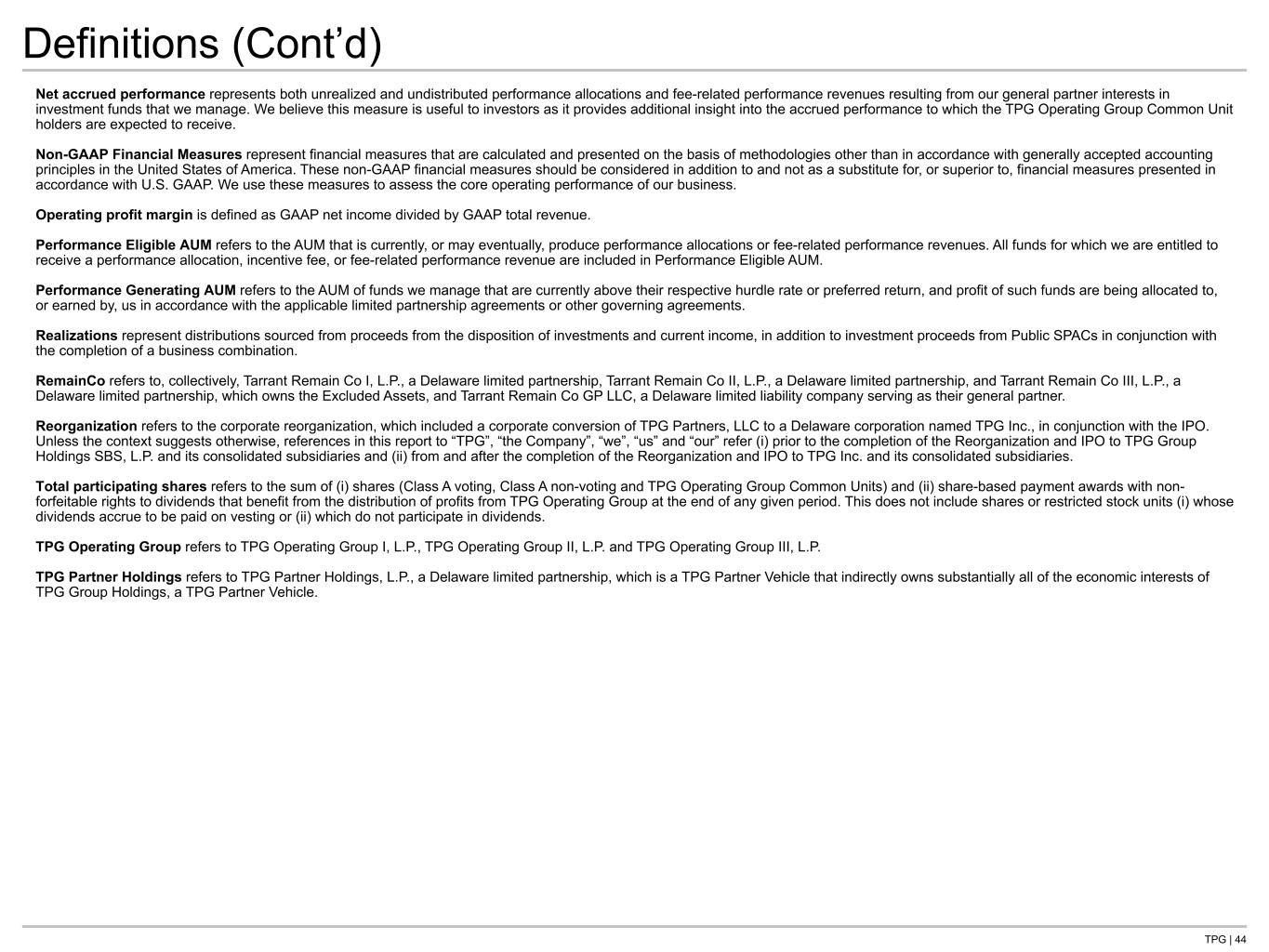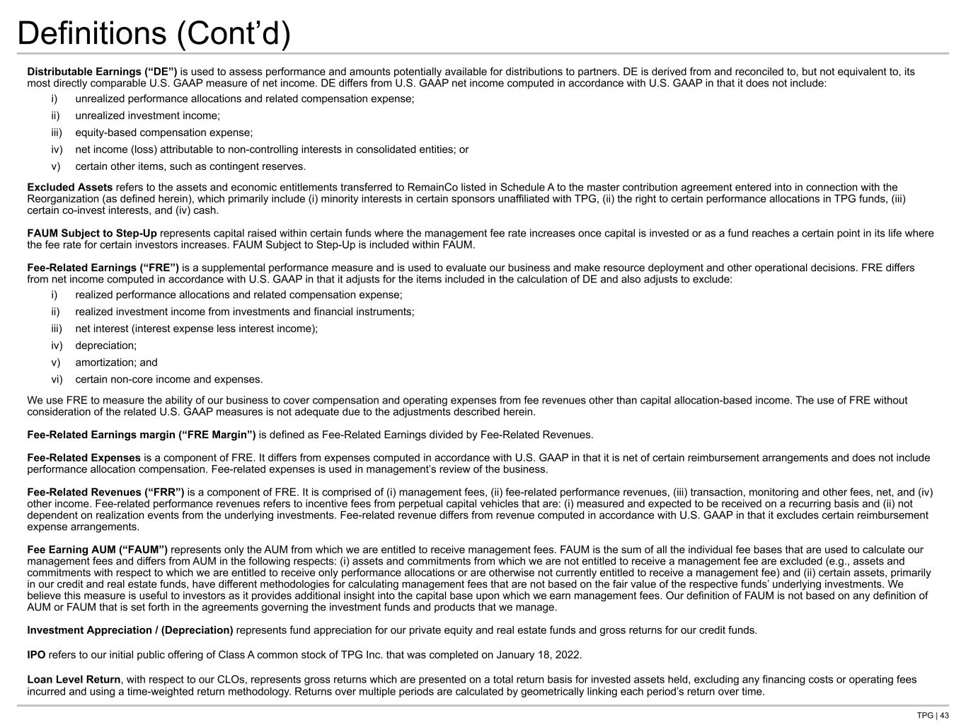 TPG | 43 Definitions (Cont’d) Distributable Earnings (“DE”) is used to assess performance and amounts potentially available for distributions to partners. DE is derived from and reconciled to, but not equivalent to, its most directly comparable U.S. GAAP measure of net income. DE differs from U.S. GAAP net income computed in accordance with U.S. GAAP in that it does not include: i) unrealized performance allocations and related compensation expense; ii) unrealized investment income; iii) equity-based compensation expense; iv) net income (loss) attributable to non-controlling interests in consolidated entities; or v) certain other items, such as contingent reserves. Excluded Assets refers to the assets and economic entitlements transferred to RemainCo listed in Schedule A to the master contribution agreement entered into in connection with the Reorganization (as defined herein), which primarily include (i) minority interests in certain sponsors unaffiliated with TPG, (ii) the right to certain performance allocations in TPG funds, (iii) certain co-invest interests, and (iv) cash. FAUM Subject to Step-Up represents capital raised within certain funds where the management fee rate increases once capital is invested or as a fund reaches a certain point in its life where the fee rate for certain investors increases. FAUM Subject to Step-Up is included within FAUM. Fee-Related Earnings (“FRE”) is a supplemental performance measure and is used to evaluate our business and make resource deployment and other operational decisions. FRE differs from net income computed in accordance with U.S. GAAP in that it adjusts for the items included in the calculation of DE and also adjusts to exclude: i) realized performance allocations and related compensation expense; ii) realized investment income from investments and financial instruments; iii) net interest (interest expense less interest income); iv) depreciation; v) amortization; and vi) certain non-core income and expenses. We use FRE to measure the ability of our business to cover compensation and operating expenses from fee revenues other than capital allocation-based income. The use of FRE without consideration of the related U.S. GAAP measures is not adequate due to the adjustments described herein. Fee-Related Earnings margin (“FRE Margin”) is defined as Fee-Related Earnings divided by Fee-Related Revenues. Fee-Related Expenses is a component of FRE. It differs from expenses computed in accordance with U.S. GAAP in that it is net of certain reimbursement arrangements and does not include performance allocation compensation. Fee-related expenses is used in management’s review of the business. Fee-Related Revenues (“FRR”) is a component of FRE. It is comprised of (i) management fees, (ii) fee-related performance revenues, (iii) transaction, monitoring and other fees, net, and (iv) other income. Fee-related performance revenues refers to incentive fees from perpetual capital vehicles that are: (i) measured and expected to be received on a recurring basis and (ii) not dependent on realization events from the underlying investments. Fee-related revenue differs from revenue computed in accordance with U.S. GAAP in that it excludes certain reimbursement expense arrangements. Fee Earning AUM (“FAUM”) represents only the AUM from which we are entitled to receive management fees. FAUM is the sum of all the individual fee bases that are used to calculate our management fees and differs from AUM in the following respects: (i) assets and commitments from which we are not entitled to receive a management fee are excluded (e.g., assets and commitments with respect to which we are entitled to receive only performance allocations or are otherwise not currently entitled to receive a management fee) and (ii) certain assets, primarily in our credit and real estate funds, have different methodologies for calculating management fees that are not based on the fair value of the respective funds’ underlying investments. We believe this measure is useful to investors as it provides additional insight into the capital base upon which we earn management fees. Our definition of FAUM is not based on any definition of AUM or FAUM that is set forth in the agreements governing the investment funds and products that we manage. Investment Appreciation / (Depreciation) represents fund appreciation for our private equity and real estate funds and gross returns for our credit funds. IPO refers to our initial public offering of Class A common stock of TPG Inc. that was completed on January 18, 2022. Loan Level Return, with respect to our CLOs, represents gross returns which are presented on a total return basis for invested assets held, excluding any financing costs or operating fees incurred and using a time-weighted return methodology. Returns over multiple periods are calculated by geometrically linking each period’s return over time.