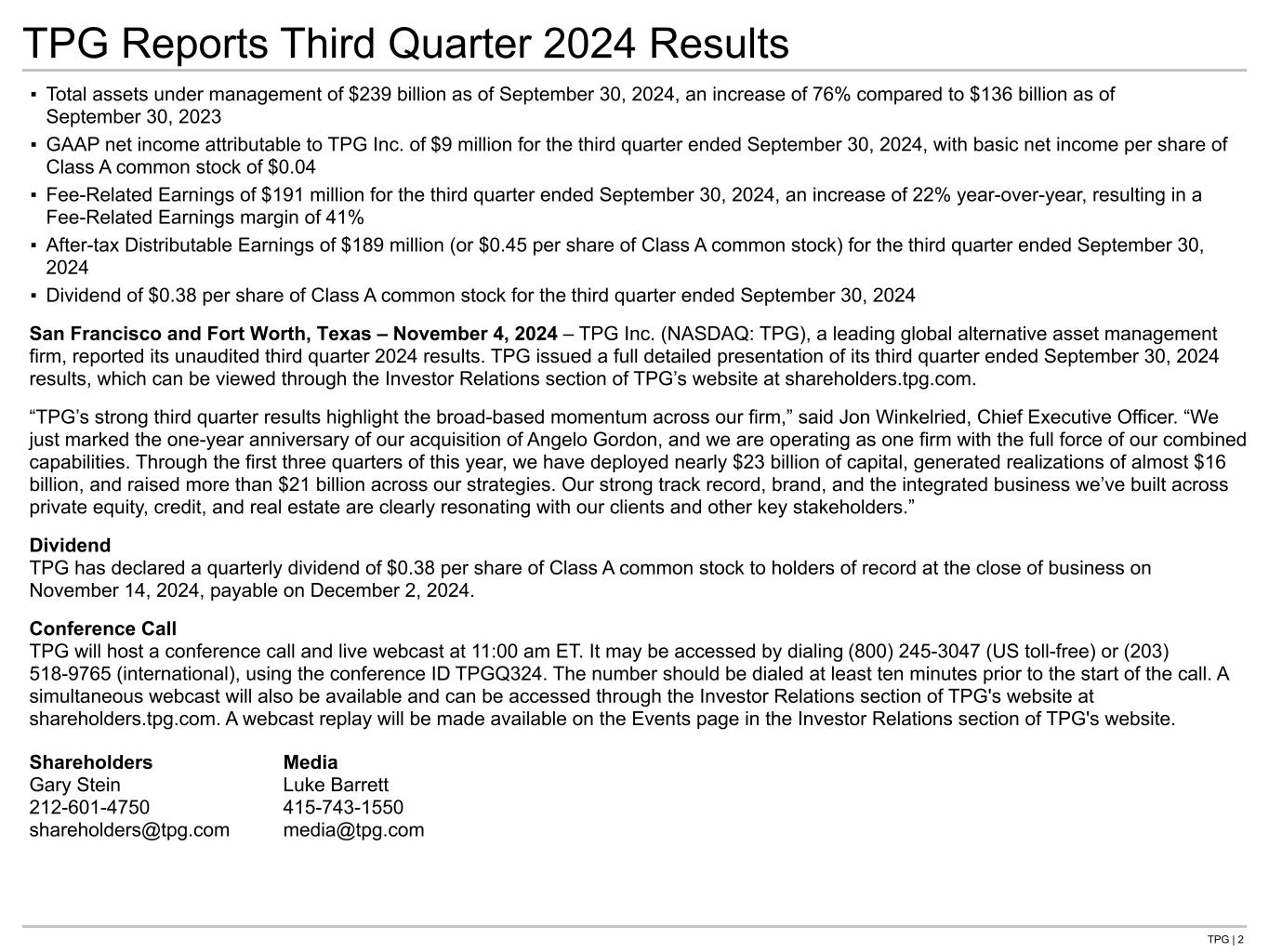 TPG | 2 ▪ Total assets under management of $239 billion as of September 30, 2024, an increase of 76% compared to $136 billion as of September 30, 2023 ▪ GAAP net income attributable to TPG Inc. of $9 million for the third quarter ended September 30, 2024, with basic net income per share of Class A common stock of $0.04 ▪ Fee-Related Earnings of $191 million for the third quarter ended September 30, 2024, an increase of 22% year-over-year, resulting in a Fee-Related Earnings margin of 41% ▪ After-tax Distributable Earnings of $189 million (or $0.45 per share of Class A common stock) for the third quarter ended September 30, 2024 ▪ Dividend of $0.38 per share of Class A common stock for the third quarter ended September 30, 2024 San Francisco and Fort Worth, Texas – November 4, 2024 – TPG Inc. (NASDAQ: TPG), a leading global alternative asset management firm, reported its unaudited third quarter 2024 results. TPG issued a full detailed presentation of its third quarter ended September 30, 2024 results, which can be viewed through the Investor Relations section of TPG’s website at shareholders.tpg.com. “TPG’s strong third quarter results highlight the broad-based momentum across our firm,” said Jon Winkelried, Chief Executive Officer. “We just marked the one-year anniversary of our acquisition of Angelo Gordon, and we are operating as one firm with the full force of our combined capabilities. Through the first three quarters of this year, we have deployed nearly $23 billion of capital, generated realizations of almost $16 billion, and raised more than $21 billion across our strategies. Our strong track record, brand, and the integrated business we’ve built across private equity, credit, and real estate are clearly resonating with our clients and other key stakeholders.” Dividend TPG has declared a quarterly dividend of $0.38 per share of Class A common stock to holders of record at the close of business on November 14, 2024, payable on December 2, 2024. Conference Call TPG will host a conference call and live webcast at 11:00 am ET. It may be accessed by dialing (800) 245-3047 (US toll-free) or (203) 518-9765 (international), using the conference ID TPGQ324. The number should be dialed at least ten minutes prior to the start of the call. A simultaneous webcast will also be available and can be accessed through the Investor Relations section of TPG's website at shareholders.tpg.com. A webcast replay will be made available on the Events page in the Investor Relations section of TPG's website. Shareholders Media Gary Stein Luke Barrett 212-601-4750 415-743-1550 shareholders@tpg.com media@tpg.com TPG Reports Third Quarter 2024 Results