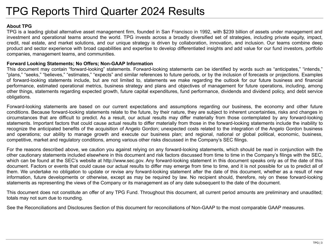 TPG | 3 TPG Reports Third Quarter 2024 Results About TPG TPG is a leading global alternative asset management firm, founded in San Francisco in 1992, with $239 billion of assets under management and investment and operational teams around the world. TPG invests across a broadly diversified set of strategies, including private equity, impact, credit, real estate, and market solutions, and our unique strategy is driven by collaboration, innovation, and inclusion. Our teams combine deep product and sector experience with broad capabilities and expertise to develop differentiated insights and add value for our fund investors, portfolio companies, management teams, and communities. Forward Looking Statements; No Offers; Non-GAAP Information This document may contain “forward-looking” statements. Forward-looking statements can be identified by words such as “anticipates,” “intends,” “plans,” “seeks,” “believes,” “estimates,” “expects” and similar references to future periods, or by the inclusion of forecasts or projections. Examples of forward-looking statements include, but are not limited to, statements we make regarding the outlook for our future business and financial performance, estimated operational metrics, business strategy and plans and objectives of management for future operations, including, among other things, statements regarding expected growth, future capital expenditures, fund performance, dividends and dividend policy, and debt service obligations. Forward-looking statements are based on our current expectations and assumptions regarding our business, the economy and other future conditions. Because forward-looking statements relate to the future, by their nature, they are subject to inherent uncertainties, risks and changes in circumstances that are difficult to predict. As a result, our actual results may differ materially from those contemplated by any forward-looking statements. Important factors that could cause actual results to differ materially from those in the forward-looking statements include the inability to recognize the anticipated benefits of the acquisition of Angelo Gordon; unexpected costs related to the integration of the Angelo Gordon business and operations; our ability to manage growth and execute our business plan; and regional, national or global political, economic, business, competitive, market and regulatory conditions, among various other risks discussed in the Company’s SEC filings. For the reasons described above, we caution you against relying on any forward-looking statements, which should be read in conjunction with the other cautionary statements included elsewhere in this document and risk factors discussed from time to time in the Company’s filings with the SEC, which can be found at the SEC’s website at http://www.sec.gov. Any forward-looking statement in this document speaks only as of the date of this document. Factors or events that could cause our actual results to differ may emerge from time to time, and it is not possible for us to predict all of them. We undertake no obligation to update or revise any forward-looking statement after the date of this document, whether as a result of new information, future developments or otherwise, except as may be required by law. No recipient should, therefore, rely on these forward-looking statements as representing the views of the Company or its management as of any date subsequent to the date of the document. This document does not constitute an offer of any TPG Fund. Throughout this document, all current period amounts are preliminary and unaudited; totals may not sum due to rounding. See the Reconciliations and Disclosures Section of this document for reconciliations of Non-GAAP to the most comparable GAAP measures.