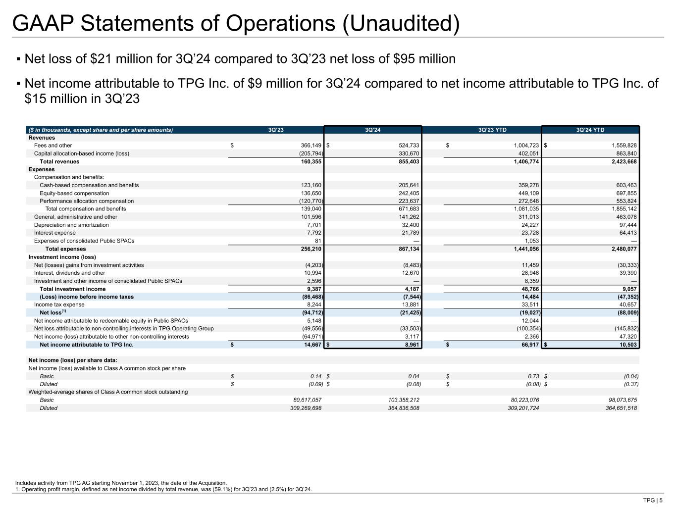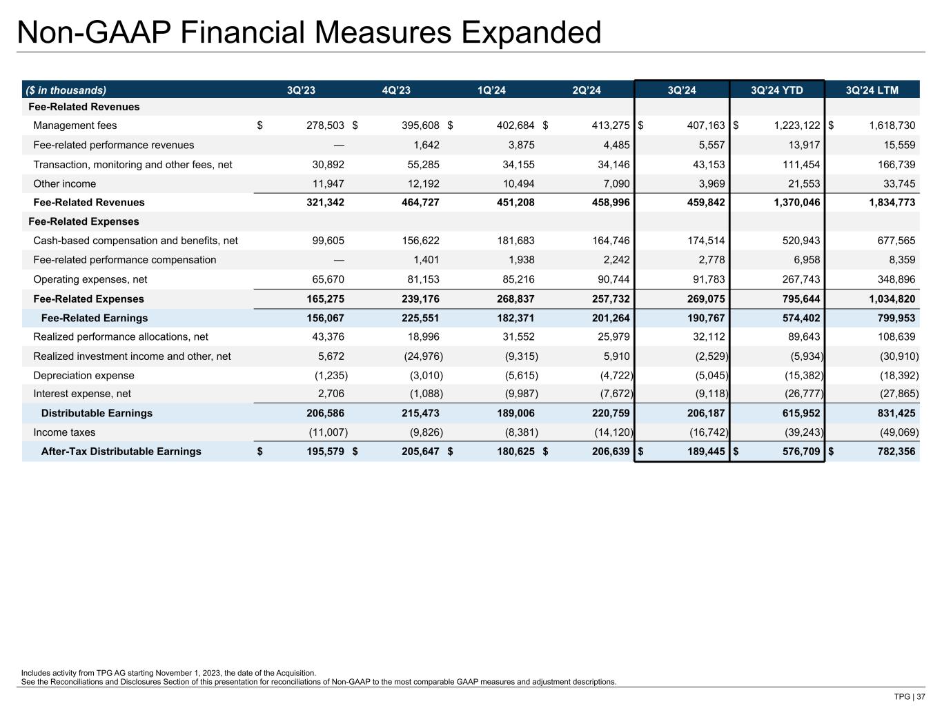 TPG | 36 GAAP Statements of Operations Expanded (Unaudited) ($ in thousands) 3Q’23 4Q’23 1Q’24 2Q’24 3Q’24 3Q’24 YTD 3Q’24 LTM Revenues Fees and other $ 366,149 $ 529,903 $ 512,295 $ 522,800 $ 524,733 $ 1,559,828 $ 2,089,731 Capital allocation-based income (loss) (205,794) 453,234 311,776 221,394 330,670 863,840 1,317,074 Total revenues 160,355 983,137 824,071 744,194 855,403 2,423,668 3,406,805 Expenses Compensation and benefits: Cash-based compensation and benefits 123,160 188,099 206,336 191,486 205,641 603,463 791,562 Equity-based compensation 136,650 205,813 227,908 227,542 242,405 697,855 903,668 Performance allocation compensation (120,770) 319,028 196,434 133,753 223,637 553,824 872,852 Total compensation and benefits 139,040 712,940 630,678 552,781 671,683 1,855,142 2,568,082 General, administrative and other 101,596 171,561 151,632 170,184 141,262 463,078 634,639 Depreciation and amortization 7,701 23,446 32,965 32,079 32,400 97,444 120,890 Interest expense 7,792 14,800 21,122 21,502 21,789 64,413 79,213 Expenses of consolidated Public SPACs 81 — — — — — — Total expenses 256,210 922,747 836,397 776,546 867,134 2,480,077 3,402,824 Investment income (loss) Net gains (losses) from investment activities (4,203) (4,895) (5,198) (16,652) (8,483) (30,333) (35,228) Interest, dividends and other 10,994 13,674 12,904 13,816 12,670 39,390 53,064 Investment and other income of consolidated Public SPACs 2,596 — — — — — — Total investment income (loss) 9,387 8,779 7,706 (2,836) 4,187 9,057 17,836 Income (loss) before income taxes (86,468) 69,169 (4,620) (35,188) (7,544) (47,352) 21,817 Income tax expense 8,244 26,757 4,386 22,390 13,881 40,657 67,414 Net income (loss) (94,712) 42,412 (9,006) (57,578) (21,425) (88,009) (45,597) Net income attributable to redeemable equity in Public SPACs 5,148 — — — — — — Net income (loss) attributable to non-controlling interests in TPG Operating Group (49,556) 7,943 (55,037) (57,292) (33,503) (145,832) (137,889) Net income (loss) attributable to other non-controlling interests (64,971) 21,296 30,512 13,691 3,117 47,320 68,616 Net income attributable to TPG Inc. $ 14,667 $ 13,173 $ 15,519 $ (13,977) $ 8,961 $ 10,503 $ 23,676 Includes activity from TPG AG starting November 1, 2023, the date of the Acquisition.