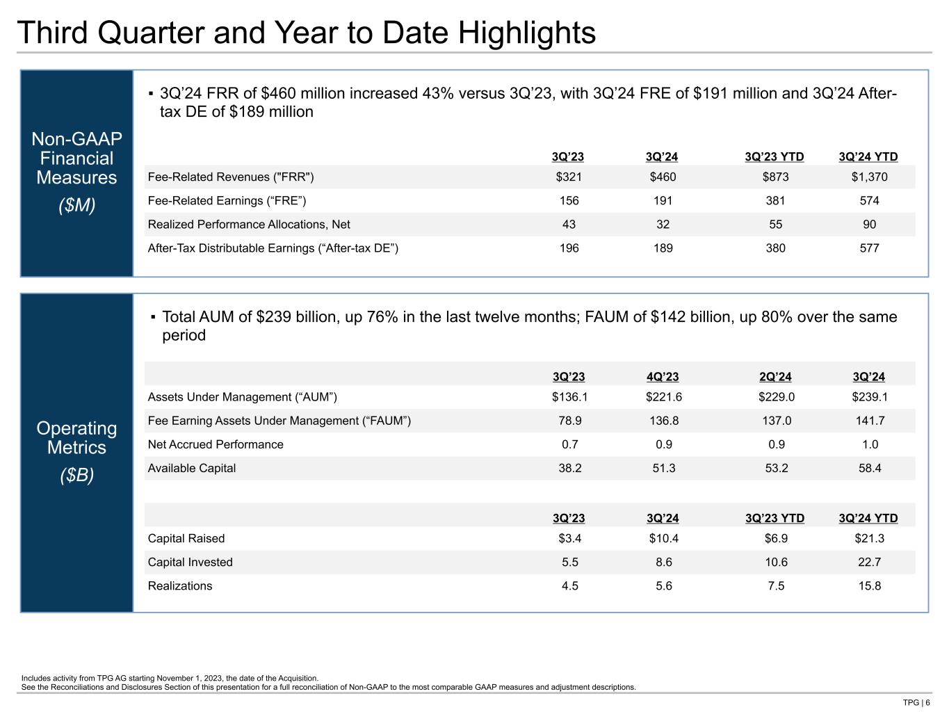 TPG | 5 ▪ Net loss of $21 million for 3Q’24 compared to 3Q’23 net loss of $95 million ▪ Net income attributable to TPG Inc. of $9 million for 3Q’24 compared to net income attributable to TPG Inc. of $15 million in 3Q’23 GAAP Statements of Operations (Unaudited) Includes activity from TPG AG starting November 1, 2023, the date of the Acquisition. 1. Operating profit margin, defined as net income divided by total revenue, was (59.1%) for 3Q’23 and (2.5%) for 3Q’24. ($ in thousands, except share and per share amounts) 3Q’23 3Q’24 3Q’23 YTD 3Q’24 YTD Revenues Fees and other $ 366,149 $ 524,733 $ 1,004,723 $ 1,559,828 Capital allocation-based income (loss) (205,794) 330,670 402,051 863,840 Total revenues 160,355 855,403 1,406,774 2,423,668 Expenses Compensation and benefits: Cash-based compensation and benefits 123,160 205,641 359,278 603,463 Equity-based compensation 136,650 242,405 449,109 697,855 Performance allocation compensation (120,770) 223,637 272,648 553,824 Total compensation and benefits 139,040 671,683 1,081,035 1,855,142 General, administrative and other 101,596 141,262 311,013 463,078 Depreciation and amortization 7,701 32,400 24,227 97,444 Interest expense 7,792 21,789 23,728 64,413 Expenses of consolidated Public SPACs 81 — 1,053 — Total expenses 256,210 867,134 1,441,056 2,480,077 Investment income (loss) Net (losses) gains from investment activities (4,203) (8,483) 11,459 (30,333) Interest, dividends and other 10,994 12,670 28,948 39,390 Investment and other income of consolidated Public SPACs 2,596 — 8,359 — Total investment income 9,387 4,187 48,766 9,057 (Loss) income before income taxes (86,468) (7,544) 14,484 (47,352) Income tax expense 8,244 13,881 33,511 40,657 Net loss(1) (94,712) (21,425) (19,027) (88,009) Net income attributable to redeemable equity in Public SPACs 5,148 — 12,044 — Net loss attributable to non-controlling interests in TPG Operating Group (49,556) (33,503) (100,354) (145,832) Net income (loss) attributable to other non-controlling interests (64,971) 3,117 2,366 47,320 Net income attributable to TPG Inc. $ 14,667 $ 8,961 $ 66,917 $ 10,503 Net income (loss) per share data: Net income (loss) available to Class A common stock per share Basic $ 0.14 $ 0.04 $ 0.73 $ (0.04) Diluted $ (0.09) $ (0.08) $ (0.08) $ (0.37) Weighted-average shares of Class A common stock outstanding Basic 80,617,057 103,358,212 80,223,076 98,073,675 Diluted 309,269,698 364,836,508 309,201,724 364,651,518