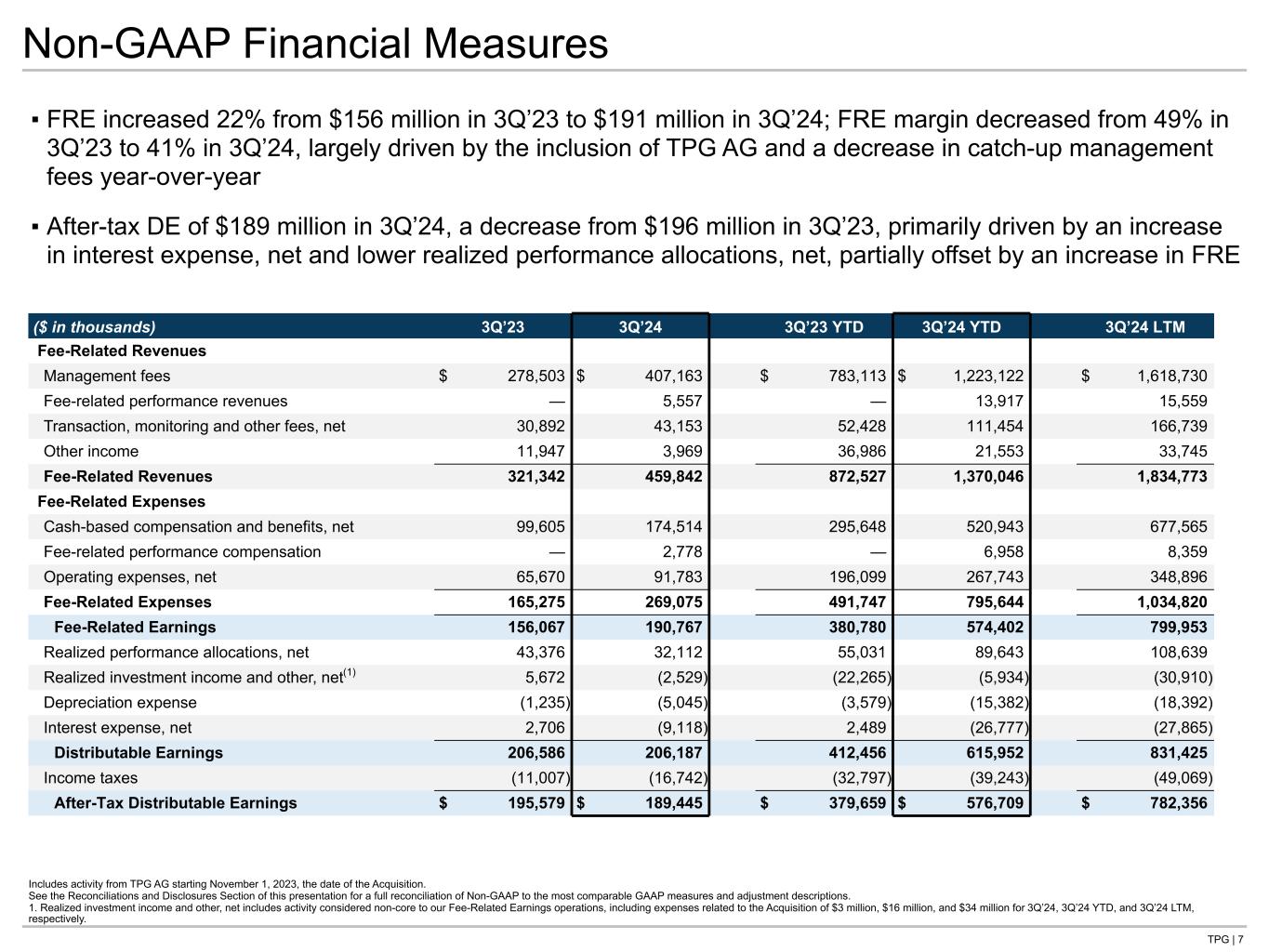 TPG | 6 Operating Metrics ($B) Non-GAAP Financial Measures ($M) Third Quarter and Year to Date Highlights 3Q’23 3Q’24 3Q’23 YTD 3Q’24 YTD Fee-Related Revenues ("FRR") $321 $460 $873 $1,370 Fee-Related Earnings (“FRE”) 156 191 381 574 Realized Performance Allocations, Net 43 32 55 90 After-Tax Distributable Earnings (“After-tax DE”) 196 189 380 577 3Q’23 4Q’23 2Q’24 3Q’24 Assets Under Management (“AUM”) $136.1 $221.6 $229.0 $239.1 Fee Earning Assets Under Management (“FAUM”) 78.9 136.8 137.0 141.7 Net Accrued Performance 0.7 0.9 0.9 1.0 Available Capital 38.2 51.3 53.2 58.4 3Q’23 3Q’24 3Q’23 YTD 3Q’24 YTD Capital Raised $3.4 $10.4 $6.9 $21.3 Capital Invested 5.5 8.6 10.6 22.7 Realizations 4.5 5.6 7.5 15.8 ▪ 3Q’24 FRR of $460 million increased 43% versus 3Q’23, with 3Q’24 FRE of $191 million and 3Q’24 After- tax DE of $189 million ▪ Total AUM of $239 billion, up 76% in the last twelve months; FAUM of $142 billion, up 80% over the same period Includes activity from TPG AG starting November 1, 2023, the date of the Acquisition. See the Reconciliations and Disclosures Section of this presentation for a full reconciliation of Non-GAAP to the most comparable GAAP measures and adjustment descriptions.