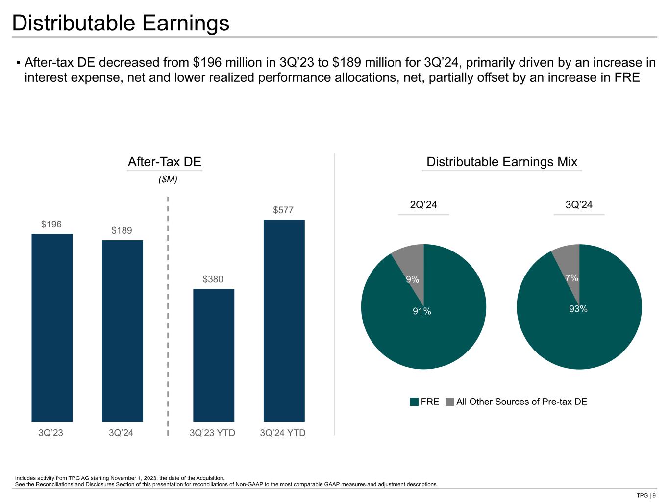 TPG | 8 $156 $191 3Q’23 3Q’24 $381 $574 3Q’23 YTD 3Q’24 YTD $783 $1,223 $353 $397 $112 $125 $148 $145 $229 $154 $115 $106 $56 $67 3Q’23 YTD 3Q’24 YTD $279 $407 $134 $121 $38 $46 $49 $49 $77 $50 $36 $36 $21 $28 3Q’23 3Q’24 ▪ 3Q’24 FRR increased 43% over 3Q’23, primarily driven by TPG AG and an increase in capital markets fees ▪ Fee-related expenses in 3Q’24 increased 63% over 3Q’23, primarily due to the addition of TPG AG ▪ FRE margin decreased from 49% in 3Q’23 to 41% in 3Q’24, largely driven by the inclusion of TPG AG and a decrease in catch-up management fees year-over-year; 3Q’24 LTM FRE margin of 44% Includes activity from TPG AG starting November 1, 2023, the date of the Acquisition. See the Reconciliations and Disclosures Section of this presentation for reconciliations of Non-GAAP to the most comparable GAAP measures and adjustment descriptions. 1. Catch-up management fees totaled $25 million and $15 million for 3Q’23 and 3Q’24, respectively. Fee-Related Earnings Management Fees by Platform(1) ($M) ($M) +46% Capital Growth Impact TPG AG Credit +56% TPG AG Real Estate Real Estate Market Solutions Fee-Related Earnings
