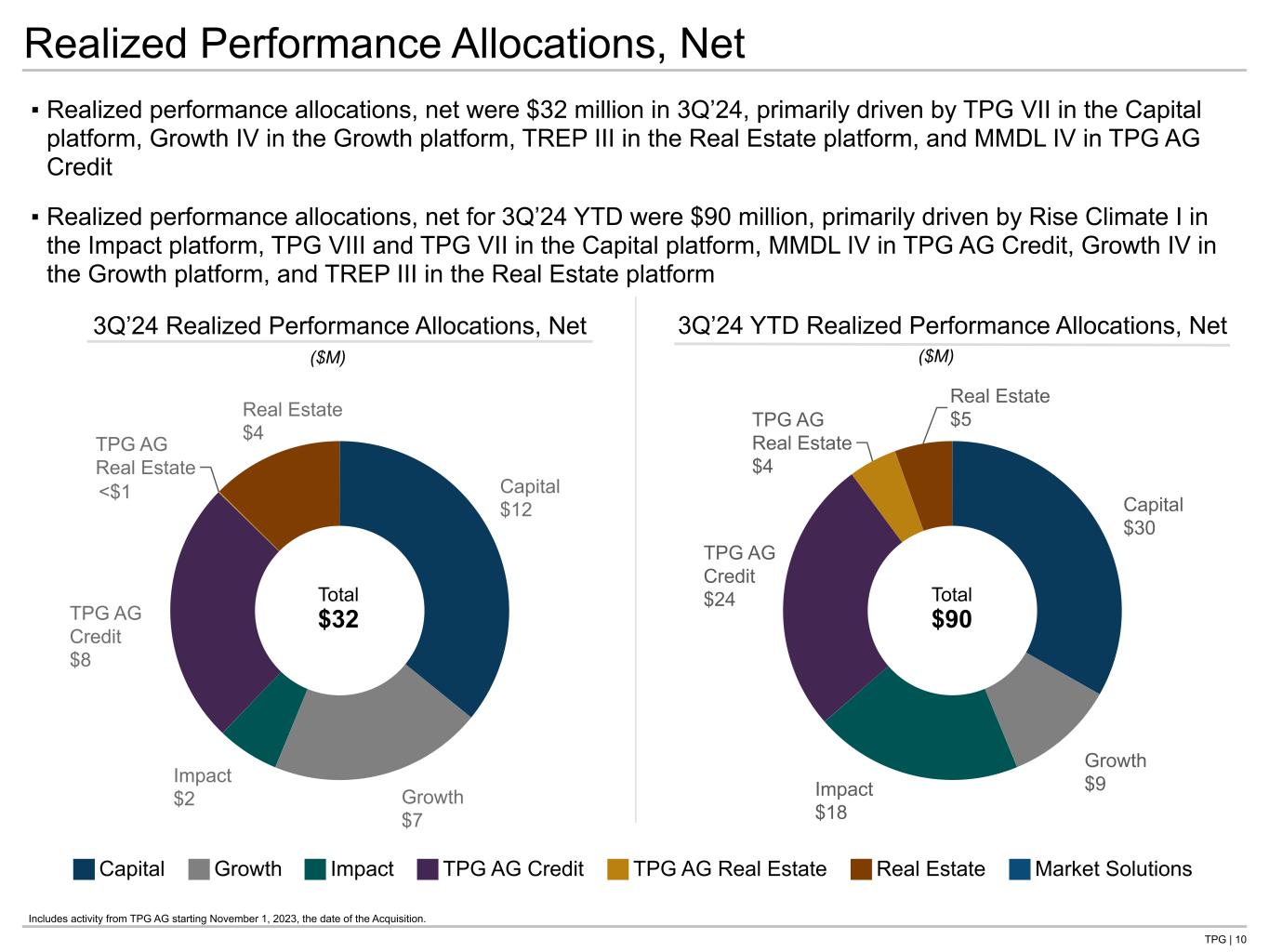 TPG | 9 $196 $189 3Q’23 3Q’24 $380 $577 3Q’23 YTD 3Q’24 YTD Distributable Earnings ▪ After-tax DE decreased from $196 million in 3Q’23 to $189 million for 3Q’24, primarily driven by an increase in interest expense, net and lower realized performance allocations, net, partially offset by an increase in FRE After-Tax DE ($M) Includes activity from TPG AG starting November 1, 2023, the date of the Acquisition. See the Reconciliations and Disclosures Section of this presentation for reconciliations of Non-GAAP to the most comparable GAAP measures and adjustment descriptions. Distributable Earnings Mix FRE All Other Sources of Pre-tax DE 91% 9% 93% 7% 2Q’24 3Q’24