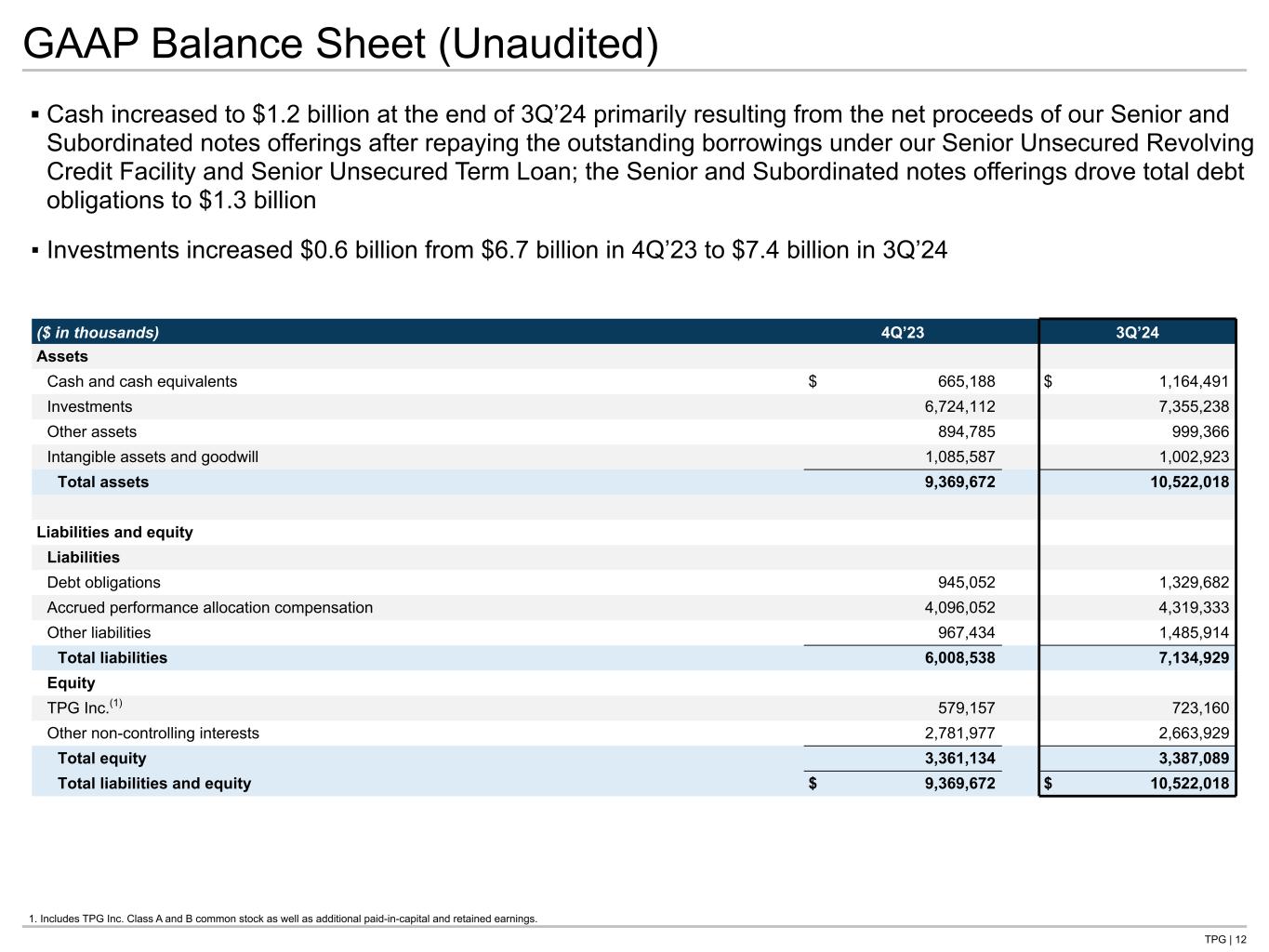 TPG | 12 GAAP Balance Sheet (Unaudited) ▪ Cash increased to $1.2 billion at the end of 3Q’24 primarily resulting from the net proceeds of our Senior and Subordinated notes offerings after repaying the outstanding borrowings under our Senior Unsecured Revolving Credit Facility and Senior Unsecured Term Loan; the Senior and Subordinated notes offerings drove total debt obligations to $1.3 billion ▪ Investments increased $0.6 billion from $6.7 billion in 4Q’23 to $7.4 billion in 3Q’24 1. Includes TPG Inc. Class A and B common stock as well as additional paid-in-capital and retained earnings. ($ in thousands) 4Q’23 3Q’24 Assets Cash and cash equivalents $ 665,188 $ 1,164,491 Investments 6,724,112 7,355,238 Other assets 894,785 999,366 Intangible assets and goodwill 1,085,587 1,002,923 Total assets 9,369,672 10,522,018 Liabilities and equity Liabilities Debt obligations 945,052 1,329,682 Accrued performance allocation compensation 4,096,052 4,319,333 Other liabilities 967,434 1,485,914 Total liabilities 6,008,538 7,134,929 Equity TPG Inc.(1) 579,157 723,160 Other non-controlling interests 2,781,977 2,663,929 Total equity 3,361,134 3,387,089 Total liabilities and equity $ 9,369,672 $ 10,522,018