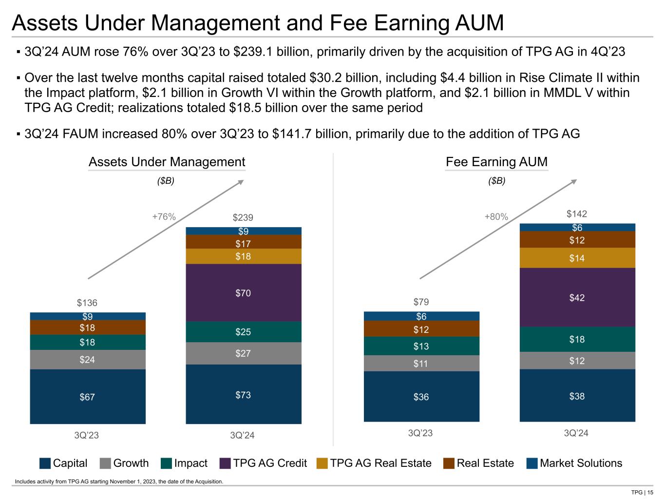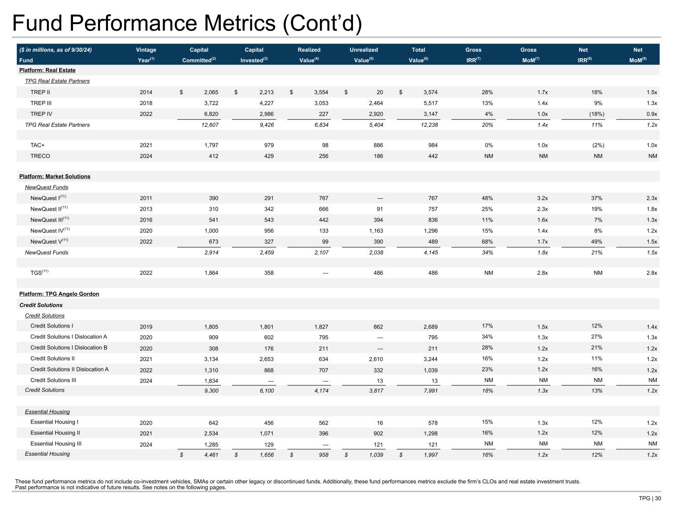 TPG | 30 Fund Performance Metrics (Cont’d) These fund performance metrics do not include co-investment vehicles, SMAs or certain other legacy or discontinued funds. Additionally, these fund performances metrics exclude the firm’s CLOs and real estate investment trusts. Past performance is not indicative of future results. See notes on the following pages. ($ in millions, as of 9/30/24) Vintage Capital Capital Realized Unrealized Total Gross Gross Net Net Fund Year(1) Committed(2) Invested(3) Value(4) Value(5) Value(6) IRR(7) MoM(7) IRR(8) MoM(9) Platform: Real Estate TPG Real Estate Partners TREP II 2014 $ 2,065 $ 2,213 $ 3,554 $ 20 $ 3,574 28% 1.7x 18% 1.5x TREP III 2018 3,722 4,227 3,053 2,464 5,517 13% 1.4x 9% 1.3x TREP IV 2022 6,820 2,986 227 2,920 3,147 4% 1.0x (18%) 0.9x TPG Real Estate Partners 12,607 9,426 6,834 5,404 12,238 20% 1.4x 11% 1.2x TAC+ 2021 1,797 979 98 886 984 0% 1.0x (2%) 1.0x TRECO 2024 412 429 256 186 442 NM NM NM NM Platform: Market Solutions NewQuest Funds NewQuest I(11) 2011 390 291 767 — 767 48% 3.2x 37% 2.3x NewQuest II(11) 2013 310 342 666 91 757 25% 2.3x 19% 1.8x NewQuest III(11) 2016 541 543 442 394 836 11% 1.6x 7% 1.3x NewQuest IV(11) 2020 1,000 956 133 1,163 1,296 15% 1.4x 8% 1.2x NewQuest V(11) 2022 673 327 99 390 489 68% 1.7x 49% 1.5x NewQuest Funds 2,914 2,459 2,107 2,038 4,145 34% 1.8x 21% 1.5x TGS(11) 2022 1,864 358 — 486 486 NM 2.8x NM 2.8x Platform: TPG Angelo Gordon Credit Solutions Credit Solutions Credit Solutions I 2019 1,805 1,801 1,827 862 2,689 17% 1.5x 12% 1.4x Credit Solutions I Dislocation A 2020 909 602 795 — 795 34% 1.3x 27% 1.3x Credit Solutions I Dislocation B 2020 308 176 211 — 211 28% 1.2x 21% 1.2x Credit Solutions II 2021 3,134 2,653 634 2,610 3,244 16% 1.2x 11% 1.2x Credit Solutions II Dislocation A 2022 1,310 868 707 332 1,039 23% 1.2x 16% 1.2x Credit Solutions III 2024 1,834 — — 13 13 NM NM NM NM Credit Solutions 9,300 6,100 4,174 3,817 7,991 18% 1.3x 13% 1.2x Essential Housing Essential Housing I 2020 642 456 562 16 578 15% 1.3x 12% 1.2x Essential Housing II 2021 2,534 1,071 396 902 1,298 16% 1.2x 12% 1.2x Essential Housing III 2024 1,285 129 — 121 121 NM NM NM NM Essential Housing $ 4,461 $ 1,656 $ 958 $ 1,039 $ 1,997 16% 1.2x 12% 1.2x