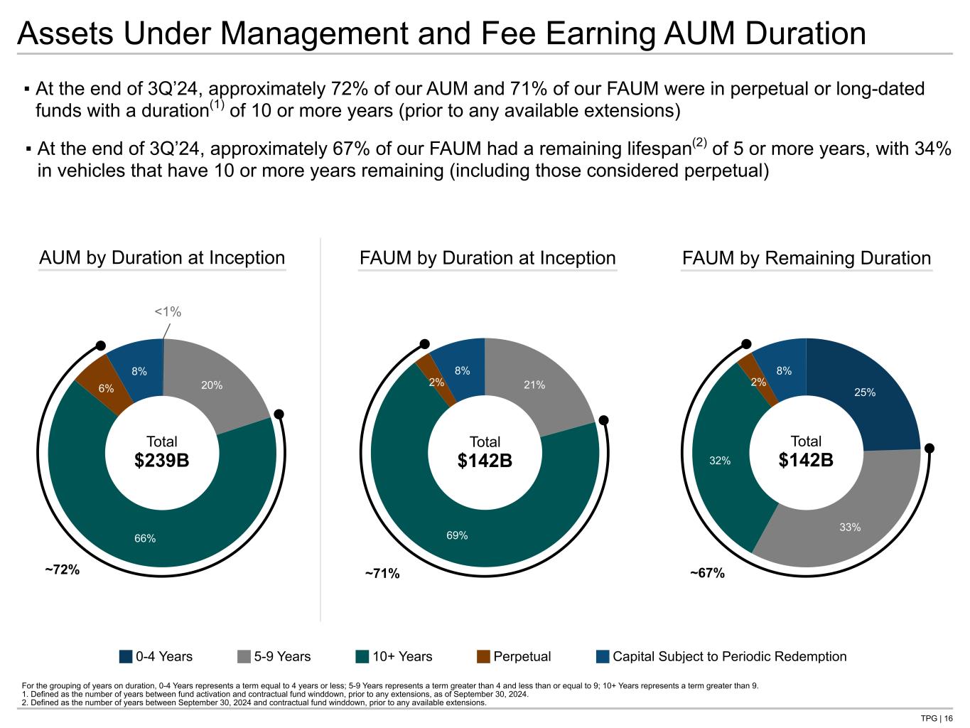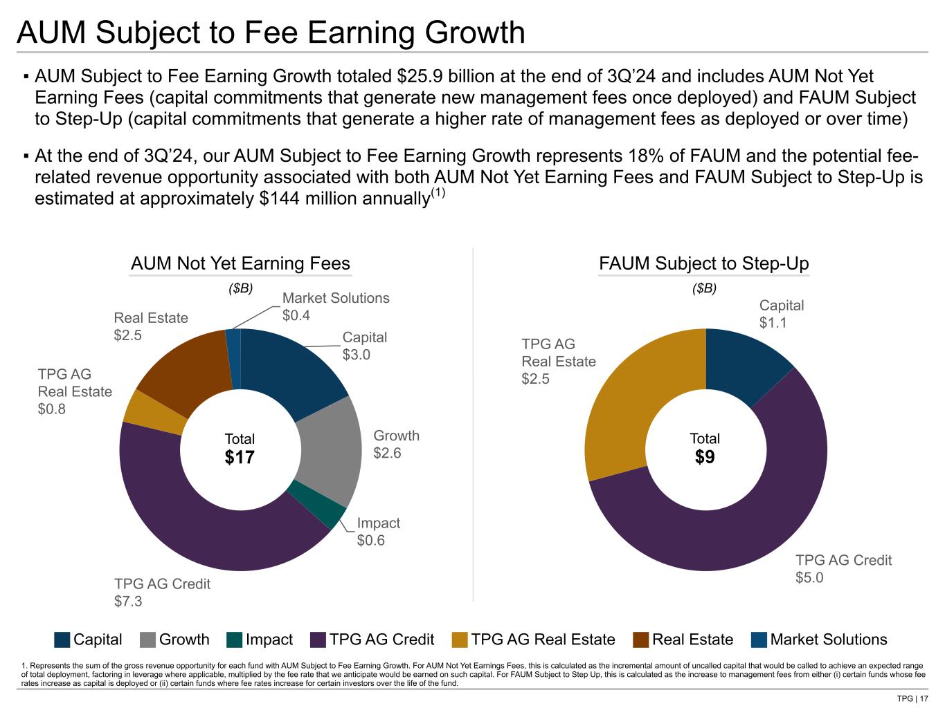 TPG | 16 25% 33% 32% 2% 8% —% 20% 66% 6% 8% FAUM by Remaining Duration Assets Under Management and Fee Earning AUM Duration AUM by Duration at Inception For the grouping of years on duration, 0-4 Years represents a term equal to 4 years or less; 5-9 Years represents a term greater than 4 and less than or equal to 9; 10+ Years represents a term greater than 9. 1. Defined as the number of years between fund activation and contractual fund winddown, prior to any extensions, as of September 30, 2024. 2. Defined as the number of years between September 30, 2024 and contractual fund winddown, prior to any available extensions. ▪ At the end of 3Q’24, approximately 72% of our AUM and 71% of our FAUM were in perpetual or long-dated funds with a duration(1) of 10 or more years (prior to any available extensions) ▪ At the end of 3Q’24, approximately 67% of our FAUM had a remaining lifespan(2) of 5 or more years, with 34% in vehicles that have 10 or more years remaining (including those considered perpetual) Total $239B Total $142B FAUM by Duration at Inception Total $142B ~71% ~67%~72% 0-4 Years 5-9 Years 10+ Years Perpetual Capital Subject to Periodic Redemption <1 21% 69% 2% 8%