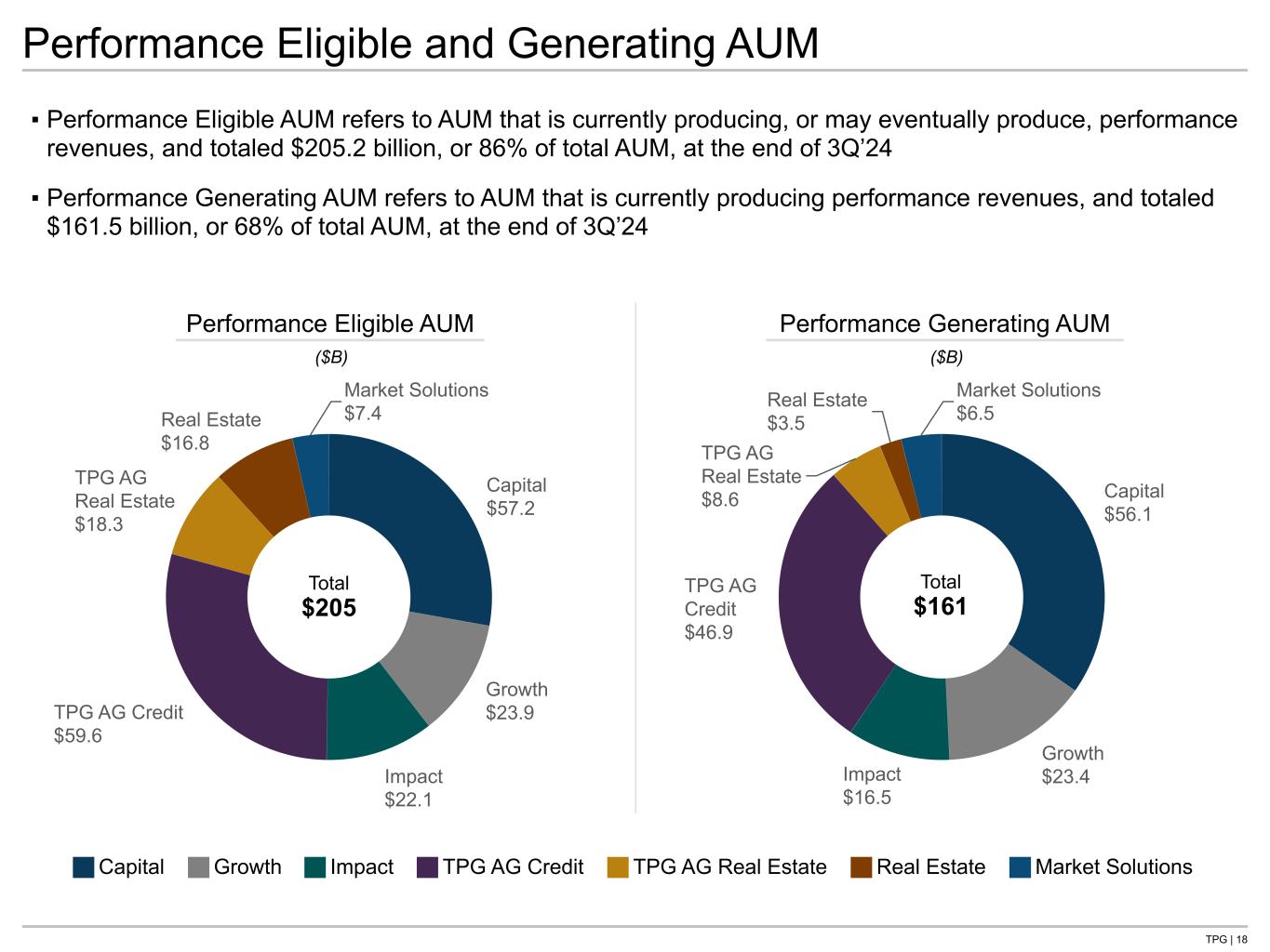 TPG | 17 Capital $1.1 TPG AG Credit $5.0 TPG AG Real Estate $2.5 Capital $3.0 Growth $2.6 Impact $0.6 TPG AG Credit $7.3 TPG AG Real Estate $0.8 Real Estate $2.5 Market Solutions $0.4 ▪ AUM Subject to Fee Earning Growth totaled $25.9 billion at the end of 3Q’24 and includes AUM Not Yet Earning Fees (capital commitments that generate new management fees once deployed) and FAUM Subject to Step-Up (capital commitments that generate a higher rate of management fees as deployed or over time) ▪ At the end of 3Q’24, our AUM Subject to Fee Earning Growth represents 18% of FAUM and the potential fee- related revenue opportunity associated with both AUM Not Yet Earning Fees and FAUM Subject to Step-Up is estimated at approximately $144 million annually(1) AUM Not Yet Earning Fees FAUM Subject to Step-Up ($B) ($B) Total $17 Total $9 AUM Subject to Fee Earning Growth 1. Represents the sum of the gross revenue opportunity for each fund with AUM Subject to Fee Earning Growth. For AUM Not Yet Earnings Fees, this is calculated as the incremental amount of uncalled capital that would be called to achieve an expected range of total deployment, factoring in leverage where applicable, multiplied by the fee rate that we anticipate would be earned on such capital. For FAUM Subject to Step Up, this is calculated as the increase to management fees from either (i) certain funds whose fee rates increase as capital is deployed or (ii) certain funds where fee rates increase for certain investors over the life of the fund. Capital Growth Impact TPG AG Credit TPG AG Real Estate Real Estate Market Solutions