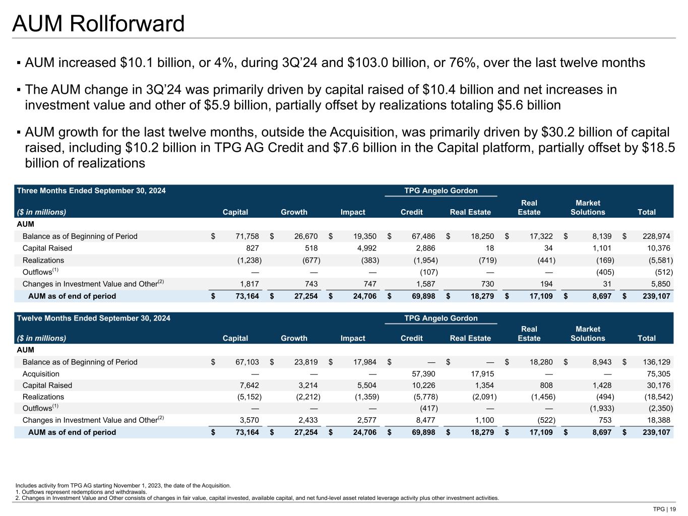 TPG | 18 Capital $56.1 Growth $23.4Impact $16.5 TPG AG Credit $46.9 TPG AG Real Estate $8.6 Real Estate $3.5 Market Solutions $6.5 Capital $57.2 Growth $23.9 Impact $22.1 TPG AG Credit $59.6 TPG AG Real Estate $18.3 Real Estate $16.8 Market Solutions $7.4 ▪ Performance Eligible AUM refers to AUM that is currently producing, or may eventually produce, performance revenues, and totaled $205.2 billion, or 86% of total AUM, at the end of 3Q’24 ▪ Performance Generating AUM refers to AUM that is currently producing performance revenues, and totaled $161.5 billion, or 68% of total AUM, at the end of 3Q’24 Performance Eligible AUM Performance Generating AUM ($B) ($B) Total $205 Total $161 Performance Eligible and Generating AUM Capital Growth Impact TPG AG Credit TPG AG Real Estate Real Estate Market Solutions