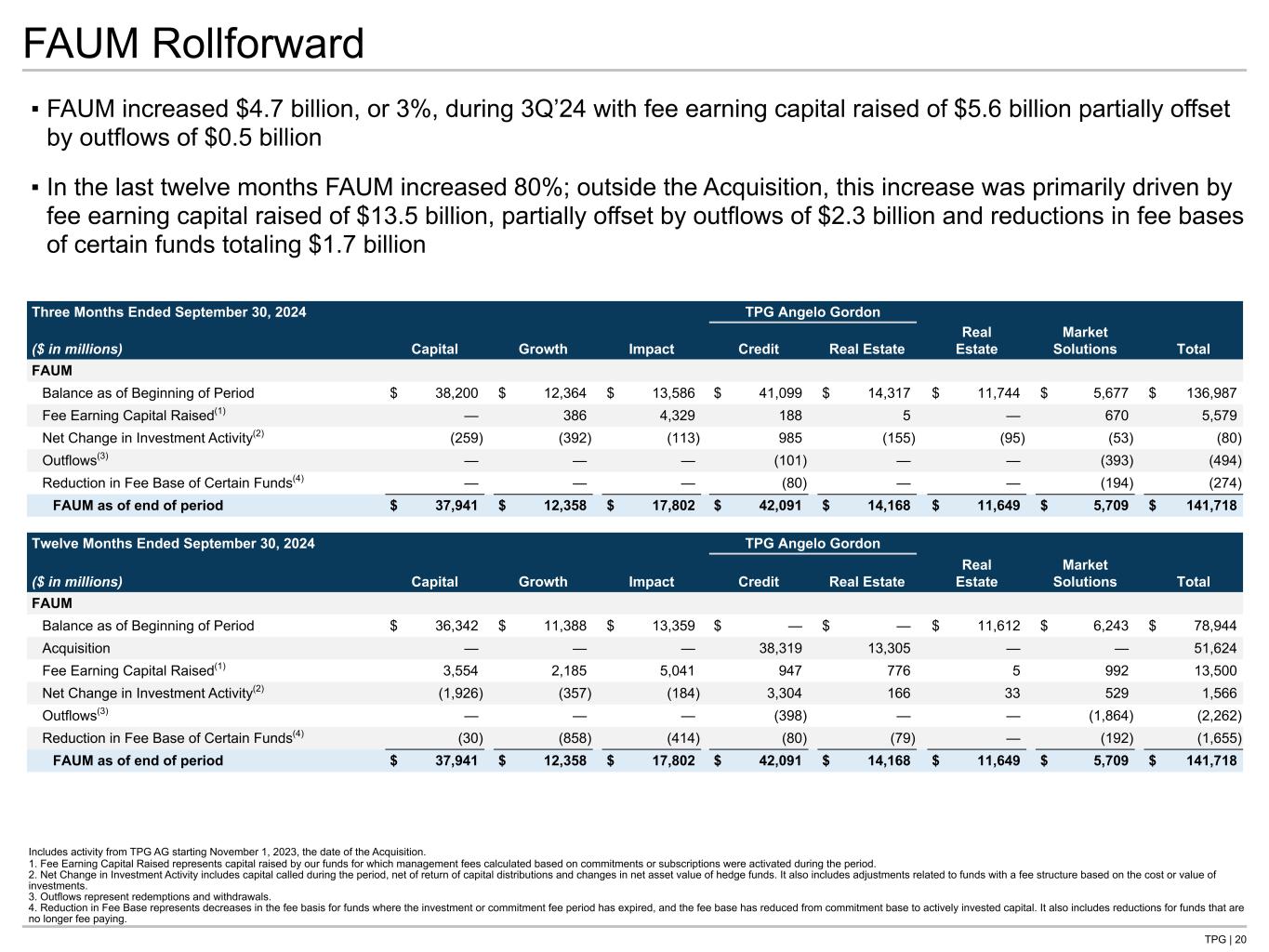 TPG | 19 AUM Rollforward Includes activity from TPG AG starting November 1, 2023, the date of the Acquisition. 1. Outflows represent redemptions and withdrawals. 2. Changes in Investment Value and Other consists of changes in fair value, capital invested, available capital, and net fund-level asset related leverage activity plus other investment activities. ▪ AUM increased $10.1 billion, or 4%, during 3Q’24 and $103.0 billion, or 76%, over the last twelve months ▪ The AUM change in 3Q’24 was primarily driven by capital raised of $10.4 billion and net increases in investment value and other of $5.9 billion, partially offset by realizations totaling $5.6 billion ▪ AUM growth for the last twelve months, outside the Acquisition, was primarily driven by $30.2 billion of capital raised, including $10.2 billion in TPG AG Credit and $7.6 billion in the Capital platform, partially offset by $18.5 billion of realizations Three Months Ended September 30, 2024 TPG Angelo Gordon ($ in millions) Capital Growth Impact Credit Real Estate Real Estate Market Solutions Total AUM Balance as of Beginning of Period $ 71,758 $ 26,670 $ 19,350 $ 67,486 $ 18,250 $ 17,322 $ 8,139 $ 228,974 Capital Raised 827 518 4,992 2,886 18 34 1,101 10,376 Realizations (1,238) (677) (383) (1,954) (719) (441) (169) (5,581) Outflows(1) — — — (107) — — (405) (512) Changes in Investment Value and Other(2) 1,817 743 747 1,587 730 194 31 5,850 AUM as of end of period $ 73,164 $ 27,254 $ 24,706 $ 69,898 $ 18,279 $ 17,109 $ 8,697 $ 239,107 Twelve Months Ended September 30, 2024 TPG Angelo Gordon ($ in millions) Capital Growth Impact Credit Real Estate Real Estate Market Solutions Total AUM Balance as of Beginning of Period $ 67,103 $ 23,819 $ 17,984 $ — $ — $ 18,280 $ 8,943 $ 136,129 Acquisition — — — 57,390 17,915 — — 75,305 Capital Raised 7,642 3,214 5,504 10,226 1,354 808 1,428 30,176 Realizations (5,152) (2,212) (1,359) (5,778) (2,091) (1,456) (494) (18,542) Outflows(1) — — — (417) — — (1,933) (2,350) Changes in Investment Value and Other(2) 3,570 2,433 2,577 8,477 1,100 (522) 753 18,388 AUM as of end of period $ 73,164 $ 27,254 $ 24,706 $ 69,898 $ 18,279 $ 17,109 $ 8,697 $ 239,107