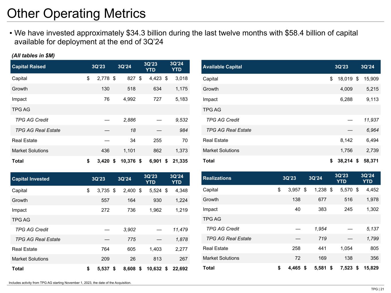 TPG | 21 Other Operating Metrics Capital Raised 3Q’23 3Q’24 3Q’23 YTD 3Q’24 YTD Capital $ 2,778 $ 827 $ 4,423 $ 3,018 Growth 130 518 634 1,175 Impact 76 4,992 727 5,183 TPG AG TPG AG Credit — 2,886 — 9,532 TPG AG Real Estate — 18 — 984 Real Estate — 34 255 70 Market Solutions 436 1,101 862 1,373 Total $ 3,420 $ 10,376 $ 6,901 $ 21,335 ▪ We have invested approximately $34.3 billion during the last twelve months with $58.4 billion of capital available for deployment at the end of 3Q’24 Available Capital 3Q’23 3Q’24 Capital $ 18,019 $ 15,909 Growth 4,009 5,215 Impact 6,288 9,113 TPG AG TPG AG Credit — 11,937 TPG AG Real Estate — 6,964 Real Estate 8,142 6,494 Market Solutions 1,756 2,739 Total $ 38,214 $ 58,371 Capital Invested 3Q’23 3Q’24 3Q’23 YTD 3Q’24 YTD Capital $ 3,735 $ 2,400 $ 5,524 $ 4,348 Growth 557 164 930 1,224 Impact 272 736 1,962 1,219 TPG AG TPG AG Credit — 3,902 — 11,479 TPG AG Real Estate — 775 — 1,878 Real Estate 764 605 1,403 2,277 Market Solutions 209 26 813 267 Total $ 5,537 $ 8,608 $ 10,632 $ 22,692 Realizations 3Q’23 3Q’24 3Q’23 YTD 3Q’24 YTD Capital $ 3,957 $ 1,238 $ 5,570 $ 4,452 Growth 138 677 516 1,978 Impact 40 383 245 1,302 TPG AG TPG AG Credit — 1,954 — 5,137 TPG AG Real Estate — 719 — 1,799 Real Estate 258 441 1,054 805 Market Solutions 72 169 138 356 Total $ 4,465 $ 5,581 $ 7,523 $ 15,829 (All tables in $M) Includes activity from TPG AG starting November 1, 2023, the date of the Acquisition.
