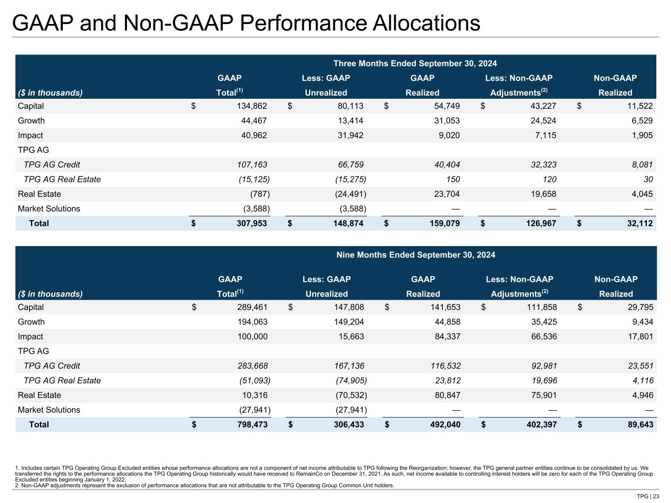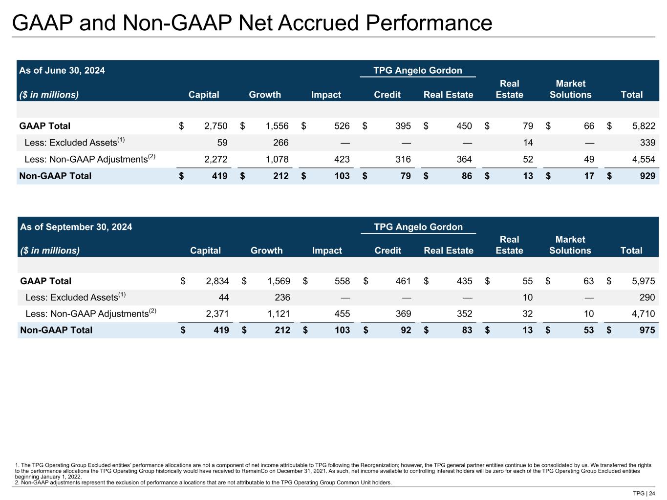 TPG | 23 GAAP and Non-GAAP Performance Allocations 1. Includes certain TPG Operating Group Excluded entities whose performance allocations are not a component of net income attributable to TPG following the Reorganization; however, the TPG general partner entities continue to be consolidated by us. We transferred the rights to the performance allocations the TPG Operating Group historically would have received to RemainCo on December 31, 2021. As such, net income available to controlling interest holders will be zero for each of the TPG Operating Group Excluded entities beginning January 1, 2022. 2. Non-GAAP adjustments represent the exclusion of performance allocations that are not attributable to the TPG Operating Group Common Unit holders. Three Months Ended September 30, 2024 GAAP Less: GAAP GAAP Less: Non-GAAP Non-GAAP ($ in thousands) Total(1) Unrealized Realized Adjustments(2) Realized Capital $ 134,862 $ 80,113 $ 54,749 $ 43,227 $ 11,522 Growth 44,467 13,414 31,053 24,524 6,529 Impact 40,962 31,942 9,020 7,115 1,905 TPG AG TPG AG Credit 107,163 66,759 40,404 32,323 8,081 TPG AG Real Estate (15,125) (15,275) 150 120 30 Real Estate (787) (24,491) 23,704 19,658 4,045 Market Solutions (3,588) (3,588) — — — Total $ 307,953 $ 148,874 $ 159,079 $ 126,967 $ 32,112 Nine Months Ended September 30, 2024 GAAP Less: GAAP GAAP Less: Non-GAAP Non-GAAP ($ in thousands) Total(1) Unrealized Realized Adjustments(2) Realized Capital $ 289,461 $ 147,808 $ 141,653 $ 111,858 $ 29,795 Growth 194,063 149,204 44,858 35,425 9,434 Impact 100,000 15,663 84,337 66,536 17,801 TPG AG TPG AG Credit 283,668 167,136 116,532 92,981 23,551 TPG AG Real Estate (51,093) (74,905) 23,812 19,696 4,116 Real Estate 10,316 (70,532) 80,847 75,901 4,946 Market Solutions (27,941) (27,941) — — — Total $ 798,473 $ 306,433 $ 492,040 $ 402,397 $ 89,643