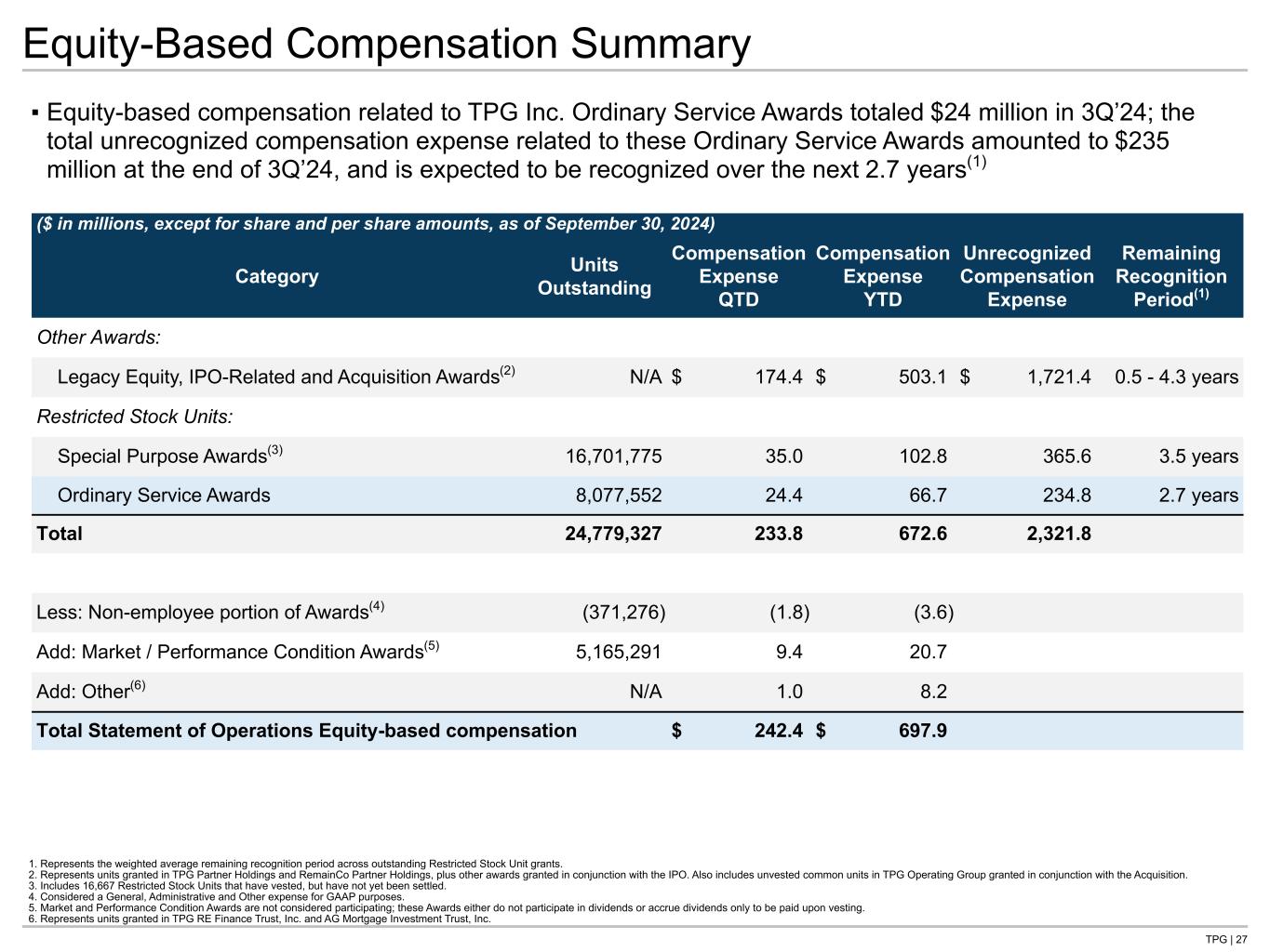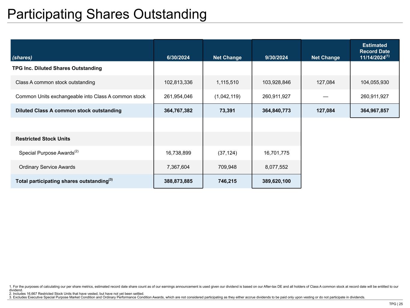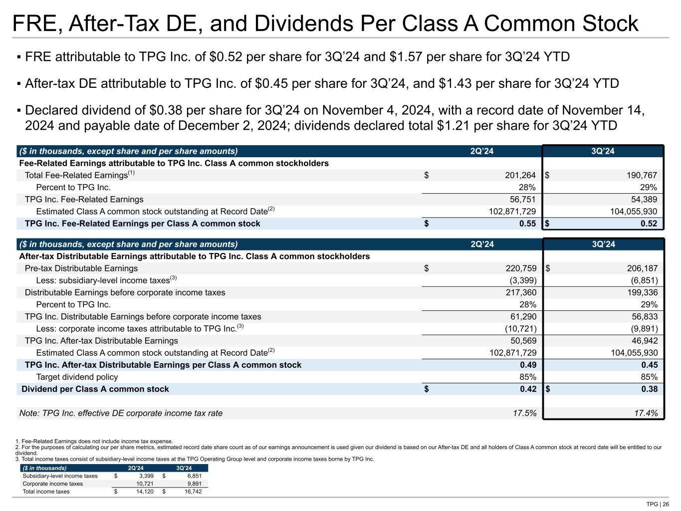 TPG | 25 Participating Shares Outstanding (shares) 6/30/2024 Net Change 9/30/2024 Net Change Estimated Record Date 11/14/2024(1) TPG Inc. Diluted Shares Outstanding Class A common stock outstanding 102,813,336 1,115,510 103,928,846 127,084 104,055,930 Common Units exchangeable into Class A common stock 261,954,046 (1,042,119) 260,911,927 — 260,911,927 Diluted Class A common stock outstanding 364,767,382 73,391 364,840,773 127,084 364,967,857 Restricted Stock Units Special Purpose Awards(2) 16,738,899 (37,124) 16,701,775 Ordinary Service Awards 7,367,604 709,948 8,077,552 Total participating shares outstanding(3) 388,873,885 746,215 389,620,100 1. For the purposes of calculating our per share metrics, estimated record date share count as of our earnings announcement is used given our dividend is based on our After-tax DE and all holders of Class A common stock at record date will be entitled to our dividend. 2. Includes 16,667 Restricted Stock Units that have vested, but have not yet been settled. 3. Excludes Executive Special Purpose Market Condition and Ordinary Performance Condition Awards, which are not considered participating as they either accrue dividends to be paid only upon vesting or do not participate in dividends.