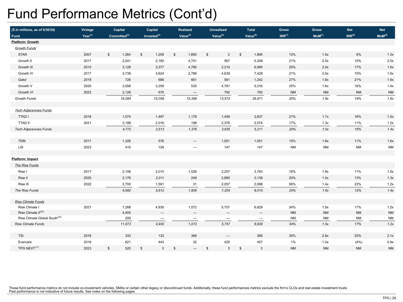 TPG | 29 Fund Performance Metrics (Cont’d) These fund performance metrics do not include co-investment vehicles, SMAs or certain other legacy or discontinued funds. Additionally, these fund performances metrics exclude the firm’s CLOs and real estate investment trusts. Past performance is not indicative of future results. See notes on the following pages. ($ in millions, as of 9/30/24) Vintage Capital Capital Realized Unrealized Total Gross Gross Net Net Fund Year(1) Committed(2) Invested(3) Value(4) Value(5) Value(6) IRR(7) MoM(7) IRR(8) MoM(9) Platform: Growth Growth Funds STAR 2007 $ 1,264 $ 1,259 $ 1,893 $ 2 $ 1,895 12% 1.5x 6% 1.3x Growth II 2011 2,041 2,185 4,741 567 5,308 21% 2.5x 15% 2.0x Growth III 2015 3,128 3,377 4,780 2,210 6,990 25% 2.0x 17% 1.6x Growth IV 2017 3,739 3,624 2,789 4,639 7,428 21% 2.0x 15% 1.6x Gator 2019 726 686 661 581 1,242 27% 1.8x 21% 1.6x Growth V 2020 3,558 3,258 535 4,781 5,316 25% 1.6x 16% 1.4x Growth VI 2023 2,128 670 — 792 792 NM NM NM NM Growth Funds 16,584 15,059 15,399 13,572 28,971 20% 1.9x 14% 1.6x Tech Adjacencies Funds TTAD I 2018 1,574 1,497 1,178 1,459 2,637 21% 1.7x 16% 1.5x TTAD II 2021 3,198 2,016 198 2,376 2,574 17% 1.3x 11% 1.2x Tech Adjacencies Funds 4,772 3,513 1,376 3,835 5,211 20% 1.5x 15% 1.4x TDM 2017 1,326 576 — 1,051 1,051 15% 1.8x 11% 1.6x LSI 2023 410 128 — 147 147 NM NM NM NM Platform: Impact The Rise Funds Rise I 2017 2,106 2,010 1,526 2,257 3,783 18% 1.8x 11% 1.5x Rise II 2020 2,176 2,011 249 2,890 3,139 20% 1.5x 13% 1.3x Rise III 2022 2,700 1,591 31 2,057 2,088 56% 1.4x 23% 1.2x The Rise Funds 6,982 5,612 1,806 7,204 9,010 20% 1.6x 12% 1.4x Rise Climate Funds Rise Climate I 2021 7,268 4,930 1,072 5,757 6,829 34% 1.5x 17% 1.2x Rise Climate II(20) 4,405 — — — — NM NM NM NM Rise Climate Global South(20) 200 — — — — NM NM NM NM Rise Climate Funds 11,873 4,930 1,072 5,757 6,829 34% 1.5x 17% 1.2x TSI 2018 333 133 368 — 368 35% 2.8x 25% 2.1x Evercare 2019 621 443 32 425 457 1% 1.0x (4%) 0.9x TPG NEXT(11) 2023 $ 520 $ 3 $ — $ 3 $ 3 NM NM NM NM