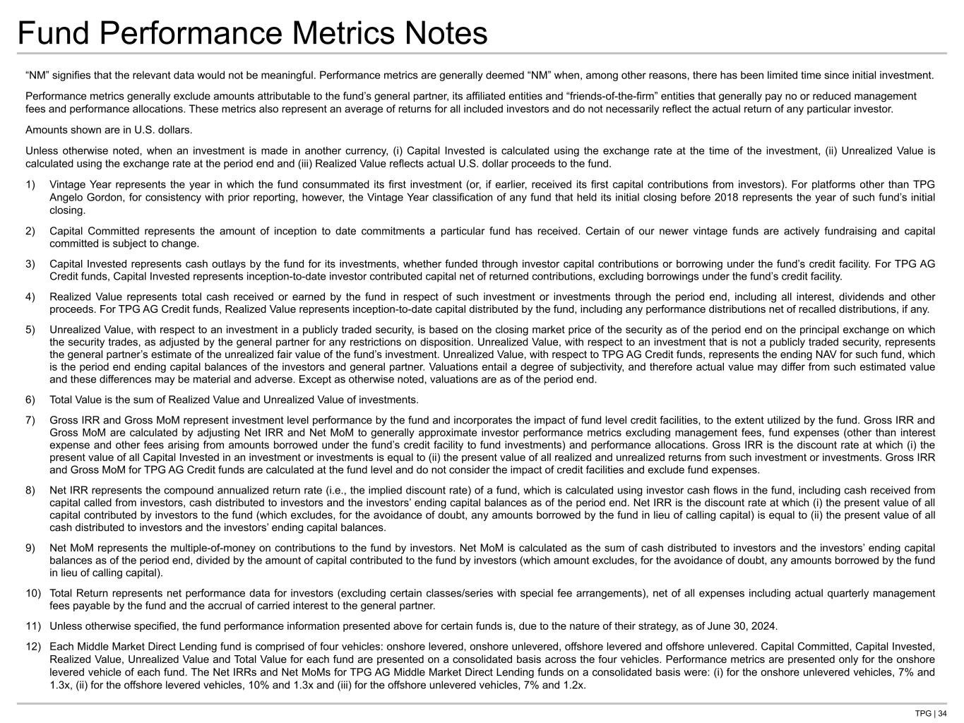 TPG | 34 Fund Performance Metrics Notes “NM” signifies that the relevant data would not be meaningful. Performance metrics are generally deemed “NM” when, among other reasons, there has been limited time since initial investment. Performance metrics generally exclude amounts attributable to the fund’s general partner, its affiliated entities and “friends-of-the-firm” entities that generally pay no or reduced management fees and performance allocations. These metrics also represent an average of returns for all included investors and do not necessarily reflect the actual return of any particular investor. Amounts shown are in U.S. dollars. Unless otherwise noted, when an investment is made in another currency, (i) Capital Invested is calculated using the exchange rate at the time of the investment, (ii) Unrealized Value is calculated using the exchange rate at the period end and (iii) Realized Value reflects actual U.S. dollar proceeds to the fund. 1) Vintage Year represents the year in which the fund consummated its first investment (or, if earlier, received its first capital contributions from investors). For platforms other than TPG Angelo Gordon, for consistency with prior reporting, however, the Vintage Year classification of any fund that held its initial closing before 2018 represents the year of such fund’s initial closing. 2) Capital Committed represents the amount of inception to date commitments a particular fund has received. Certain of our newer vintage funds are actively fundraising and capital committed is subject to change. 3) Capital Invested represents cash outlays by the fund for its investments, whether funded through investor capital contributions or borrowing under the fund’s credit facility. For TPG AG Credit funds, Capital Invested represents inception-to-date investor contributed capital net of returned contributions, excluding borrowings under the fund’s credit facility. 4) Realized Value represents total cash received or earned by the fund in respect of such investment or investments through the period end, including all interest, dividends and other proceeds. For TPG AG Credit funds, Realized Value represents inception-to-date capital distributed by the fund, including any performance distributions net of recalled distributions, if any. 5) Unrealized Value, with respect to an investment in a publicly traded security, is based on the closing market price of the security as of the period end on the principal exchange on which the security trades, as adjusted by the general partner for any restrictions on disposition. Unrealized Value, with respect to an investment that is not a publicly traded security, represents the general partner’s estimate of the unrealized fair value of the fund’s investment. Unrealized Value, with respect to TPG AG Credit funds, represents the ending NAV for such fund, which is the period end ending capital balances of the investors and general partner. Valuations entail a degree of subjectivity, and therefore actual value may differ from such estimated value and these differences may be material and adverse. Except as otherwise noted, valuations are as of the period end. 6) Total Value is the sum of Realized Value and Unrealized Value of investments. 7) Gross IRR and Gross MoM represent investment level performance by the fund and incorporates the impact of fund level credit facilities, to the extent utilized by the fund. Gross IRR and Gross MoM are calculated by adjusting Net IRR and Net MoM to generally approximate investor performance metrics excluding management fees, fund expenses (other than interest expense and other fees arising from amounts borrowed under the fund’s credit facility to fund investments) and performance allocations. Gross IRR is the discount rate at which (i) the present value of all Capital Invested in an investment or investments is equal to (ii) the present value of all realized and unrealized returns from such investment or investments. Gross IRR and Gross MoM for TPG AG Credit funds are calculated at the fund level and do not consider the impact of credit facilities and exclude fund expenses. 8) Net IRR represents the compound annualized return rate (i.e., the implied discount rate) of a fund, which is calculated using investor cash flows in the fund, including cash received from capital called from investors, cash distributed to investors and the investors’ ending capital balances as of the period end. Net IRR is the discount rate at which (i) the present value of all capital contributed by investors to the fund (which excludes, for the avoidance of doubt, any amounts borrowed by the fund in lieu of calling capital) is equal to (ii) the present value of all cash distributed to investors and the investors’ ending capital balances. 9) Net MoM represents the multiple-of-money on contributions to the fund by investors. Net MoM is calculated as the sum of cash distributed to investors and the investors’ ending capital balances as of the period end, divided by the amount of capital contributed to the fund by investors (which amount excludes, for the avoidance of doubt, any amounts borrowed by the fund in lieu of calling capital). 10) Total Return represents net performance data for investors (excluding certain classes/series with special fee arrangements), net of all expenses including actual quarterly management fees payable by the fund and the accrual of carried interest to the general partner. 11) Unless otherwise specified, the fund performance information presented above for certain funds is, due to the nature of their strategy, as of June 30, 2024. 12) Each Middle Market Direct Lending fund is comprised of four vehicles: onshore levered, onshore unlevered, offshore levered and offshore unlevered. Capital Committed, Capital Invested, Realized Value, Unrealized Value and Total Value for each fund are presented on a consolidated basis across the four vehicles. Performance metrics 