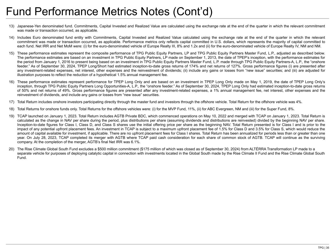 TPG | 35 Fund Performance Metrics Notes (Cont’d) 13) Japanese-Yen denominated fund. Commitments, Capital Invested and Realized Value are calculated using the exchange rate at the end of the quarter in which the relevant commitment was made or transaction occurred, as applicable. 14) Includes Euro denominated fund entity with Commitments, Capital Invested and Realized Value calculated using the exchange rate at the end of the quarter in which the relevant commitment was made or transaction occurred, as applicable. Performance metrics only reflects capital committed in U.S. dollars, which represents the majority of capital committed to each fund. Net IRR and Net MoM were: (i) for the euro-denominated vehicle of Europe Realty III, 8% and 1.2x and (ii) for the euro-denominated vehicle of Europe Realty IV, NM and NM. 15) These performance estimates represent the composite performance of TPG Public Equity Partners, LP and TPG Public Equity Partners Master Fund, L.P., adjusted as described below. The performance estimates are based on an investment in TPG Public Equity Partners, LP made on September 1, 2013, the date of TPEP’s inception, with the performance estimates for the period from January 1, 2016 to present being based on an investment in TPG Public Equity Partners Master Fund, L.P. made through TPG Public Equity Partners-A, L.P., the “onshore feeder.” As of September 30, 2024, TPEP Long/Short had estimated inception-to-date gross returns of 174% and net returns of 127%. Gross performance figures (i) are presented after any investment-related expenses, net interest, other expenses and the reinvestment of dividends; (ii) include any gains or losses from “new issue” securities; and (iii) are adjusted for illustration purposes to reflect the reduction of a hypothetical 1.5% annual management fee. 16) These performance estimates represent performance for TPEP Long Only and are based on an investment in TPEP Long Only made on May 1, 2019, the date of TPEP Long Only’s inception, through TPG Public Equity Partners Long Opportunities-A, L.P., the “onshore feeder.” As of September 30, 2024, TPEP Long Only had estimated inception-to-date gross returns of 50% and net returns of 49%. Gross performance figures are presented after any investment-related expenses, a 1% annual management fee, net interest, other expenses and the reinvestment of dividends, and include any gains or losses from “new issue” securities. 17) Total Return includes onshore investors participating directly through the master fund and investors through the offshore vehicle. Total Return for the offshore vehicle was 4%. 18) Total Returns for onshore funds only. Total Returns for the offshore vehicles were: (i) for the MVP Fund, 11%, (ii) for ABC Evergreen, NM and (iii) for the Super Fund, 8%. 19) TCAP launched on January 1, 2023. Total Return includes AGTB Private BDC, which commenced operations on May 10, 2022 and merged with TCAP on January 1, 2023. Total Return is calculated as the change in NAV per share during the period, plus distributions per share (assuming dividends and distributions are reinvested) divided by the beginning NAV per share. Inception-to-date figures for Class I, Class D, and Class S shares use the initial offering price per share as the beginning NAV. Total Return presented is for Class I and is prior to the impact of any potential upfront placement fees. An investment in TCAP is subject to a maximum upfront placement fee of 1.5% for Class D and 3.5% for Class S, which would reduce the amount of capital available for investment, if applicable. There are no upfront placement fees for Class I shares. Total Return has been annualized for periods less than or greater than one year. On July 28, 2023, TCAP completed its merger with AGTB where TCAP paid cash consideration for each share of common stock of AGTB. TCAP will continue as the surviving company. At the completion of the merger, AGTB’s final Net IRR was 6.1%. 20) The Rise Climate Global South Fund excludes a $500 million commitment ($175 million of which was closed as of September 30, 2024) from ALTÉRRA Transformation LP made to a separate vehicle for purposes of deploying catalytic capital in connection with investments located in the Global South made by the Rise Climate II Fund and the Rise Climate Global South Fund.