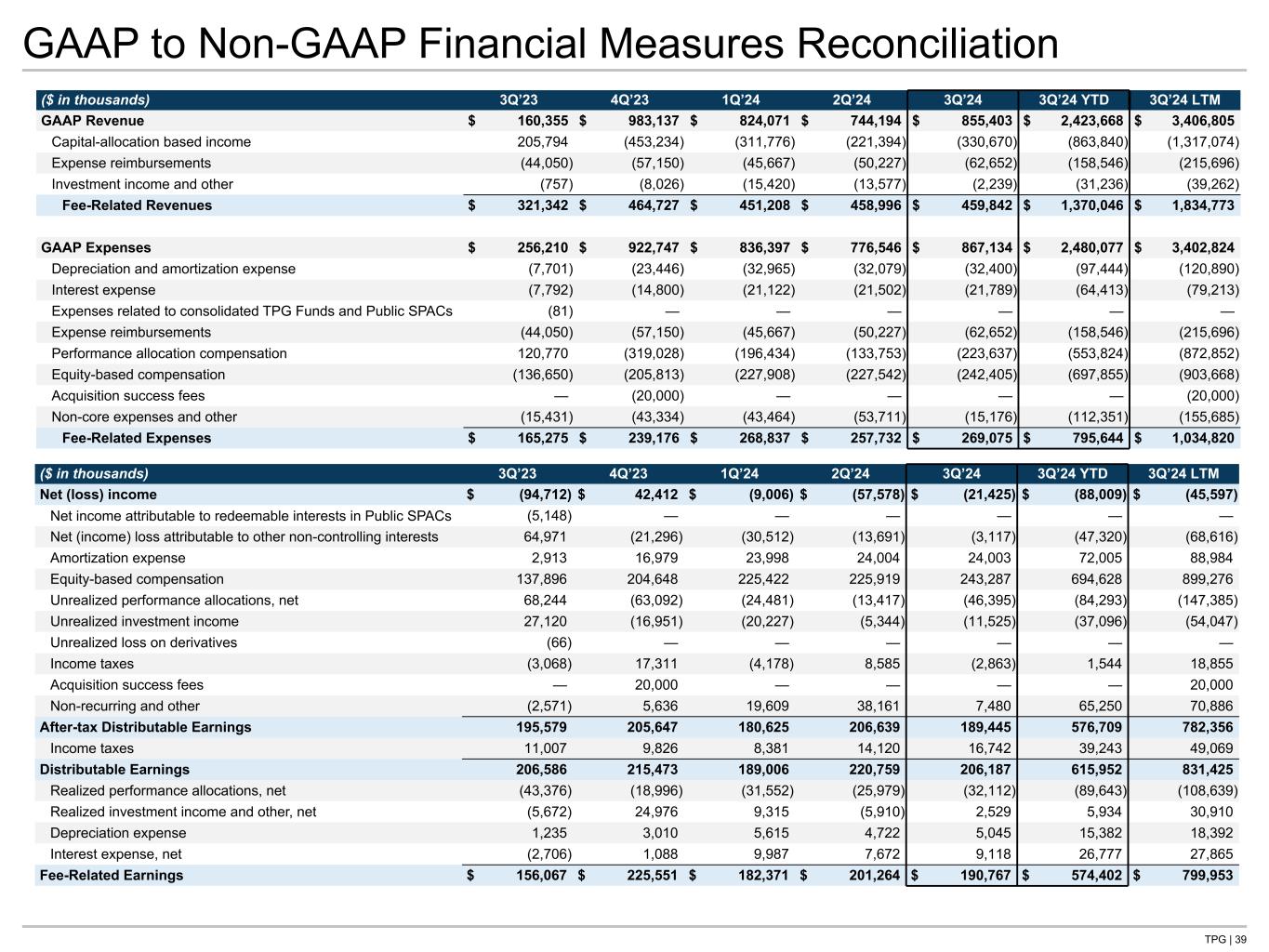 TPG | 39 GAAP to Non-GAAP Financial Measures Reconciliation ($ in thousands) 3Q’23 4Q’23 1Q’24 2Q’24 3Q’24 3Q’24 YTD 3Q’24 LTM GAAP Revenue $ 160,355 $ 983,137 $ 824,071 $ 744,194 $ 855,403 $ 2,423,668 $ 3,406,805 Capital-allocation based income 205,794 (453,234) (311,776) (221,394) (330,670) (863,840) (1,317,074) Expense reimbursements (44,050) (57,150) (45,667) (50,227) (62,652) (158,546) (215,696) Investment income and other (757) (8,026) (15,420) (13,577) (2,239) (31,236) (39,262) Fee-Related Revenues $ 321,342 $ 464,727 $ 451,208 $ 458,996 $ 459,842 $ 1,370,046 $ 1,834,773 GAAP Expenses $ 256,210 $ 922,747 $ 836,397 $ 776,546 $ 867,134 $ 2,480,077 $ 3,402,824 Depreciation and amortization expense (7,701) (23,446) (32,965) (32,079) (32,400) (97,444) (120,890) Interest expense (7,792) (14,800) (21,122) (21,502) (21,789) (64,413) (79,213) Expenses related to consolidated TPG Funds and Public SPACs (81) — — — — — — Expense reimbursements (44,050) (57,150) (45,667) (50,227) (62,652) (158,546) (215,696) Performance allocation compensation 120,770 (319,028) (196,434) (133,753) (223,637) (553,824) (872,852) Equity-based compensation (136,650) (205,813) (227,908) (227,542) (242,405) (697,855) (903,668) Acquisition success fees — (20,000) — — — — (20,000) Non-core expenses and other (15,431) (43,334) (43,464) (53,711) (15,176) (112,351) (155,685) Fee-Related Expenses $ 165,275 $ 239,176 $ 268,837 $ 257,732 $ 269,075 $ 795,644 $ 1,034,820 ($ in thousands) 3Q’23 4Q’23 1Q’24 2Q’24 3Q’24 3Q’24 YTD 3Q’24 LTM Net (loss) income $ (94,712) $ 42,412 $ (9,006) $ (57,578) $ (21,425) $ (88,009) $ (45,597) Net income attributable to redeemable interests in Public SPACs (5,148) — — — — — — Net (income) loss attributable to other non-controlling interests 64,971 (21,296) (30,512) (13,691) (3,117) (47,320) (68,616) Amortization expense 2,913 16,979 23,998 24,004 24,003 72,005 88,984 Equity-based compensation 137,896 204,648 225,422 225,919 243,287 694,628 899,276 Unrealized performance allocations, net 68,244 (63,092) (24,481) (13,417) (46,395) (84,293) (147,385) Unrealized investment income 27,120 (16,951) (20,227) (5,344) (11,525) (37,096) (54,047) Unrealized loss on derivatives (66) — — — — — — Income taxes (3,068) 17,311 (4,178) 8,585 (2,863) 1,544 18,855 Acquisition success fees — 20,000 — — — — 20,000 Non-recurring and other (2,571) 5,636 19,609 38,161 7,480 65,250 70,886 After-tax Distributable Earnings 195,579 205,647 180,625 206,639 189,445 576,709 782,356 Income taxes 11,007 9,826 8,381 14,120 16,742 39,243 49,069 Distributable Earnings 206,586 215,473 189,006 220,759 206,187 615,952 831,425 Realized performance allocations, net (43,376) (18,996) (31,552) (25,979) (32,112) (89,643) (108,639) Realized investment income and other, net (5,672) 24,976 9,315 (5,910) 2,529 5,934 30,910 Depreciation expense 1,235 3,010 5,615 4,722 5,045 15,382 18,392 Interest expense, net (2,706) 1,088 9,987 7,672 9,118 26,777 27,865 Fee-Related Earnings $ 156,067 $ 225,551 $ 182,371 $ 201,264 $ 190,767 $ 574,402 $ 799,953