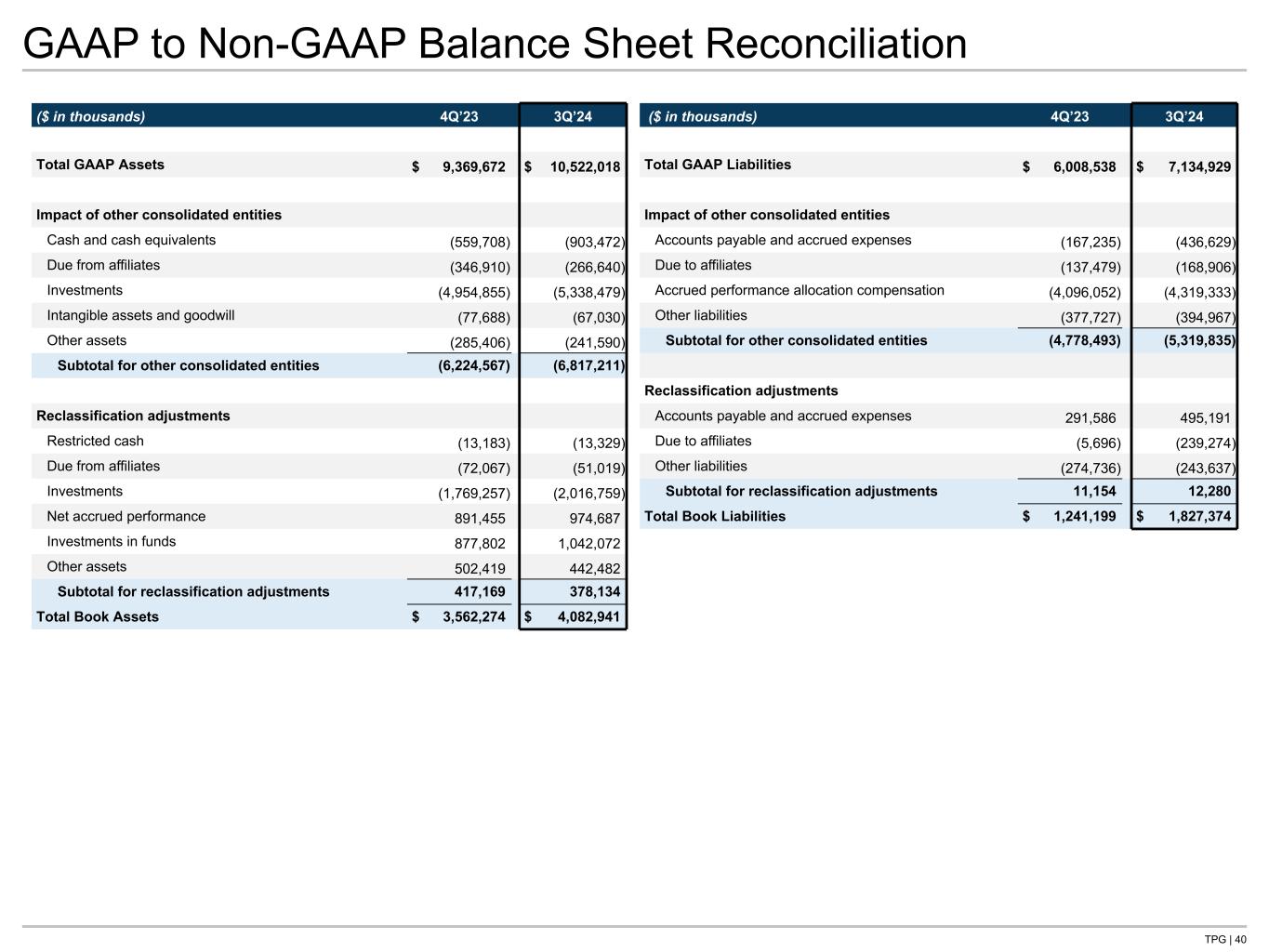 TPG | 40 GAAP to Non-GAAP Balance Sheet Reconciliation ($ in thousands) 4Q’23 3Q’24 Total GAAP Assets $ 9,369,672 $ 10,522,018 Impact of other consolidated entities Cash and cash equivalents (559,708) (903,472) Due from affiliates (346,910) (266,640) Investments (4,954,855) (5,338,479) Intangible assets and goodwill (77,688) (67,030) Other assets (285,406) (241,590) Subtotal for other consolidated entities (6,224,567) (6,817,211) Reclassification adjustments Restricted cash (13,183) (13,329) Due from affiliates (72,067) (51,019) Investments (1,769,257) (2,016,759) Net accrued performance 891,455 974,687 Investments in funds 877,802 1,042,072 Other assets 502,419 442,482 Subtotal for reclassification adjustments 417,169 378,134 Total Book Assets $ 3,562,274 $ 4,082,941 ($ in thousands) 4Q’23 3Q’24 Total GAAP Liabilities $ 6,008,538 $ 7,134,929 Impact of other consolidated entities Accounts payable and accrued expenses (167,235) (436,629) Due to affiliates (137,479) (168,906) Accrued performance allocation compensation (4,096,052) (4,319,333) Other liabilities (377,727) (394,967) Subtotal for other consolidated entities (4,778,493) (5,319,835) Reclassification adjustments Accounts payable and accrued expenses 291,586 495,191 Due to affiliates (5,696) (239,274) Other liabilities (274,736) (243,637) Subtotal for reclassification adjustments 11,154 12,280 Total Book Liabilities $ 1,241,199 $ 1,827,374