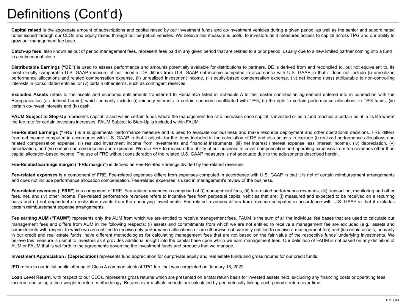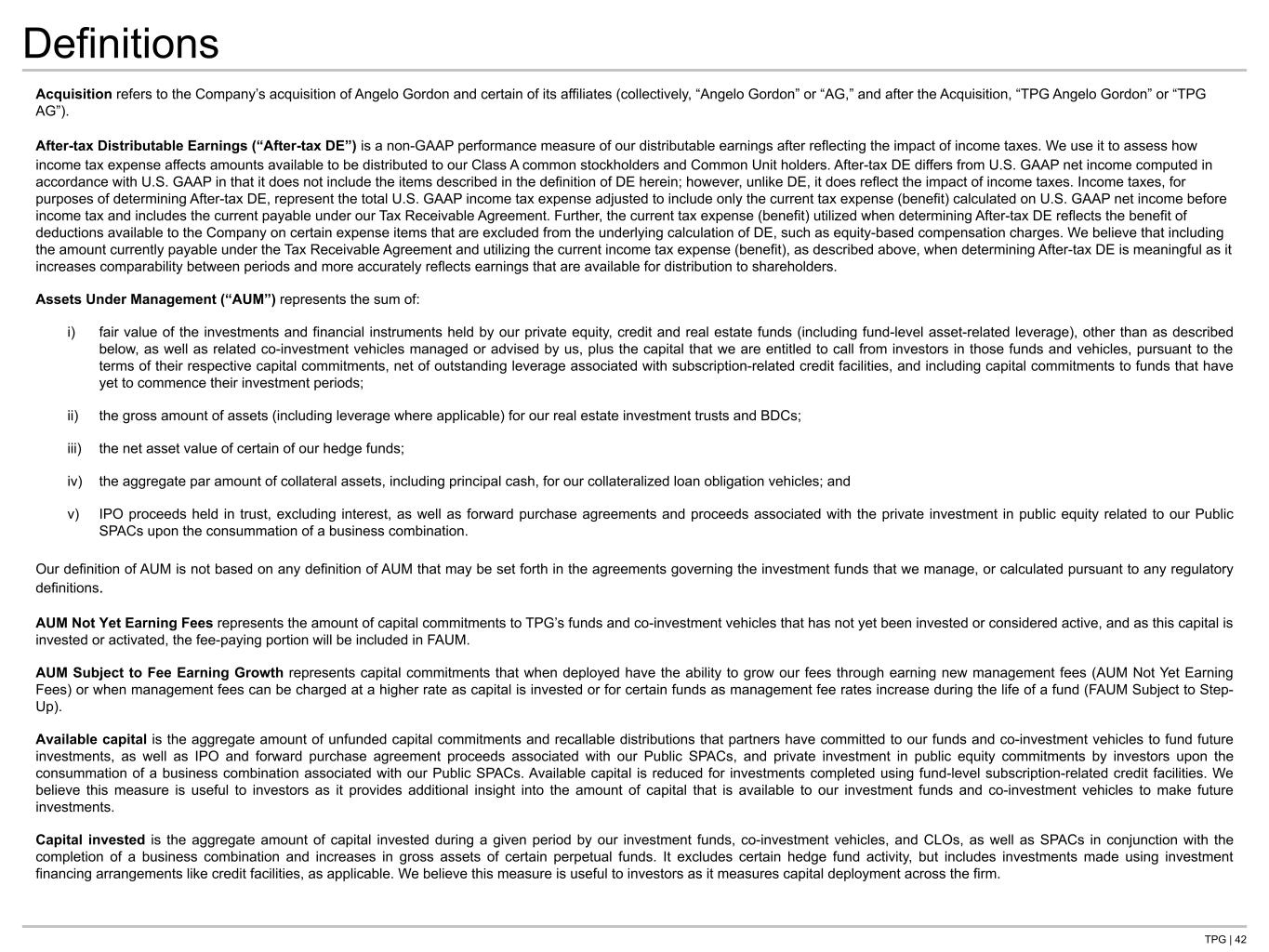 TPG | 42 Definitions Acquisition refers to the Company’s acquisition of Angelo Gordon and certain of its affiliates (collectively, “Angelo Gordon” or “AG,” and after the Acquisition, “TPG Angelo Gordon” or “TPG AG”). After-tax Distributable Earnings (“After-tax DE”) is a non-GAAP performance measure of our distributable earnings after reflecting the impact of income taxes. We use it to assess how income tax expense affects amounts available to be distributed to our Class A common stockholders and Common Unit holders. After-tax DE differs from U.S. GAAP net income computed in accordance with U.S. GAAP in that it does not include the items described in the definition of DE herein; however, unlike DE, it does reflect the impact of income taxes. Income taxes, for purposes of determining After-tax DE, represent the total U.S. GAAP income tax expense adjusted to include only the current tax expense (benefit) calculated on U.S. GAAP net income before income tax and includes the current payable under our Tax Receivable Agreement. Further, the current tax expense (benefit) utilized when determining After-tax DE reflects the benefit of deductions available to the Company on certain expense items that are excluded from the underlying calculation of DE, such as equity-based compensation charges. We believe that including the amount currently payable under the Tax Receivable Agreement and utilizing the current income tax expense (benefit), as described above, when determining After-tax DE is meaningful as it increases comparability between periods and more accurately reflects earnings that are available for distribution to shareholders. Assets Under Management (“AUM”) represents the sum of: i) fair value of the investments and financial instruments held by our private equity, credit and real estate funds (including fund-level asset-related leverage), other than as described below, as well as related co-investment vehicles managed or advised by us, plus the capital that we are entitled to call from investors in those funds and vehicles, pursuant to the terms of their respective capital commitments, net of outstanding leverage associated with subscription-related credit facilities, and including capital commitments to funds that have yet to commence their investment periods; ii) the gross amount of assets (including leverage where applicable) for our real estate investment trusts and BDCs; iii) the net asset value of certain of our hedge funds; iv) the aggregate par amount of collateral assets, including principal cash, for our collateralized loan obligation vehicles; and v) IPO proceeds held in trust, excluding interest, as well as forward purchase agreements and proceeds associated with the private investment in public equity related to our Public SPACs upon the consummation of a business combination. Our definition of AUM is not based on any definition of AUM that may be set forth in the agreements governing the investment funds that we manage, or calculated pursuant to any regulatory definitions. AUM Not Yet Earning Fees represents the amount of capital commitments to TPG’s funds and co-investment vehicles that has not yet been invested or considered active, and as this capital is invested or activated, the fee-paying portion will be included in FAUM. AUM Subject to Fee Earning Growth represents capital commitments that when deployed have the ability to grow our fees through earning new management fees (AUM Not Yet Earning Fees) or when management fees can be charged at a higher rate as capital is invested or for certain funds as management fee rates increase during the life of a fund (FAUM Subject to Step- Up). Available capital is the aggregate amount of unfunded capital commitments and recallable distributions that partners have committed to our funds and co-investment vehicles to fund future investments, as well as IPO and forward purchase agreement proceeds associated with our Public SPACs, and private investment in public equity commitments by investors upon the consummation of a business combination associated with our Public SPACs. Available capital is reduced for investments completed using fund-level subscription-related credit facilities. We believe this measure is useful to investors as it provides additional insight into the amount of capital that is available to our investment funds and co-investment vehicles to make future investments. Capital invested is the aggregate amount of capital invested during a given period by our investment funds, co-investment vehicles, and CLOs, as well as SPACs in conjunction with the completion of a business combination and increases in gross assets of certain perpetual funds. It excludes certain hedge fund activity, but includes investments made using investment financing arrangements like credit facilities, as applicable. We believe this measure is useful to investors as it measures capital deployment across the firm.