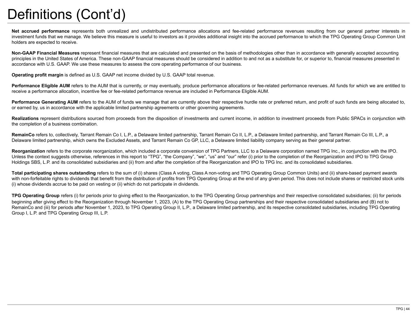 TPG | 44 Definitions (Cont’d) Net accrued performance represents both unrealized and undistributed performance allocations and fee-related performance revenues resulting from our general partner interests in investment funds that we manage. We believe this measure is useful to investors as it provides additional insight into the accrued performance to which the TPG Operating Group Common Unit holders are expected to receive. Non-GAAP Financial Measures represent financial measures that are calculated and presented on the basis of methodologies other than in accordance with generally accepted accounting principles in the United States of America. These non-GAAP financial measures should be considered in addition to and not as a substitute for, or superior to, financial measures presented in accordance with U.S. GAAP. We use these measures to assess the core operating performance of our business. Operating profit margin is defined as U.S. GAAP net income divided by U.S. GAAP total revenue. Performance Eligible AUM refers to the AUM that is currently, or may eventually, produce performance allocations or fee-related performance revenues. All funds for which we are entitled to receive a performance allocation, incentive fee or fee-related performance revenue are included in Performance Eligible AUM. Performance Generating AUM refers to the AUM of funds we manage that are currently above their respective hurdle rate or preferred return, and profit of such funds are being allocated to, or earned by, us in accordance with the applicable limited partnership agreements or other governing agreements. Realizations represent distributions sourced from proceeds from the disposition of investments and current income, in addition to investment proceeds from Public SPACs in conjunction with the completion of a business combination. RemainCo refers to, collectively, Tarrant Remain Co I, L.P., a Delaware limited partnership, Tarrant Remain Co II, L.P., a Delaware limited partnership, and Tarrant Remain Co III, L.P., a Delaware limited partnership, which owns the Excluded Assets, and Tarrant Remain Co GP, LLC, a Delaware limited liability company serving as their general partner. Reorganization refers to the corporate reorganization, which included a corporate conversion of TPG Partners, LLC to a Delaware corporation named TPG Inc., in conjunction with the IPO. Unless the context suggests otherwise, references in this report to “TPG”, “the Company”, “we”, “us” and “our” refer (i) prior to the completion of the Reorganization and IPO to TPG Group Holdings SBS, L.P. and its consolidated subsidiaries and (ii) from and after the completion of the Reorganization and IPO to TPG Inc. and its consolidated subsidiaries. Total participating shares outstanding refers to the sum of (i) shares (Class A voting, Class A non-voting and TPG Operating Group Common Units) and (ii) share-based payment awards with non-forfeitable rights to dividends that benefit from the distribution of profits from TPG Operating Group at the end of any given period. This does not include shares or restricted stock units (i) whose dividends accrue to be paid on vesting or (ii) which do not participate in dividends. TPG Operating Group refers (i) for periods prior to giving effect to the Reorganization, to the TPG Operating Group partnerships and their respective consolidated subsidiaries; (ii) for periods beginning after giving effect to the Reorganization through November 1, 2023, (A) to the TPG Operating Group partnerships and their respective consolidated subsidiaries and (B) not to RemainCo and (iii) for periods after November 1, 2023, to TPG Operating Group II, L.P., a Delaware limited partnership, and its respective consolidated subsidiaries, including TPG Operating Group I, L.P. and TPG Operating Group III, L.P.