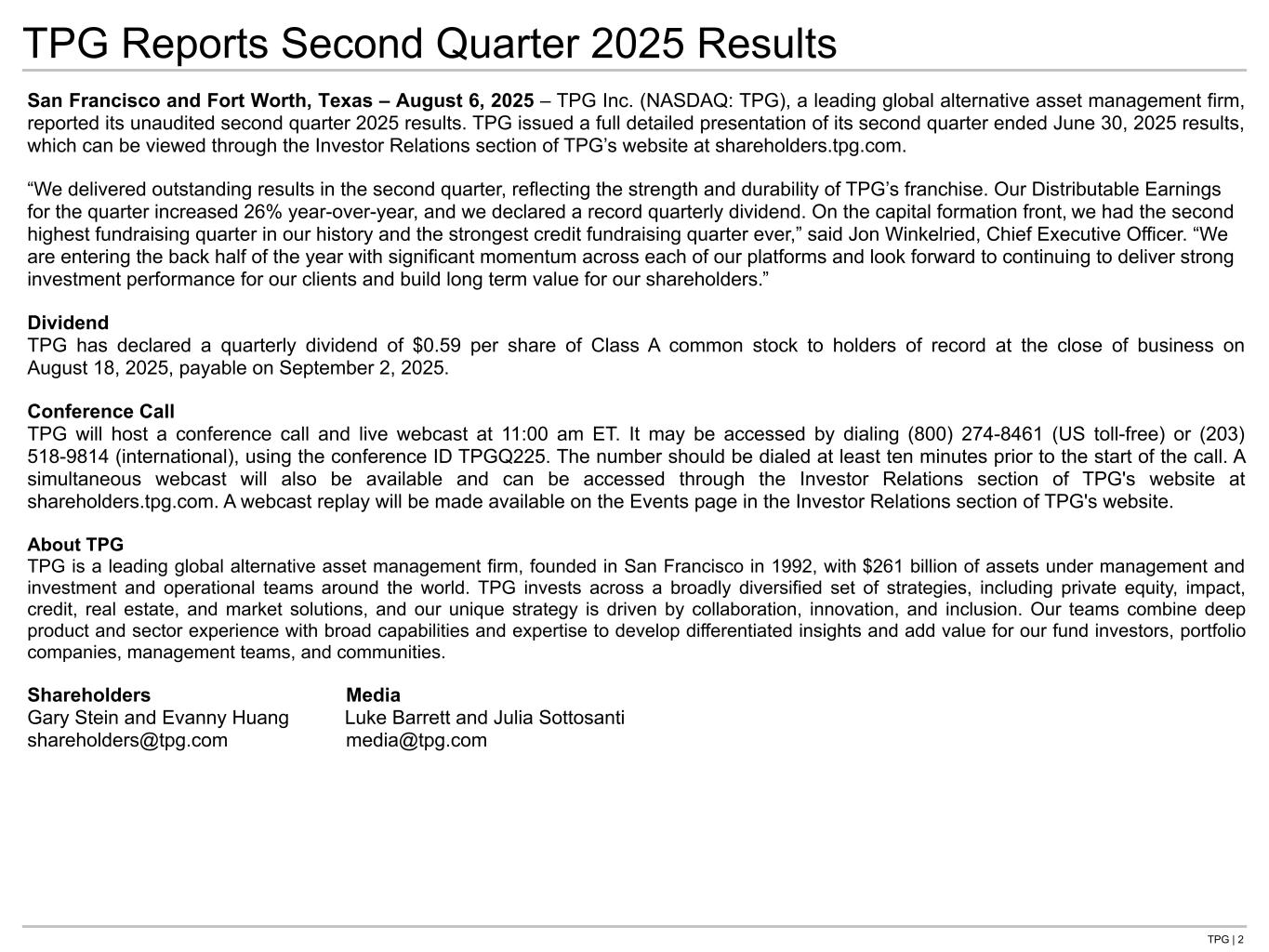 TPG | 2 San Francisco and Fort Worth, Texas – August 6, 2025 – TPG Inc. (NASDAQ: TPG), a leading global alternative asset management firm, reported its unaudited second quarter 2025 results. TPG issued a full detailed presentation of its second quarter ended June 30, 2025 results, which can be viewed through the Investor Relations section of TPG’s website at shareholders.tpg.com. “We delivered outstanding results in the second quarter, reflecting the strength and durability of TPG’s franchise. Our Distributable Earnings for the quarter increased 26% year-over-year, and we declared a record quarterly dividend. On the capital formation front, we had the second highest fundraising quarter in our history and the strongest credit fundraising quarter ever,” said Jon Winkelried, Chief Executive Officer. “We are entering the back half of the year with significant momentum across each of our platforms and look forward to continuing to deliver strong investment performance for our clients and build long term value for our shareholders.” Dividend TPG has declared a quarterly dividend of $0.59 per share of Class A common stock to holders of record at the close of business on August 18, 2025, payable on September 2, 2025. Conference Call TPG will host a conference call and live webcast at 11:00 am ET. It may be accessed by dialing (800) 274-8461 (US toll-free) or (203) 518-9814 (international), using the conference ID TPGQ225. The number should be dialed at least ten minutes prior to the start of the call. A simultaneous webcast will also be available and can be accessed through the Investor Relations section of TPG's website at shareholders.tpg.com. A webcast replay will be made available on the Events page in the Investor Relations section of TPG's website. About TPG TPG is a leading global alternative asset management firm, founded in San Francisco in 1992, with $261 billion of assets under management and investment and operational teams around the world. TPG invests across a broadly diversified set of strategies, including private equity, impact, credit, real estate, and market solutions, and our unique strategy is driven by collaboration, innovation, and inclusion. Our teams combine deep product and sector experience with broad capabilities and expertise to develop differentiated insights and add value for our fund investors, portfolio companies, management teams, and communities. Shareholders Media Gary Stein and Evanny Huang Luke Barrett and Julia Sottosanti shareholders@tpg.com media@tpg.com TPG Reports Second Quarter 2025 Results