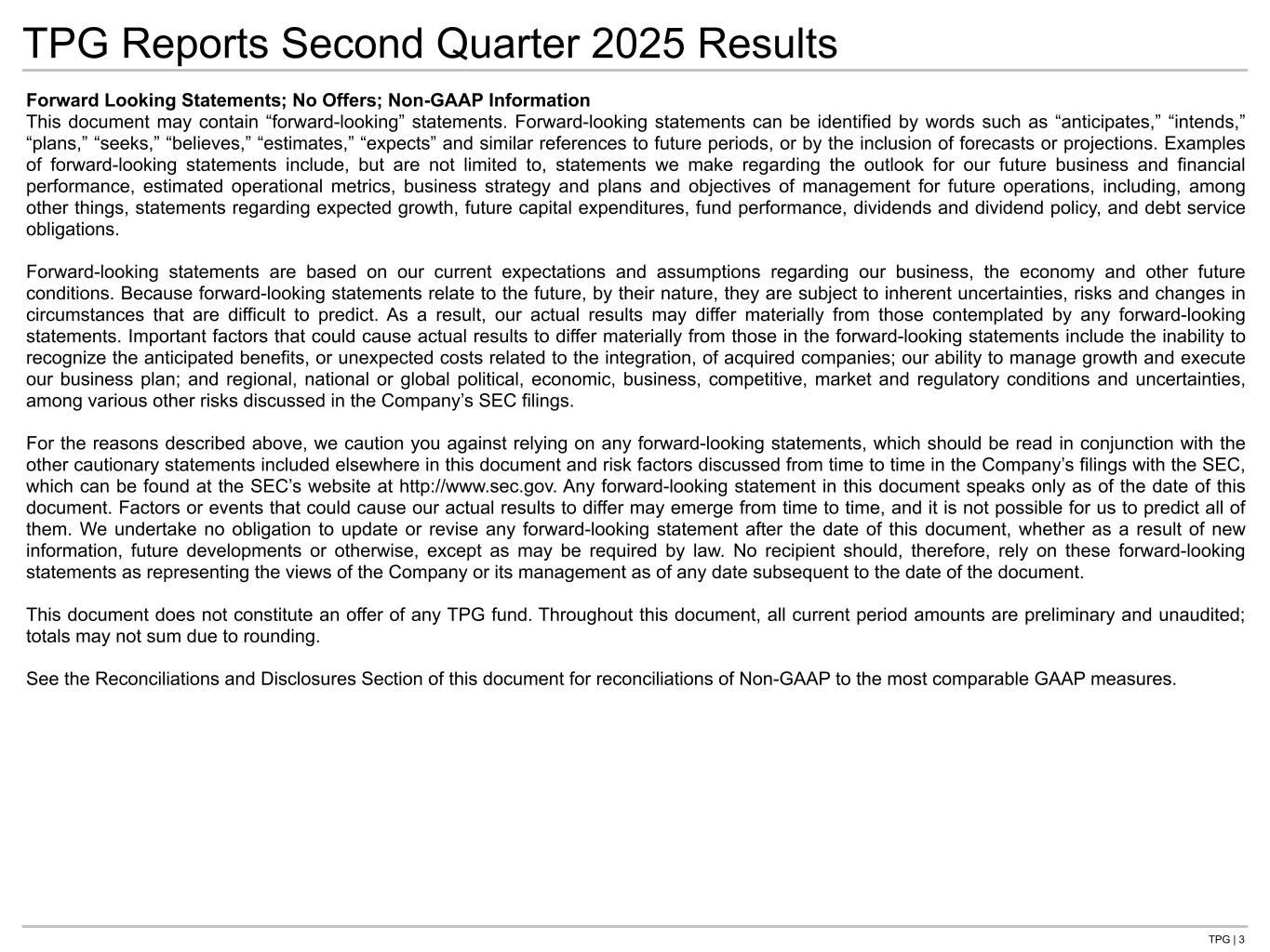 TPG | 3 TPG Reports Second Quarter 2025 Results Forward Looking Statements; No Offers; Non-GAAP Information This document may contain “forward-looking” statements. Forward-looking statements can be identified by words such as “anticipates,” “intends,” “plans,” “seeks,” “believes,” “estimates,” “expects” and similar references to future periods, or by the inclusion of forecasts or projections. Examples of forward-looking statements include, but are not limited to, statements we make regarding the outlook for our future business and financial performance, estimated operational metrics, business strategy and plans and objectives of management for future operations, including, among other things, statements regarding expected growth, future capital expenditures, fund performance, dividends and dividend policy, and debt service obligations. Forward-looking statements are based on our current expectations and assumptions regarding our business, the economy and other future conditions. Because forward-looking statements relate to the future, by their nature, they are subject to inherent uncertainties, risks and changes in circumstances that are difficult to predict. As a result, our actual results may differ materially from those contemplated by any forward-looking statements. Important factors that could cause actual results to differ materially from those in the forward-looking statements include the inability to recognize the anticipated benefits, or unexpected costs related to the integration, of acquired companies; our ability to manage growth and execute our business plan; and regional, national or global political, economic, business, competitive, market and regulatory conditions and uncertainties, among various other risks discussed in the Company’s SEC filings. For the reasons described above, we caution you against relying on any forward-looking statements, which should be read in conjunction with the other cautionary statements included elsewhere in this document and risk factors discussed from time to time in the Company’s filings with the SEC, which can be found at the SEC’s website at http://www.sec.gov. Any forward-looking statement in this document speaks only as of the date of this document. Factors or events that could cause our actual results to differ may emerge from time to time, and it is not possible for us to predict all of them. We undertake no obligation to update or revise any forward-looking statement after the date of this document, whether as a result of new information, future developments or otherwise, except as may be required by law. No recipient should, therefore, rely on these forward-looking statements as representing the views of the Company or its management as of any date subsequent to the date of the document. This document does not constitute an offer of any TPG fund. Throughout this document, all current period amounts are preliminary and unaudited; totals may not sum due to rounding. See the Reconciliations and Disclosures Section of this document for reconciliations of Non-GAAP to the most comparable GAAP measures.