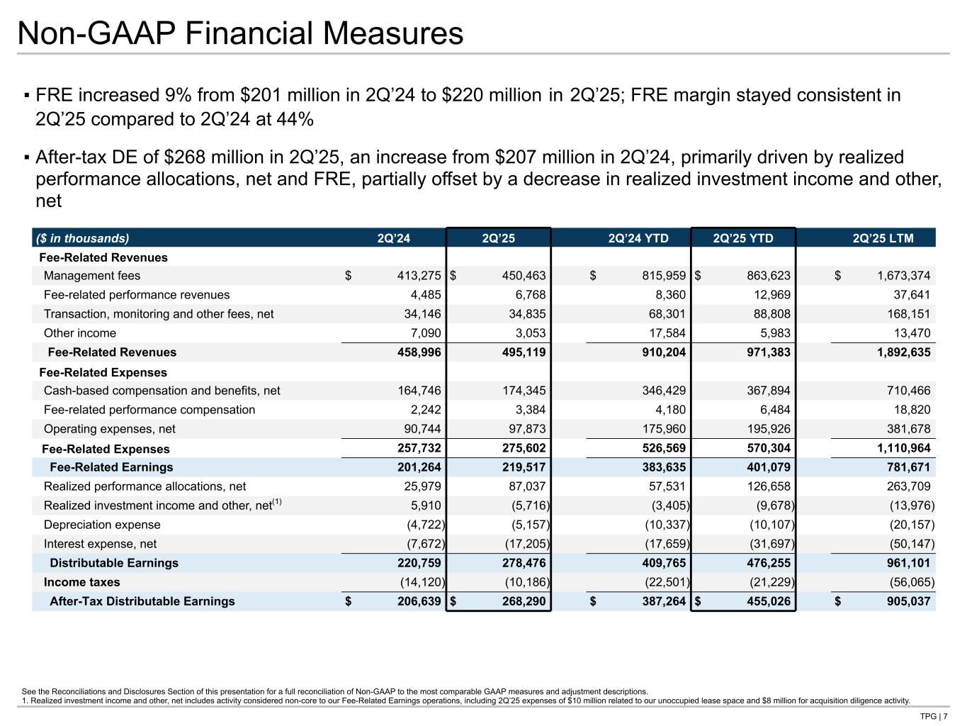 TPG | 6 Operating Metrics ($B) Non-GAAP Financial Measures ($M) Second Quarter and Year to Date Highlights 2Q’24 2Q’25 2Q’24 YTD 2Q’25 YTD Fee-Related Revenues (“FRR”) $459 $495 $910 $971 Fee-Related Earnings (“FRE”) 201 220 384 401 Realized Performance Allocations, Net 26 87 58 127 After-Tax Distributable Earnings (“After-tax DE”) 207 268 387 455 2Q’24 4Q’24 1Q’25 2Q’25 Assets Under Management (“AUM”) $229.0 $245.9 $250.6 $261.3 Fee-Earning Assets Under Management (“FAUM”) 137.0 141.3 142.8 146.4 Net Accrued Performance 0.9 1.0 1.0 1.0 Available Capital 53.2 57.6 57.0 62.5 2Q’24 2Q’25 2Q’24 YTD 2Q’25 YTD Capital Raised $6.3 $11.3 $11.0 $17.2 Capital Invested 7.6 10.4 14.1 17.7 Realizations 5.4 6.5 10.2 10.8 ▪ 2Q’25 FRR of $495 million increased 8% versus 2Q’24, with 2Q’25 FRE of $220 million and 2Q’25 After-tax DE of $268 million ▪ Total AUM of $261 billion, up 14% in the last twelve months; FAUM of $146 billion, up 7% over the same period See the Reconciliations and Disclosures Section of this presentation for a full reconciliation of Non-GAAP to the most comparable GAAP measures and adjustment descriptions. Tie to next page Tie to OM section