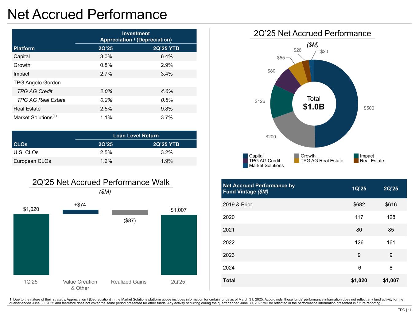 TPG | 11 $500 $200 $126 $80 $55 $26 $20 Net Accrued Performance Net Accrued Performance by Fund Vintage ($M) 1Q’25 2Q’25 2019 & Prior $682 $616 2020 117 128 2021 80 85 2022 126 161 2023 9 9 2024 6 8 Total $1,020 $1,007 2Q’25 Net Accrued Performance Total $1.0B ($M) $1,020 +$74 ($87) $1,007 1Q’25 Value Creation & Other Realized Gains 2Q’25 2Q’25 Net Accrued Performance Walk ($M) Investment Appreciation / (Depreciation) Platform 2Q’25 2Q’25 YTD Capital 3.0% 6.4% Growth 0.8% 2.9% Impact 2.7% 3.4% TPG Angelo Gordon TPG AG Credit 2.0% 4.6% TPG AG Real Estate 0.2% 0.8% Real Estate 2.5% 9.8% Market Solutions(1) 1.1% 3.7% Loan Level Return CLOs 2Q’25 2Q’25 YTD U.S. CLOs 2.5% 3.2% European CLOs 1.2% 1.9% 1. Due to the nature of their strategy, Appreciation / (Depreciation) in the Market Solutions platform above includes information for certain funds as of March 31, 2025. Accordingly, those funds’ performance information does not reflect any fund activity for the quarter ended June 30, 2025 and therefore does not cover the same period presented for other funds. Any activity occurring during the quarter ended June 30, 2025 will be reflected in the performance information presented in future reporting. Capital Growth Impact TPG AG Credit TPG AG Real Estate Real Estate Market Solutions
